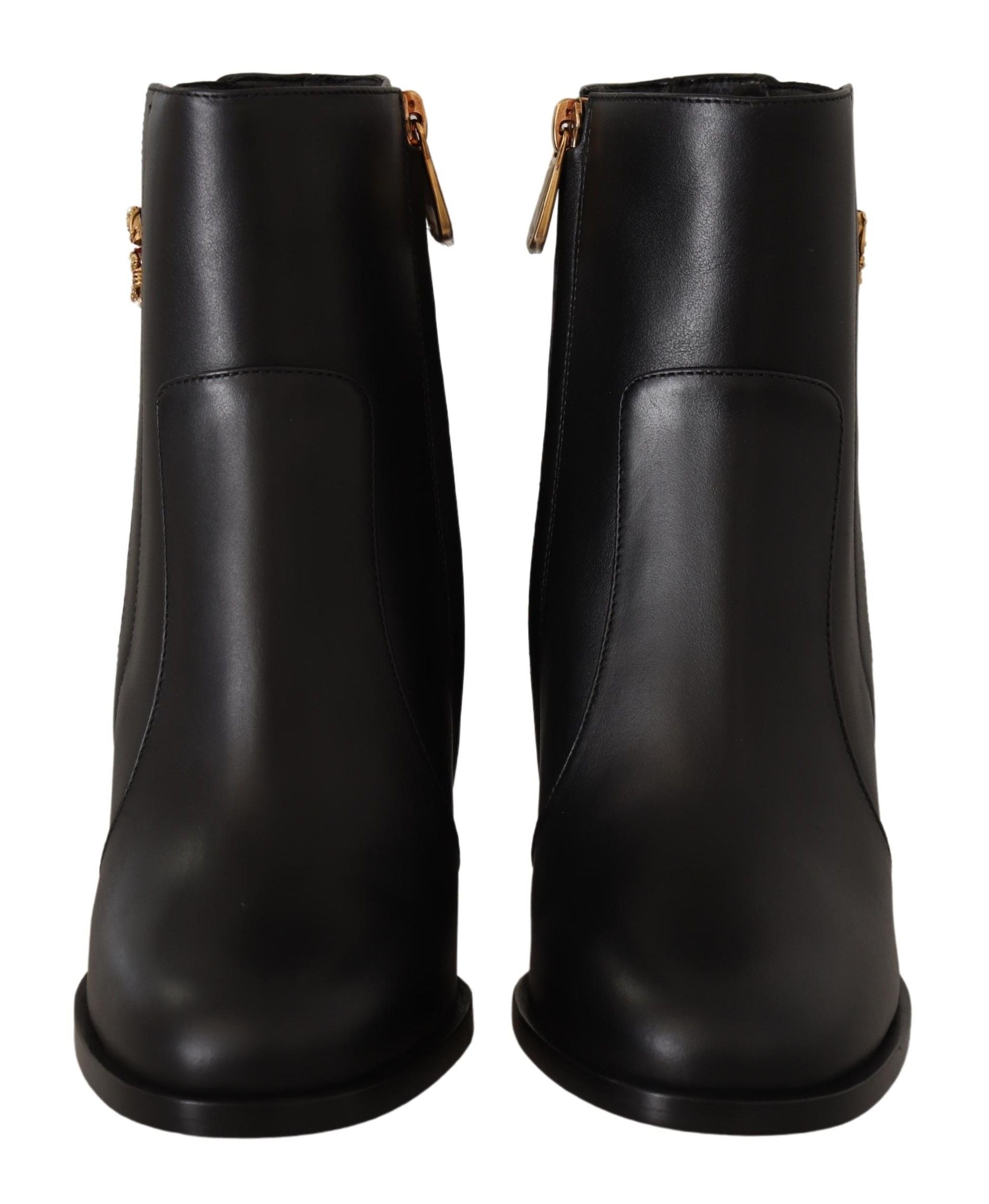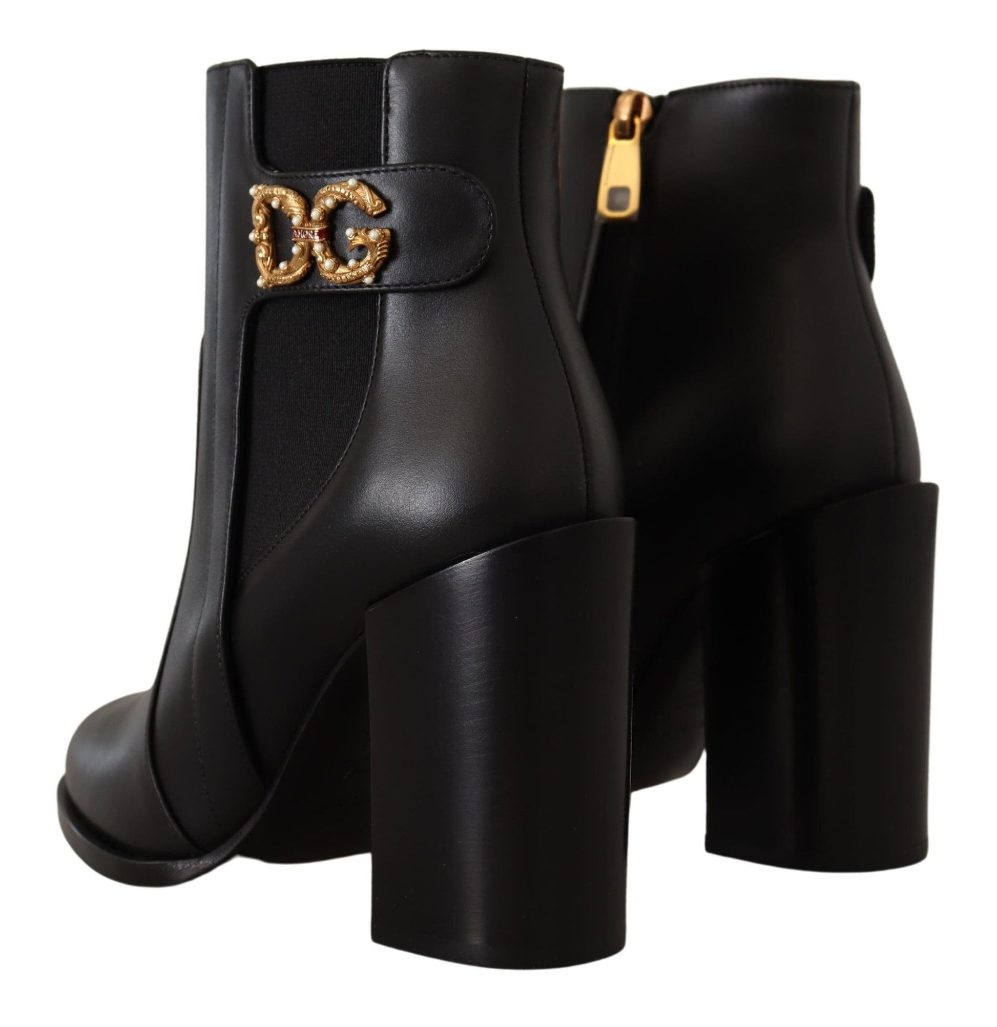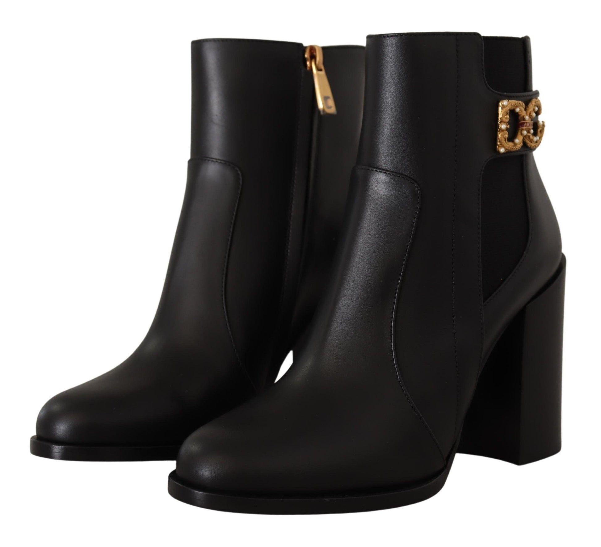 Step into luxury with these stunning ankle boots by Dolce & Gabbana. Crafted with a composition that blends elastane, leather, and PL for a comfortable yet durable fit, these boots are not only a stylish addition to any wardrobe but also a testament to Italian craftsmanship. The sleek black design is accentuated by an opulent gold DG pearl on the side, capturing the essence of elegance. The convenient zipper opening and stretch band ensure a snug fit, making them perfect for any sophisticated outing.