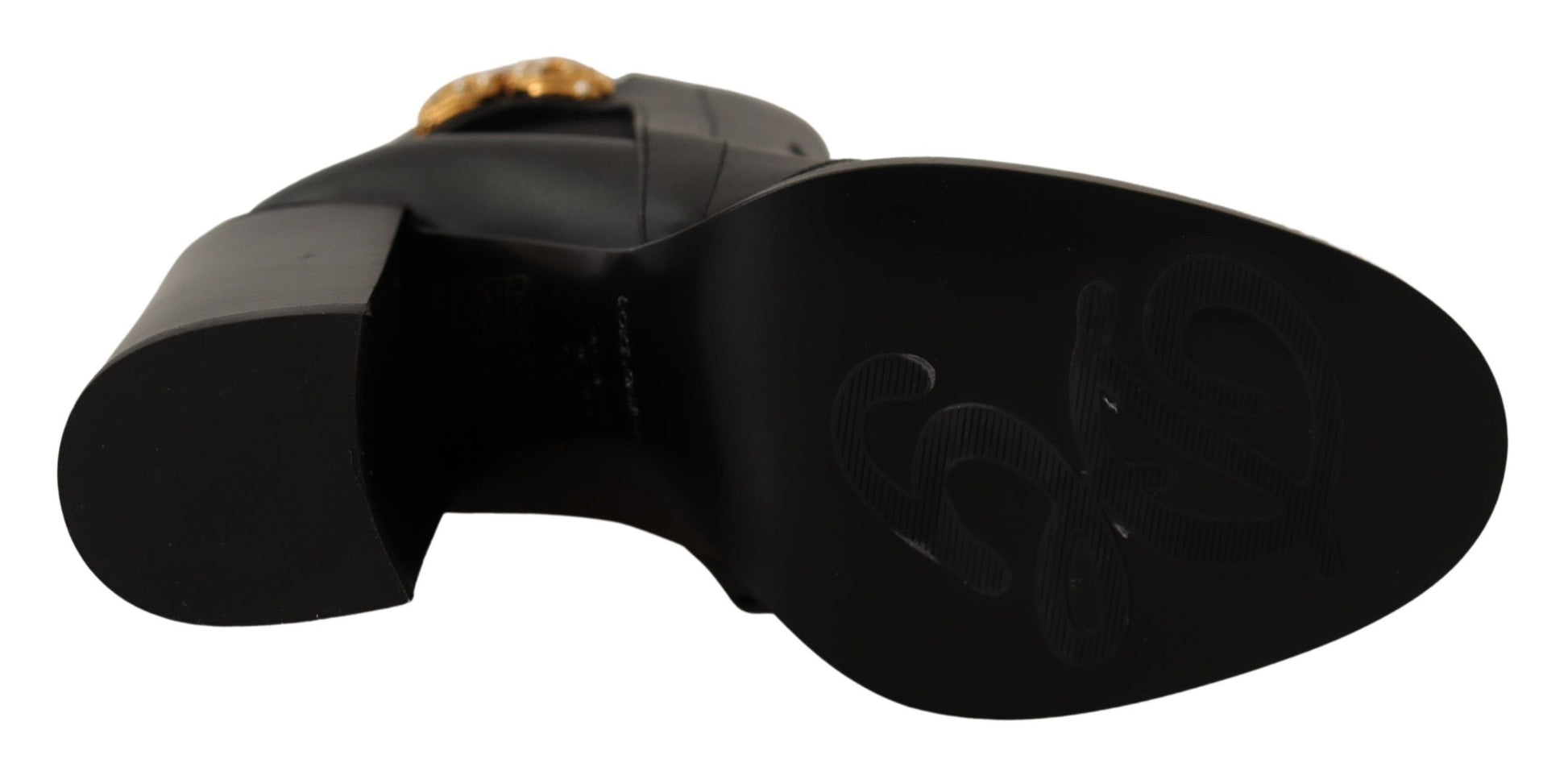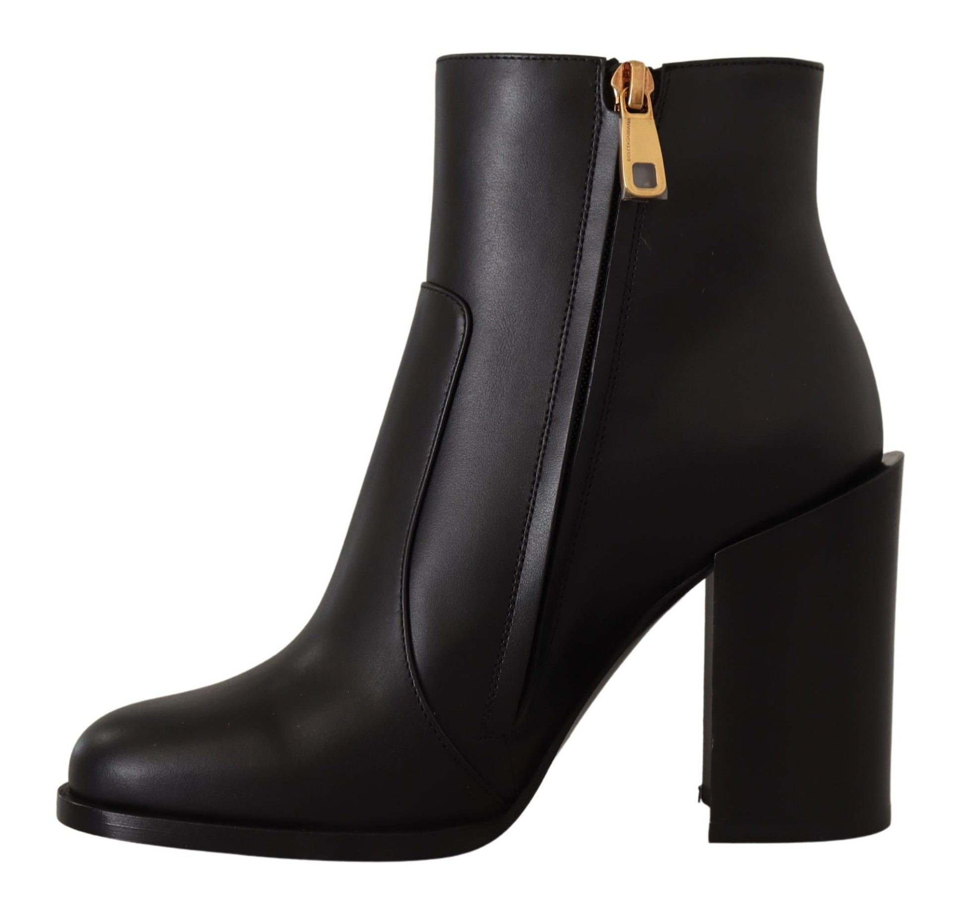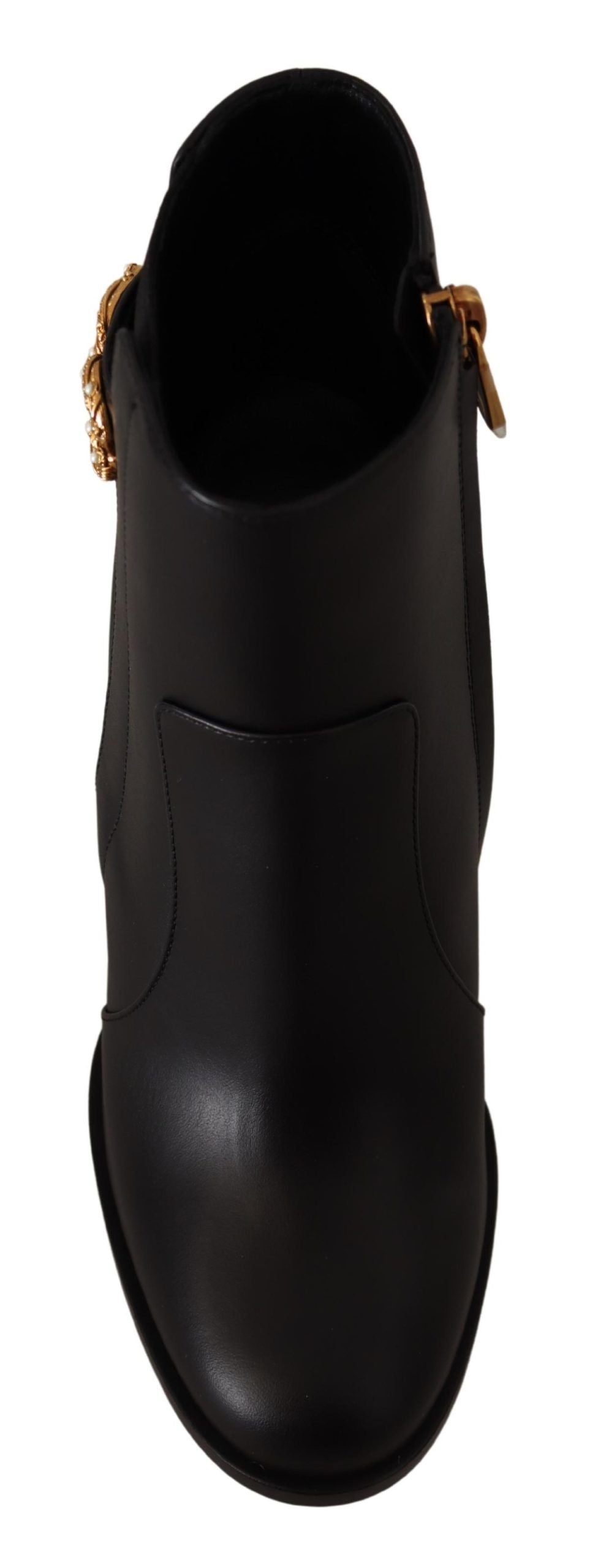Step into luxury with these stunning ankle boots by Dolce & Gabbana. Crafted with a composition that blends elastane, leather, and PL for a comfortable yet durable fit, these boots are not only a stylish addition to any wardrobe but also a testament to Italian craftsmanship. The sleek black design is accentuated by an opulent gold DG pearl on the side, capturing the essence of elegance. The convenient zipper opening and stretch band ensure a snug fit, making them perfect for any sophisticated outing.