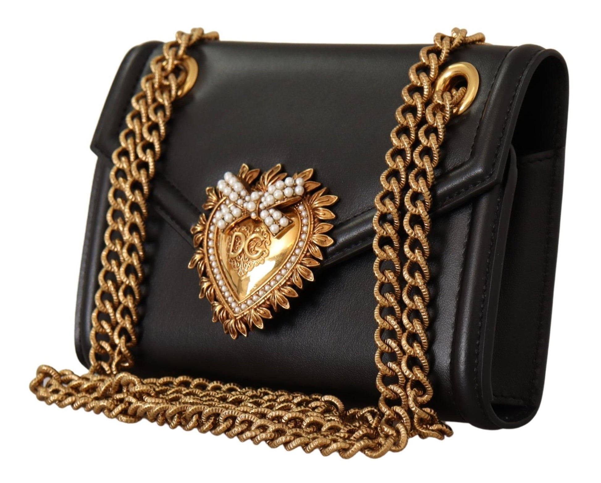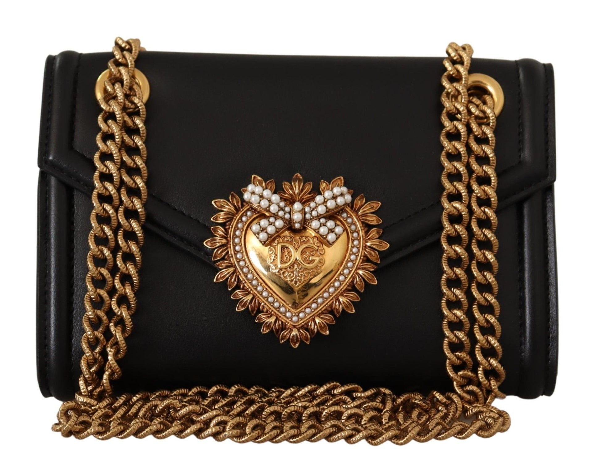 Indulge in the epitome of Italian luxury with this exquisite shoulder bag by Dolce & Gabbana. Part of the coveted DEVOTION collection, this bag is a perfect blend of style and grace, crafted from the finest leather. The sleek black hue, complemented by opulent gold metal detailing and a bejeweled heart with pearl inlay adds a noble charm that is undeniably Dolce & Gabbana. With its practical concealed press-stud fastening and luxurious black leather lining, it’s both chic and functional. Ideal for elevating any outfit, it comfortably fits over your shoulder to escort you on all your elegant outings.