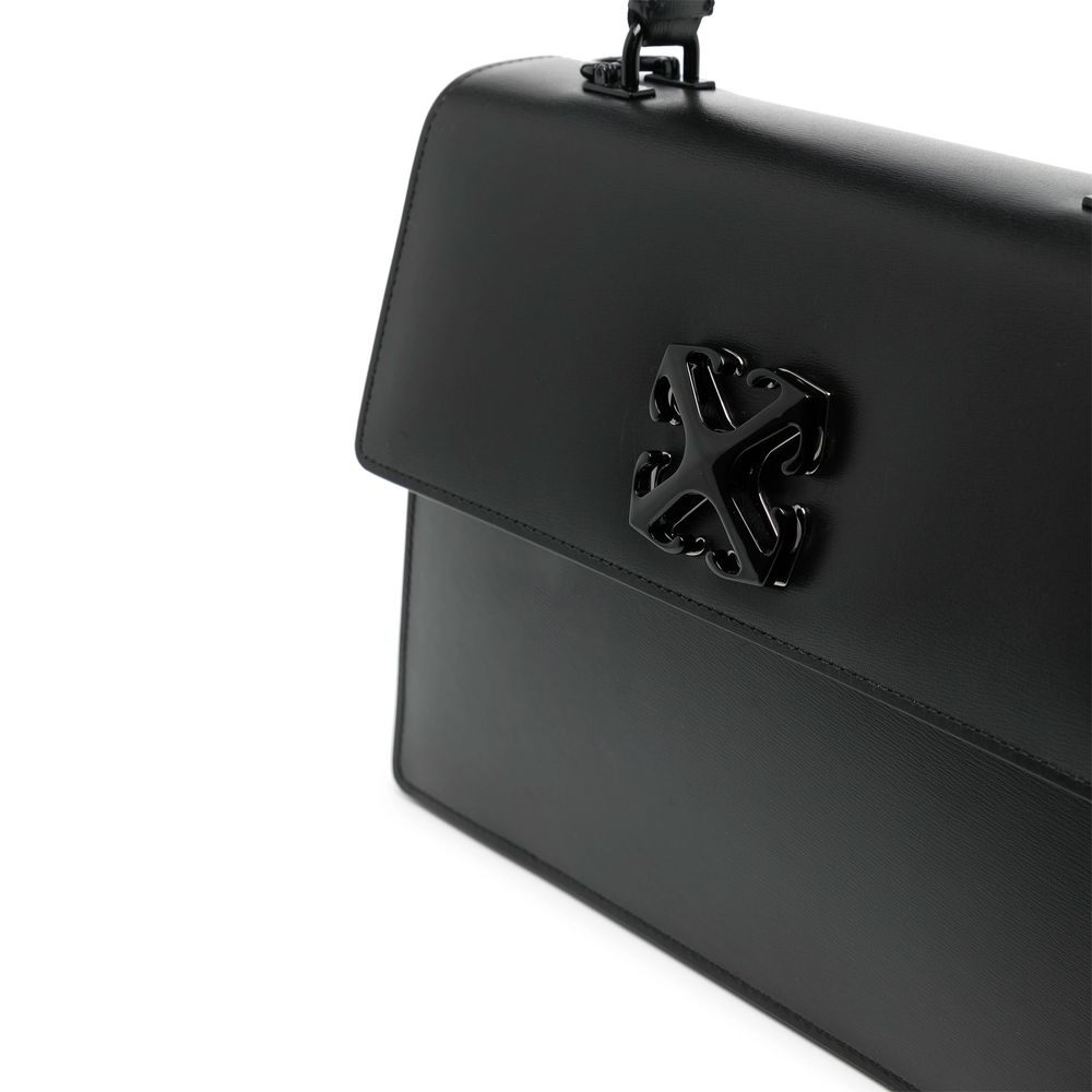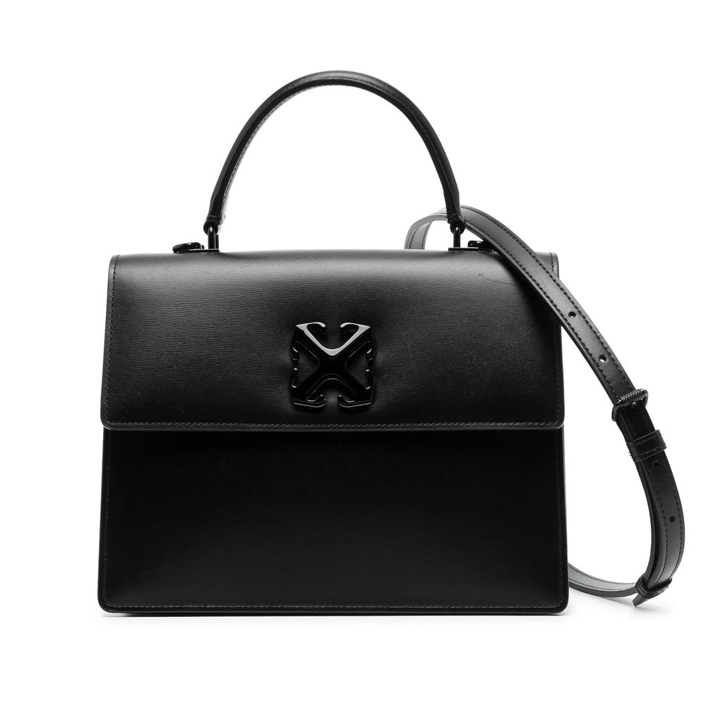 Off-White black leather jitney bag, front magnetic opening, tone-on-tone logo. 24×20 cm