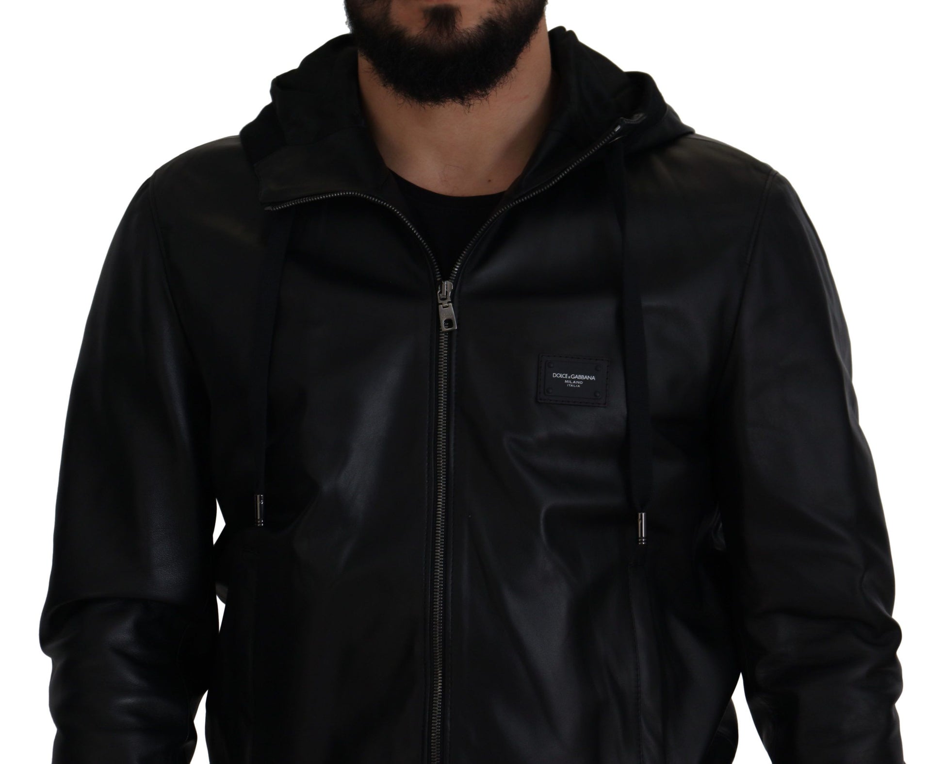 Enhance your wardrobe with the epitome of luxury and style. This sleek black leather bomber jacket by Dolce & Gabbana is designed to make a statement. A modern silhouette meets the elegance of premium leather, featuring a comfortable hood and accented with a distinctive logo plaque on the chest. Made with meticulous Italian craftsmanship, this jacket is perfect for those who appreciate fashion that marries functionality with a luxe aesthetic.
