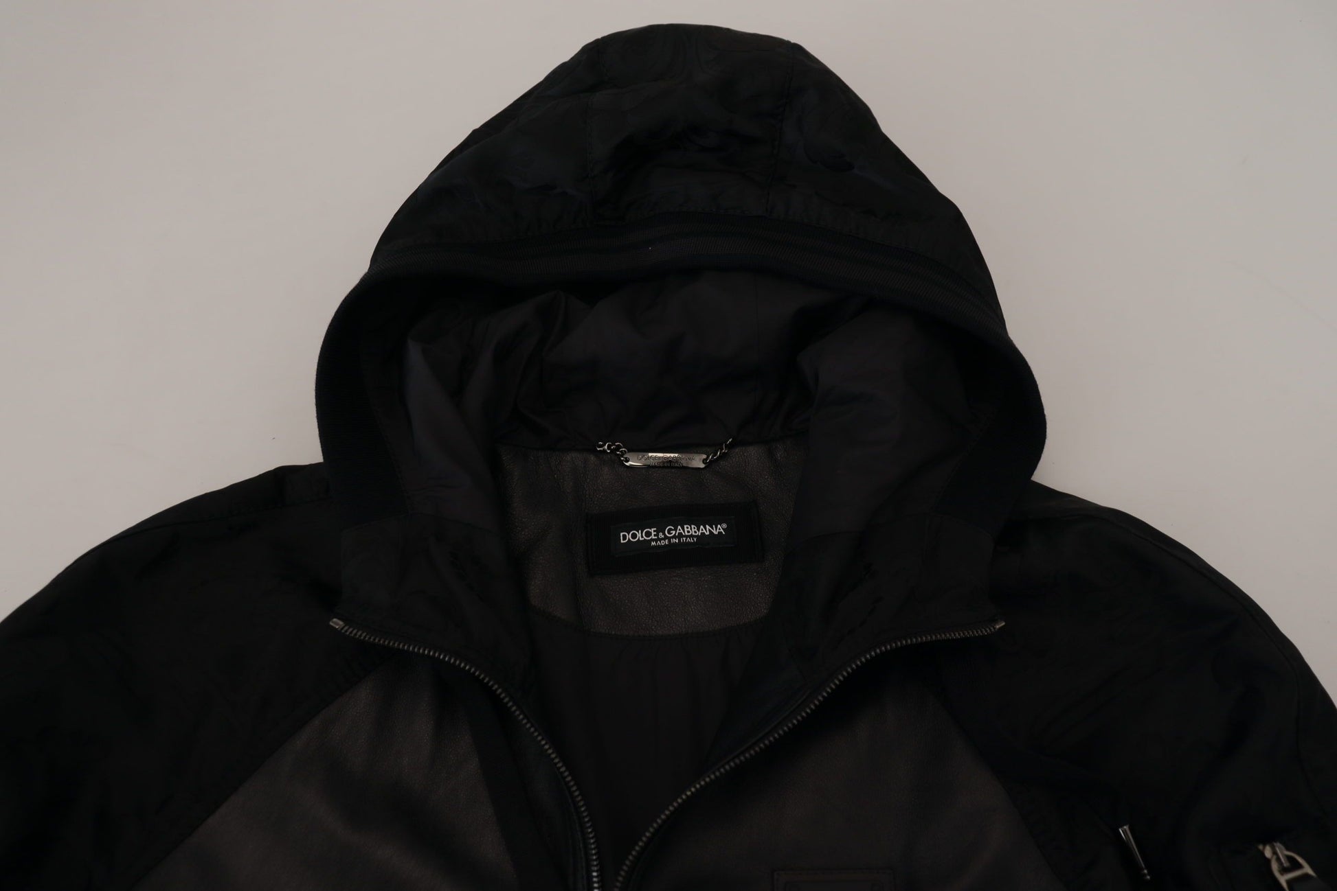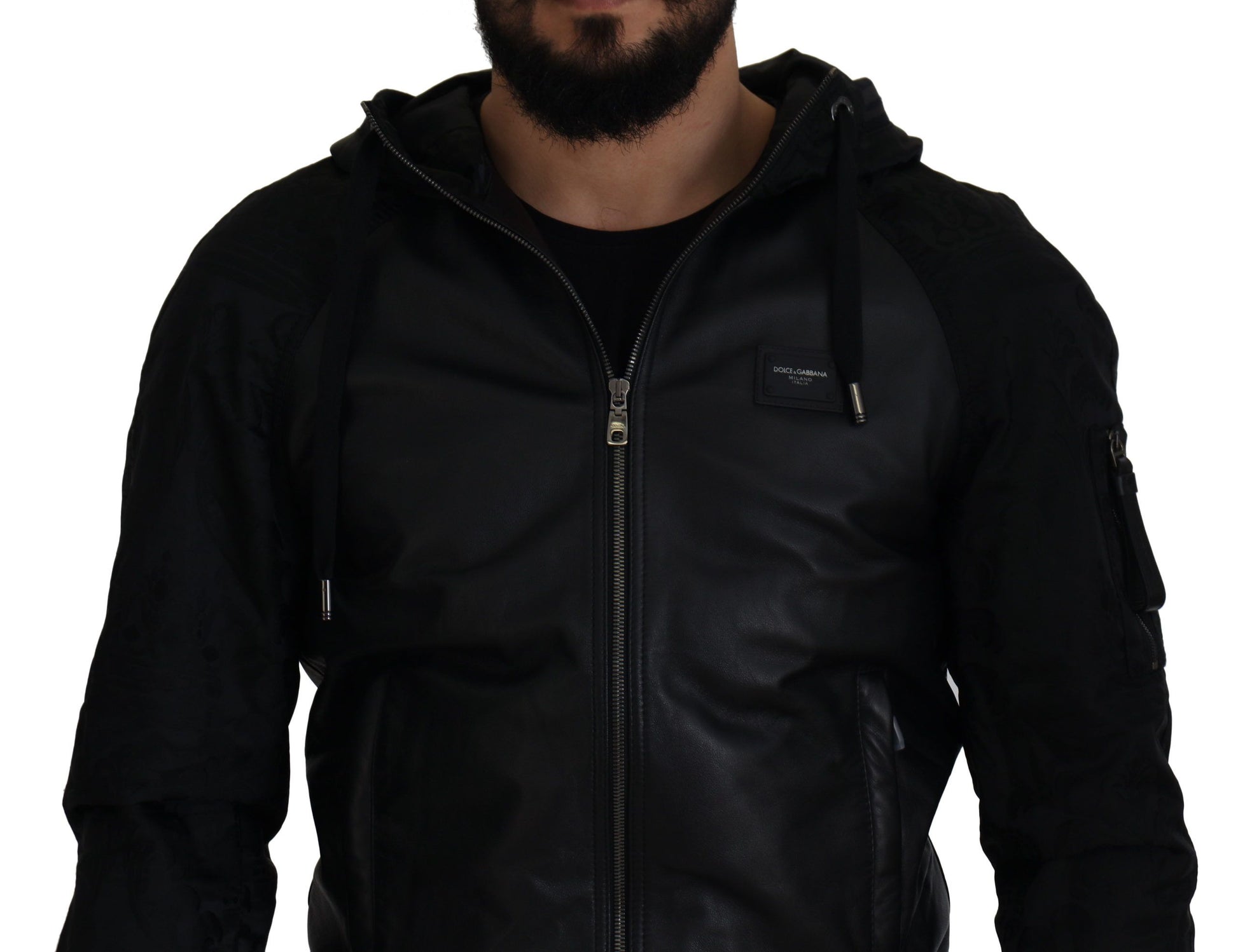 Step into luxury with this stunning, 100% Authentic Dolce & Gabbana leather hooded bomber jacket. This new addition with tags features a sleek black design and a full zip closure, complemented by a logo plaque adorning the chest for that touch of designer elegance. Designed for comfort and style, it includes an adjustable hood strap, ensuring the perfect fit for any occasion. Crafted in Italy, it’s a statement piece that combines durability with high-fashion sensibility.