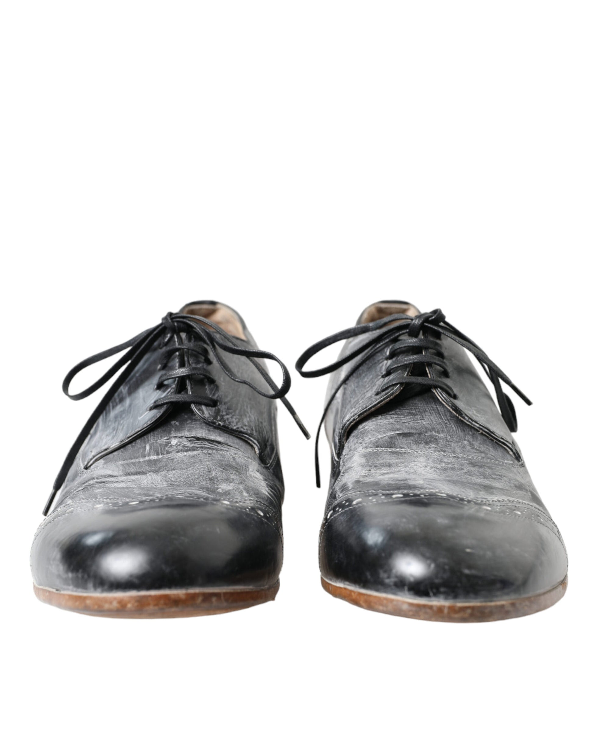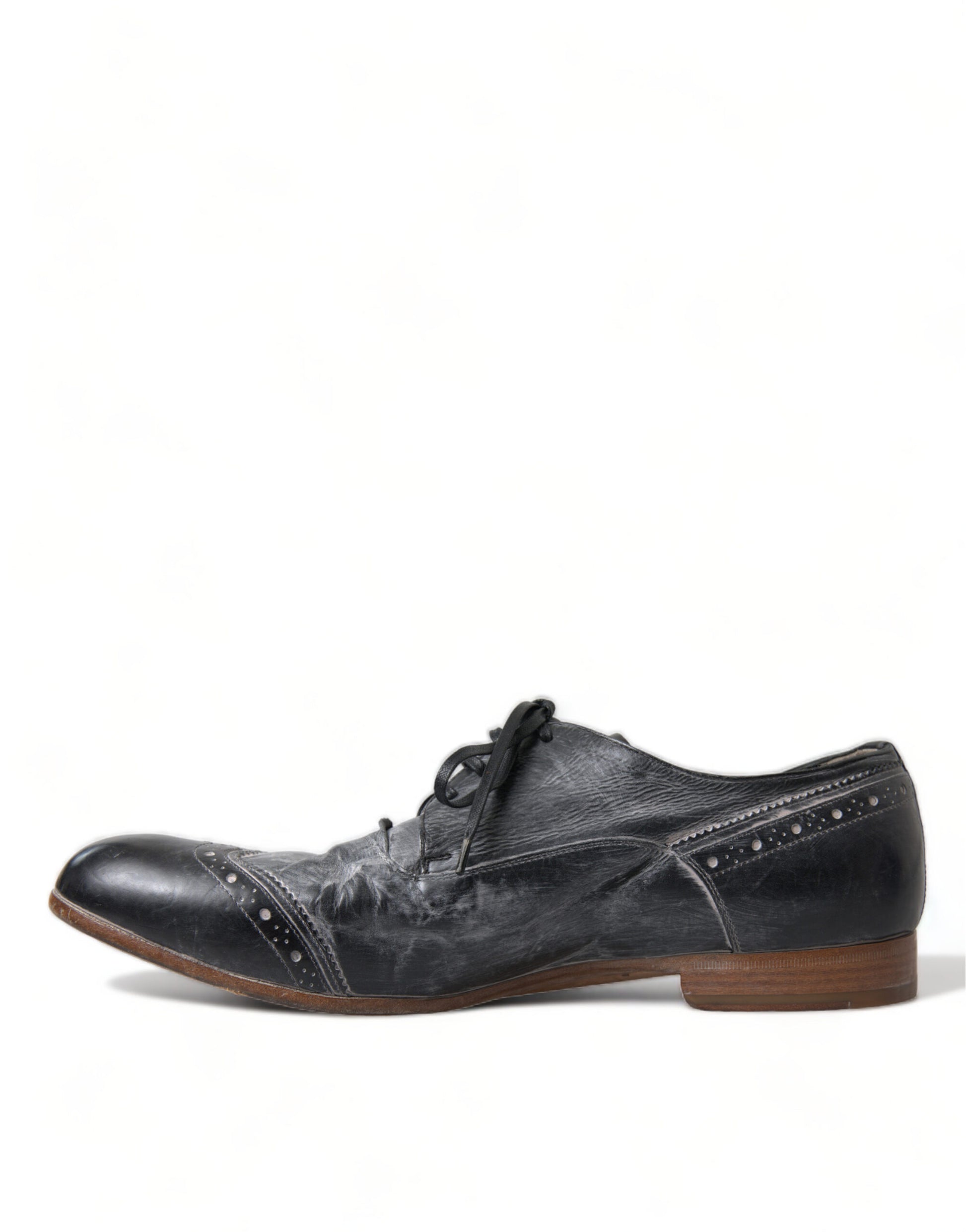 Step into a world of timeless elegance with these Dolce & Gabbana leather derby dress shoes. Premium materials and impeccable Italian craftsmanship define this stunning pair. The sophisticated black and gray vintage colorway offers a distinguished look perfect for formal events or enhancing your office attire. Boasting a lace-up closure and a logo detail, these shoes are as stylish as they are comfortable, making them an essential addition to your luxury footwear collection.