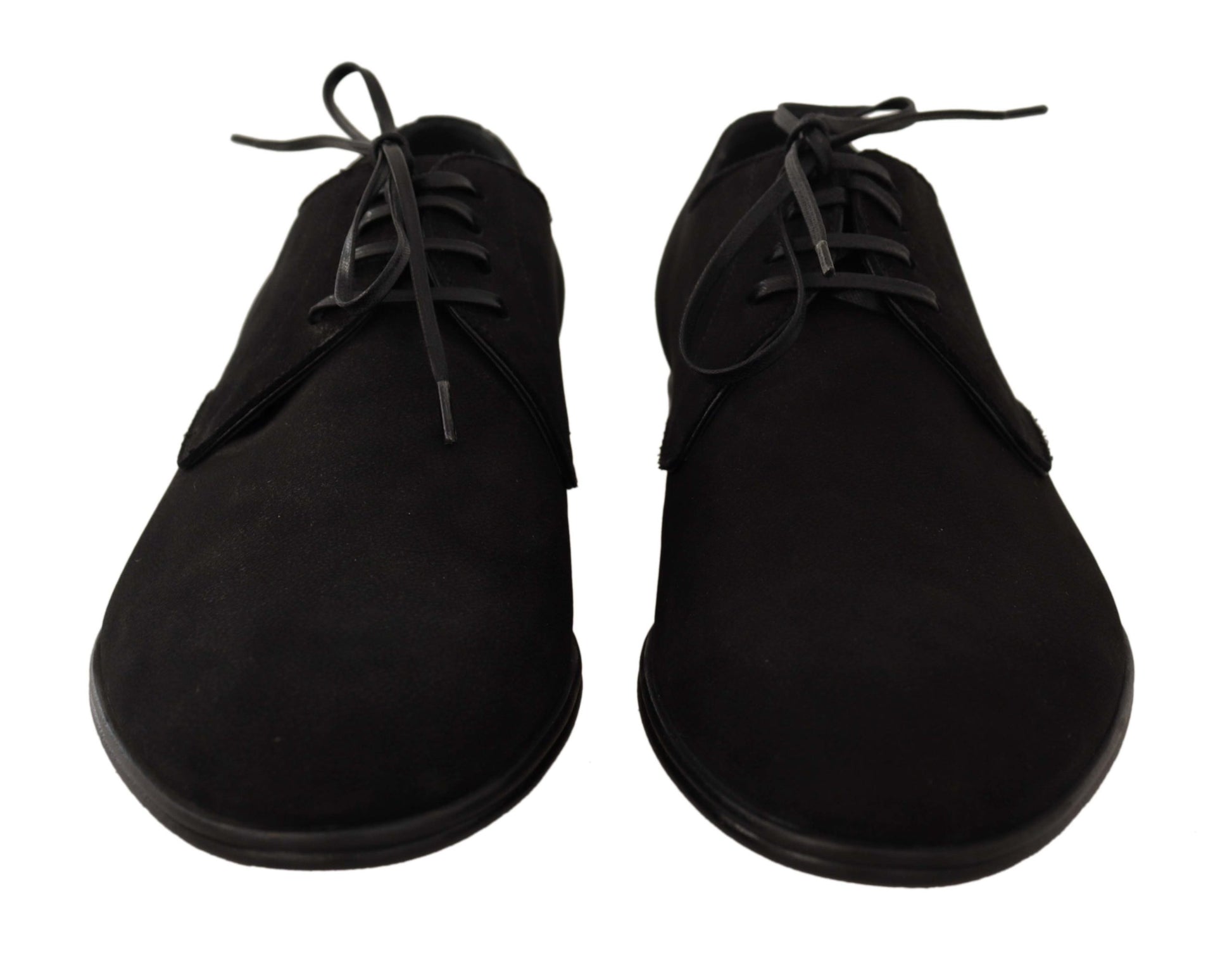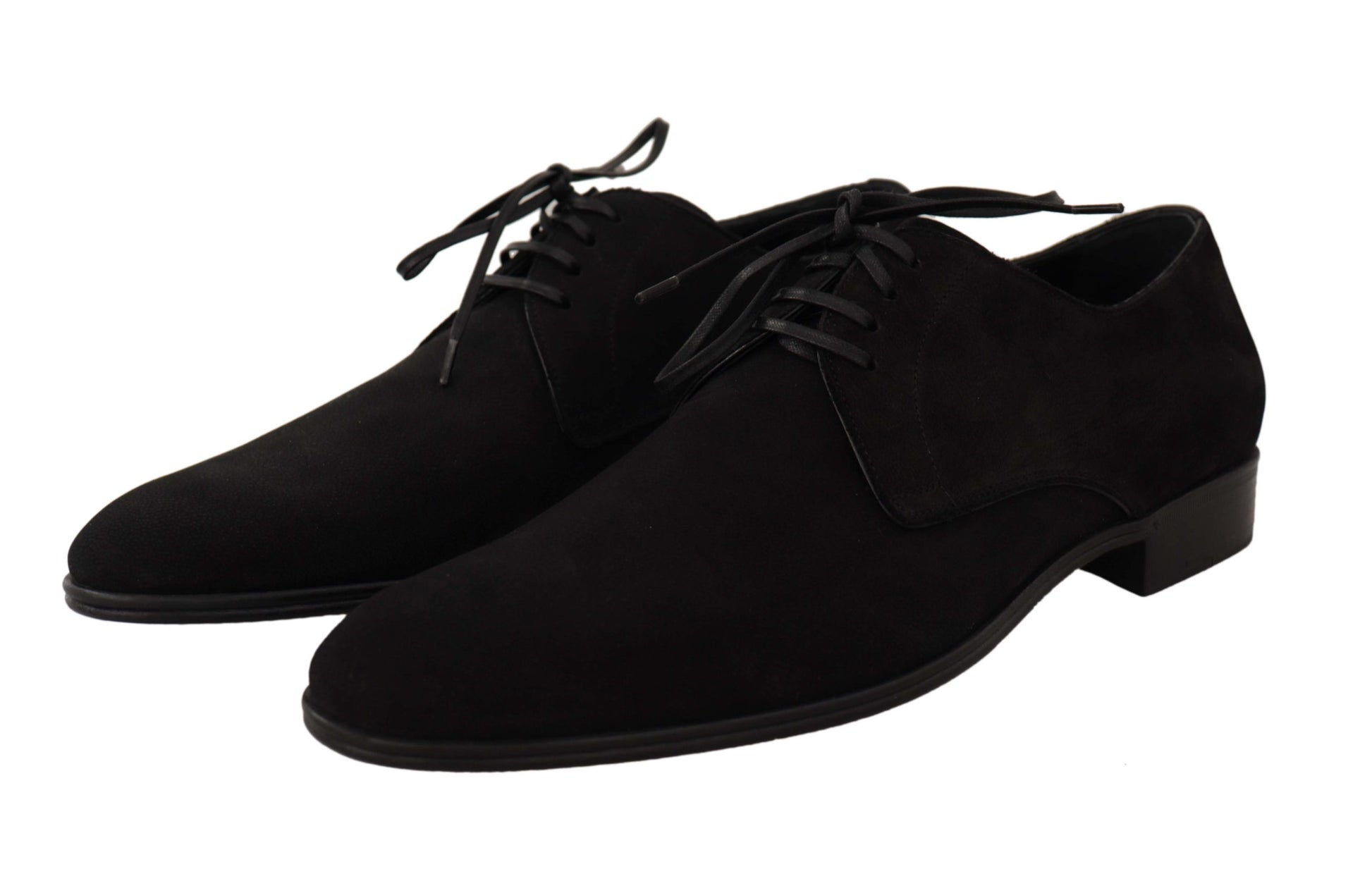 Step into sophistication with these gorgeous, brand new Derby dress shoes, perfect for formal occasions. Crafted from high-quality leather, each pair is an emblem of elegance and durability, underscored by the prestigious craftsmanship of Dolce & Gabbana. The sleek black hue makes these shoes a versatile addition to your wardrobe, matching seamlessly with your finest suits. Designed in Italy, they feature rubber soles for comfort and longevity, along with subtle logo details that reflect your taste for luxury.