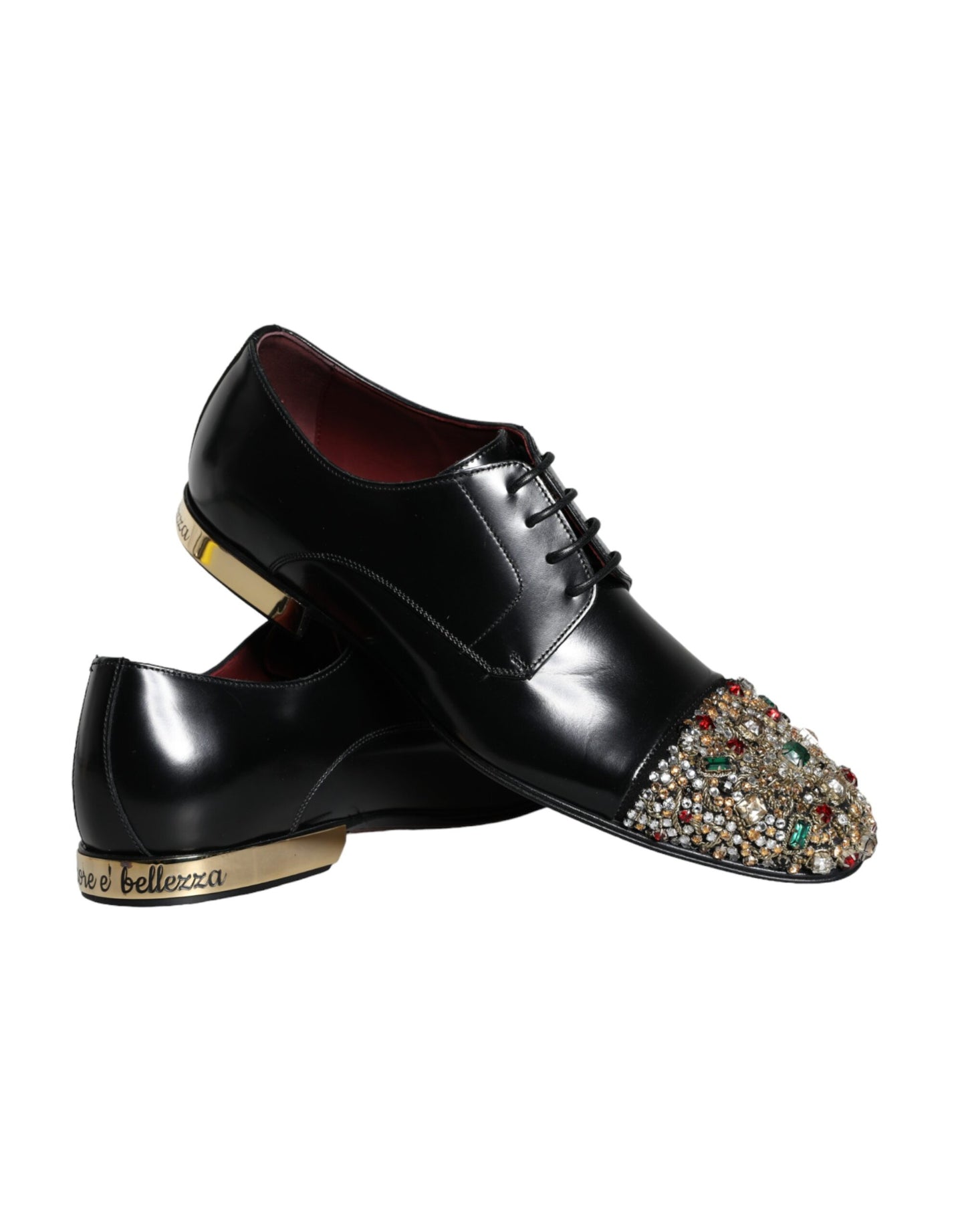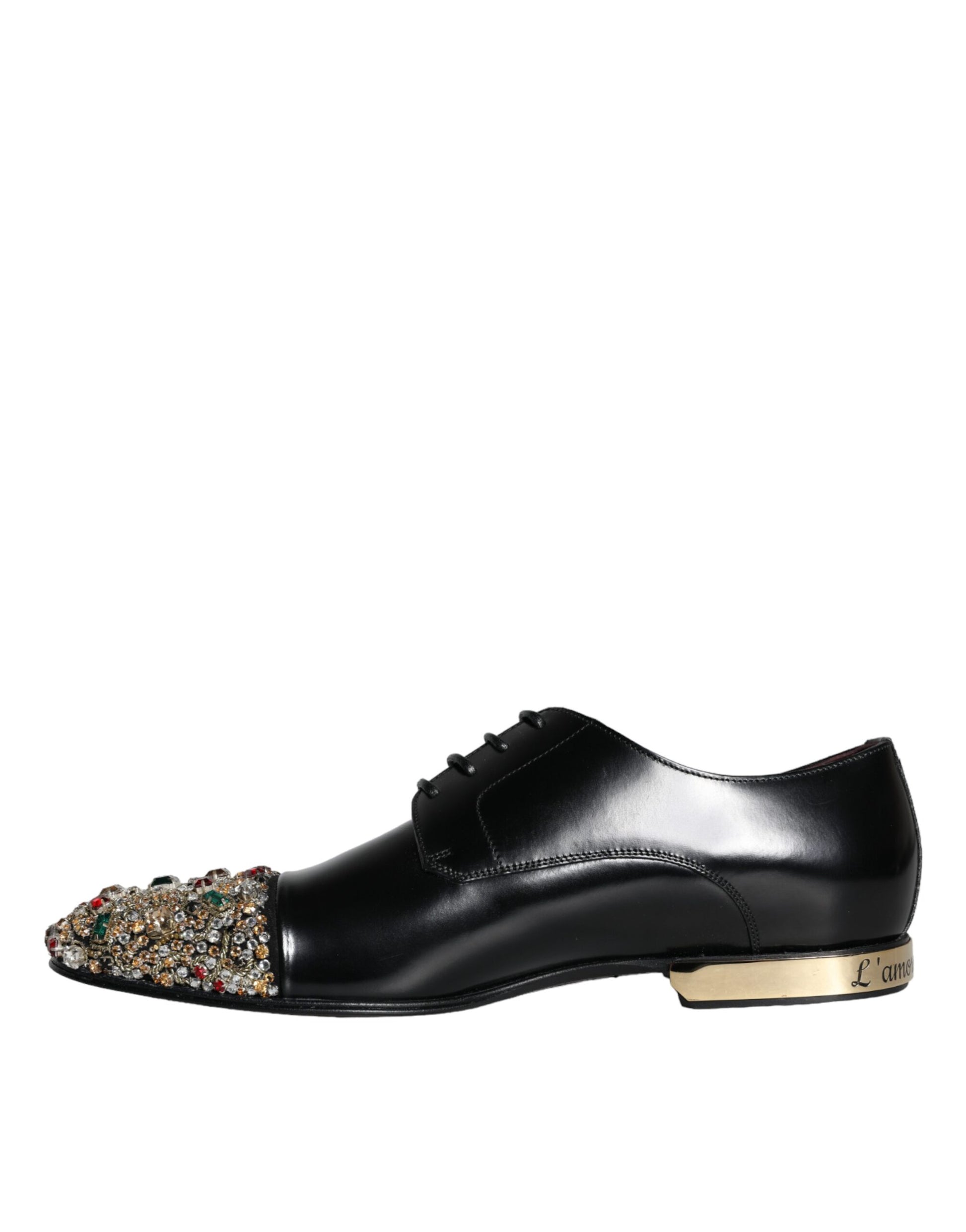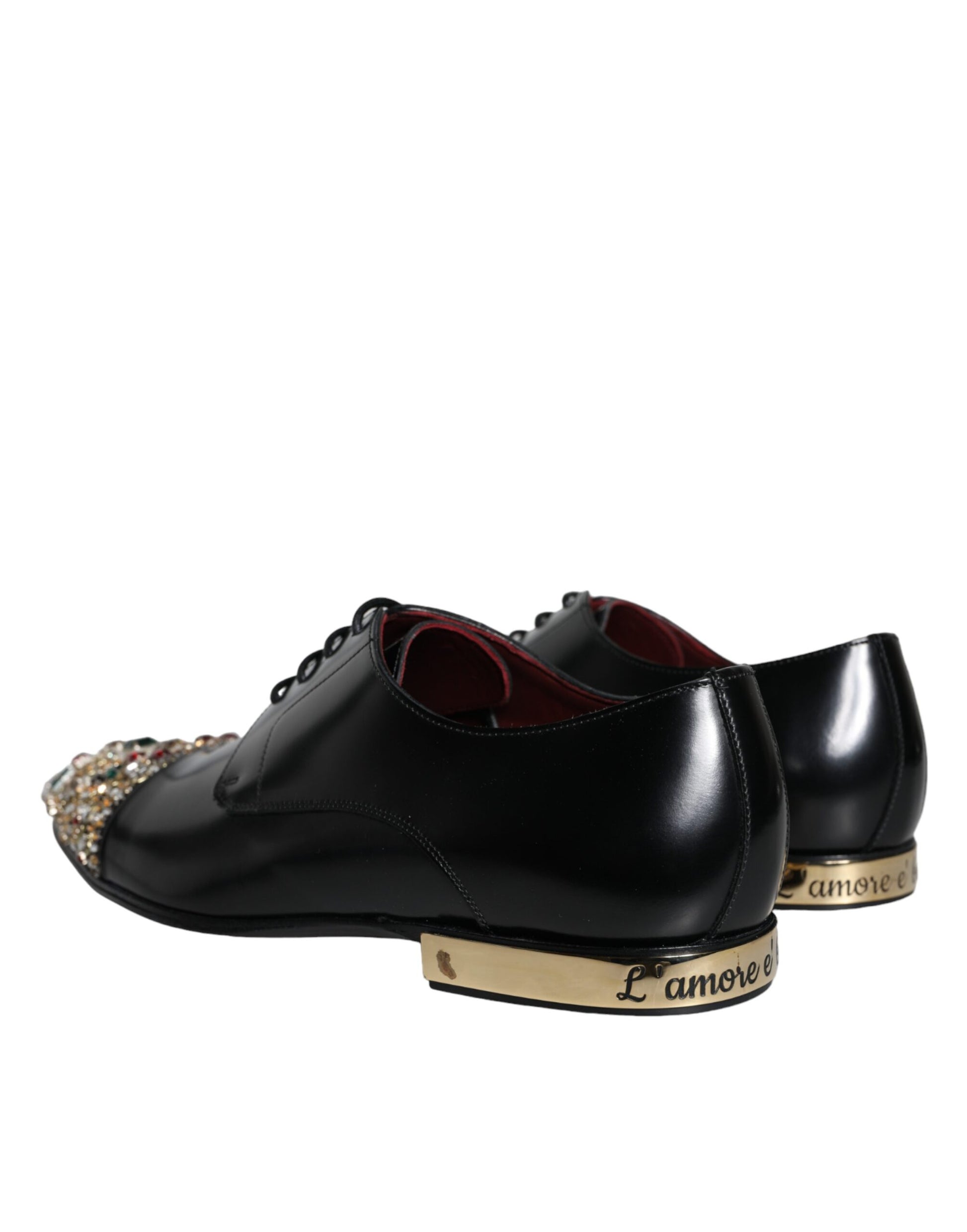 Gorgeous brand new with tags, 100% Authentic Dolce & Gabbana exclusive and elegant derby shoes made of smooth leather with crystal jewelry and “L’Amore e’ bellezza” heels in black.