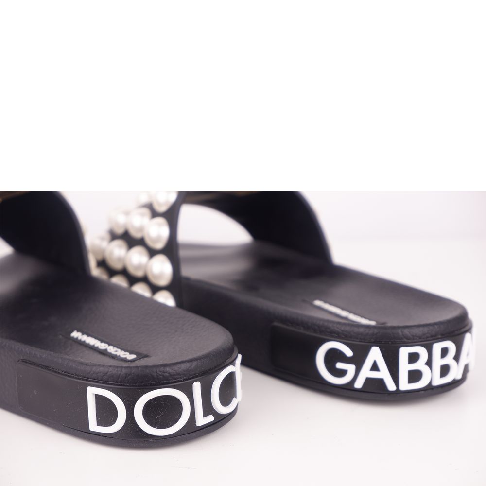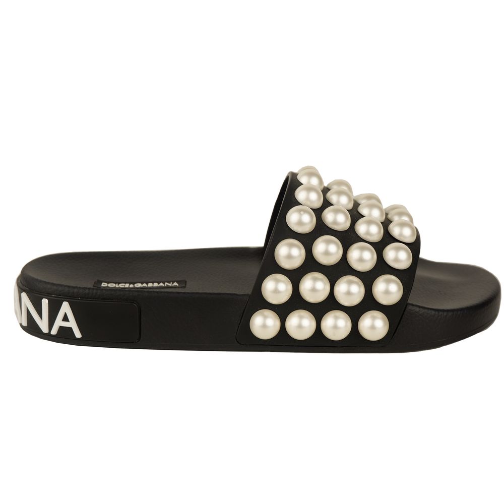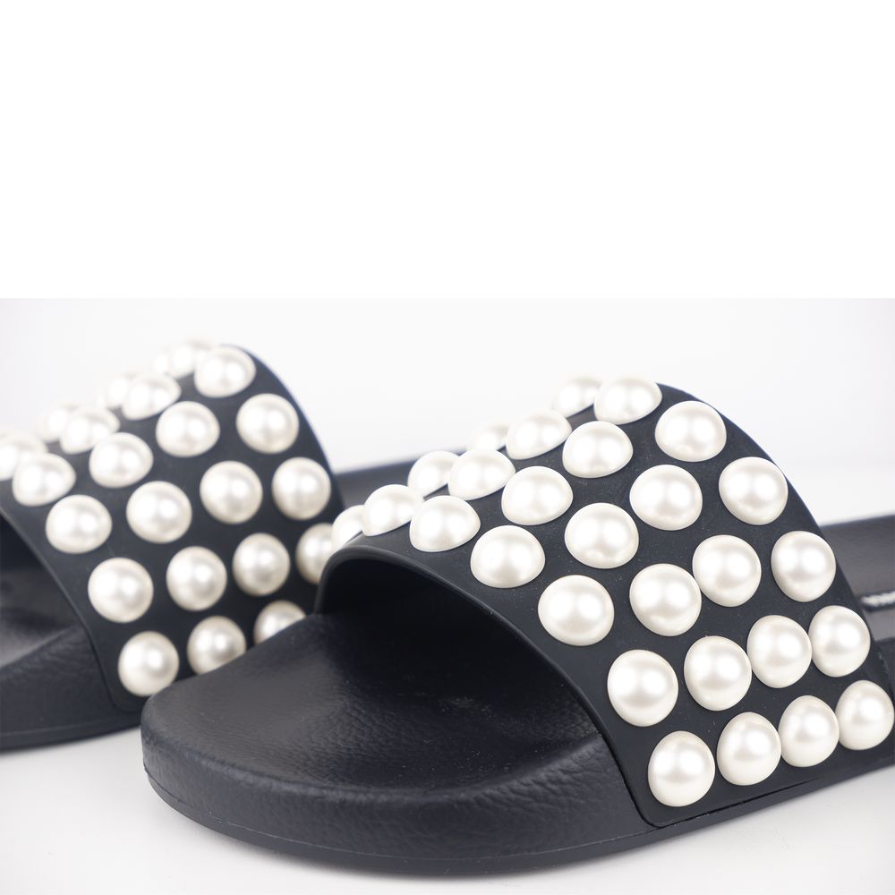 Step into luxury with these elegant rubberized calfskin slippers that exude sophistication. Adorned with a contrasting logo on the back, these Italian-made slippers are brought to life with lustrous pearls meticulously applied atop. Perfect for adding a touch of glamour to your laid-back looks or complementing your evening attire.