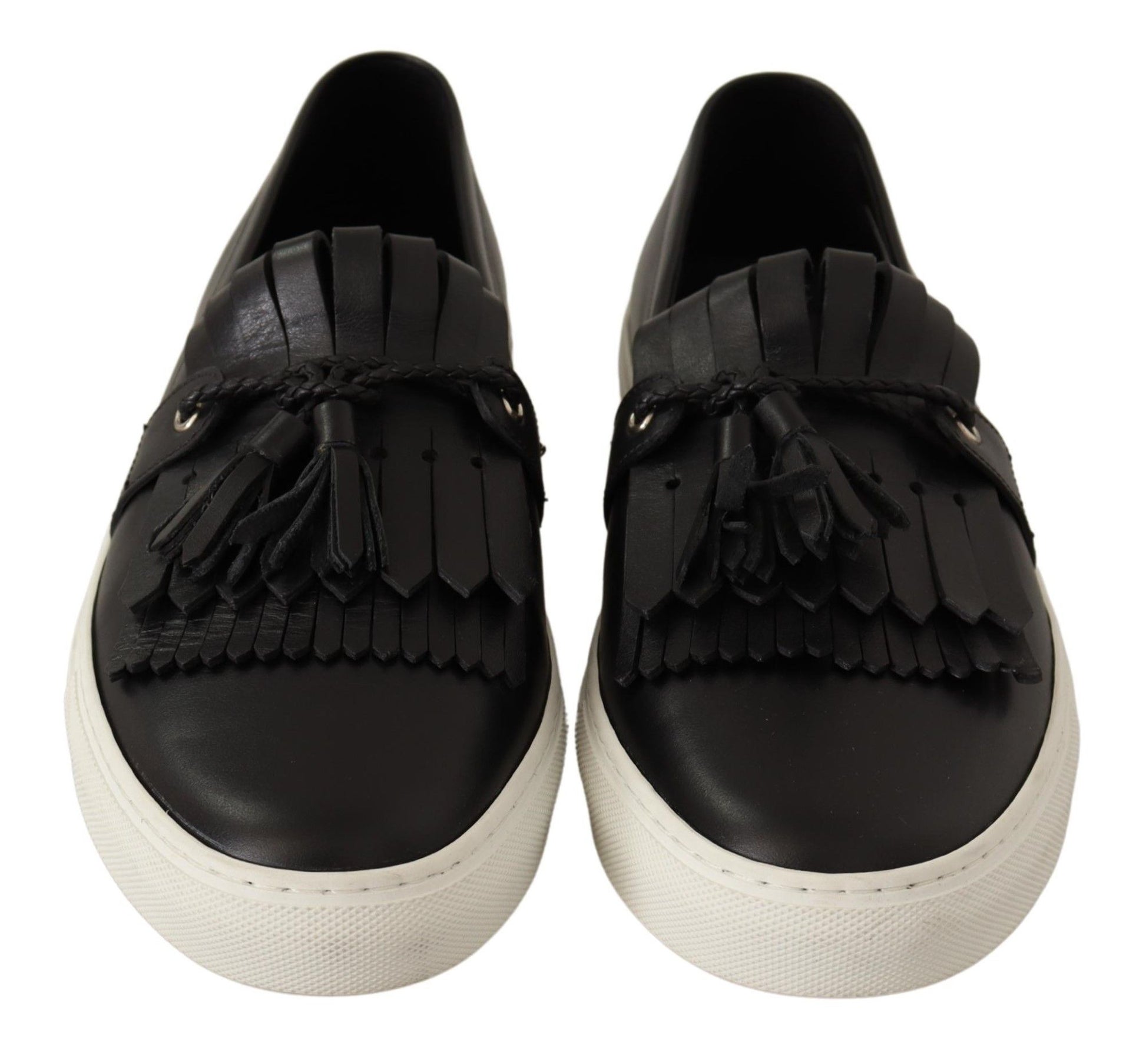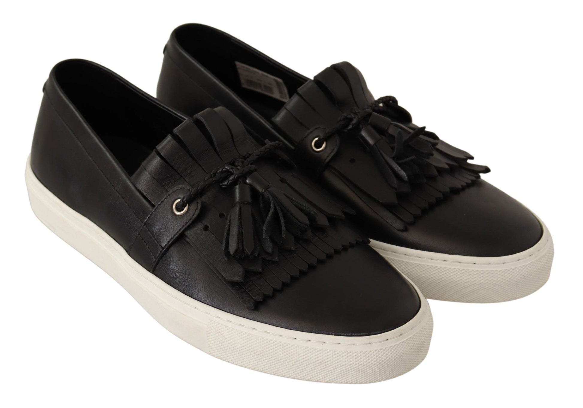 Indulge in the epitome of Italian elegance with these stunning loafers by Dolce & Gabbana . Perfectly crafted for the discerning gentleman, these shoes feature a polished black leather exterior accented with a classic tassel detail, embodying sophistication and sartorial finesse. Finished with a comfortable rubber sole, these loafers promise both luxury and practicality for any occasion.