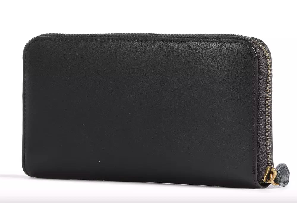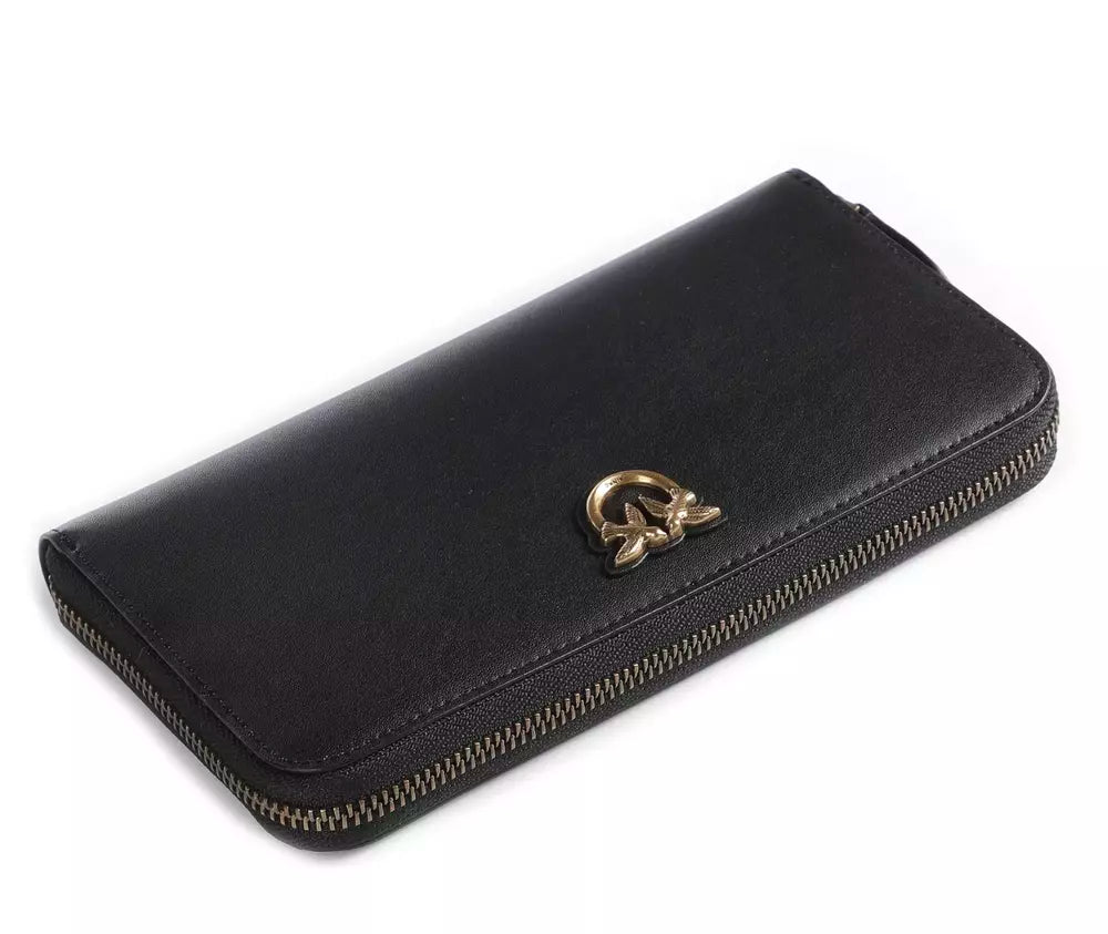 Unveil the epitome of sophistication with this chic black leather wallet, perfect for the fashion-forward individual. It features an exquisite brand logo on the front, paired with a secure zipper closure, ensuring your essentials stay safe and stylishly tucked away. Compact yet spacious, this wallet measures 20x10x2 cm, offering ample room for your cards, cash, and receipts.