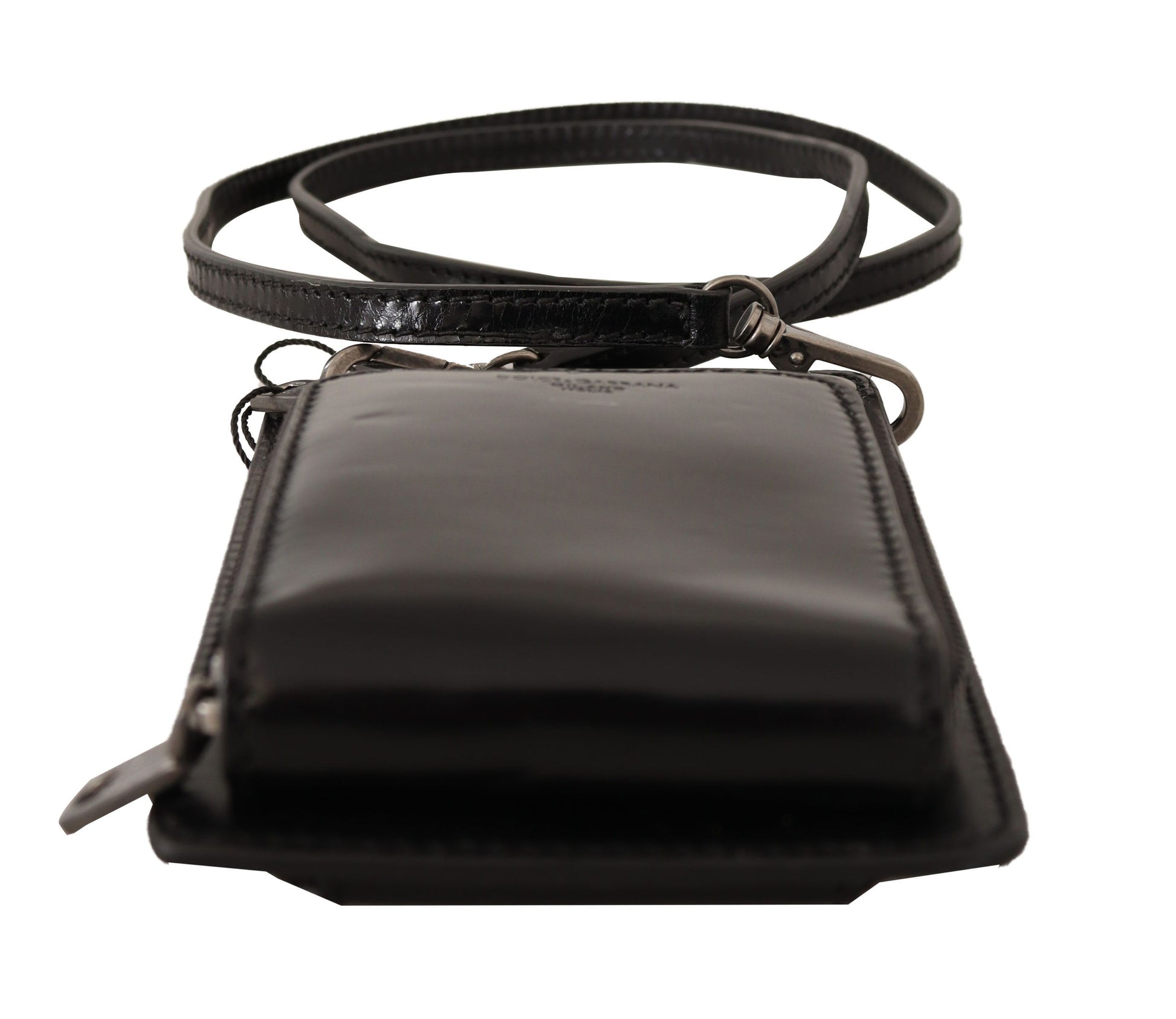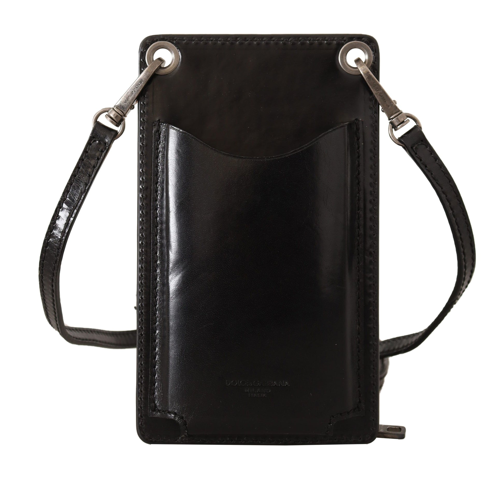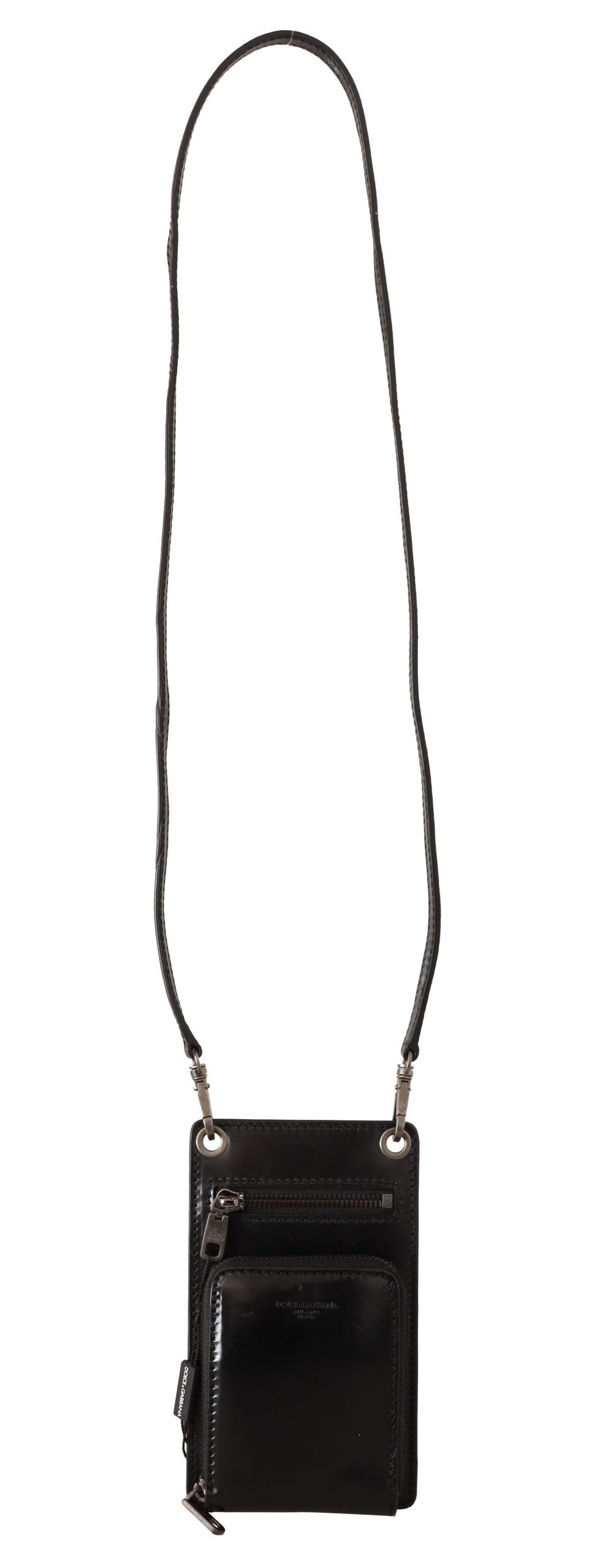Indulge in the epitome of sophistication with Dolce & Gabbana’s elegant phone pocket wallet. Adorned with silver metal details, this versatile accessory boasts the convenience of card slots and a secure full zipper closure. The detachable neck or shoulder strap allows for varied styling, ensuring that your essentials are always within reach while on-the-go. Crafted from the finest leather and made in Italy, this wallet is not just a statement of fashion but a testament to luxury craftsmanship.