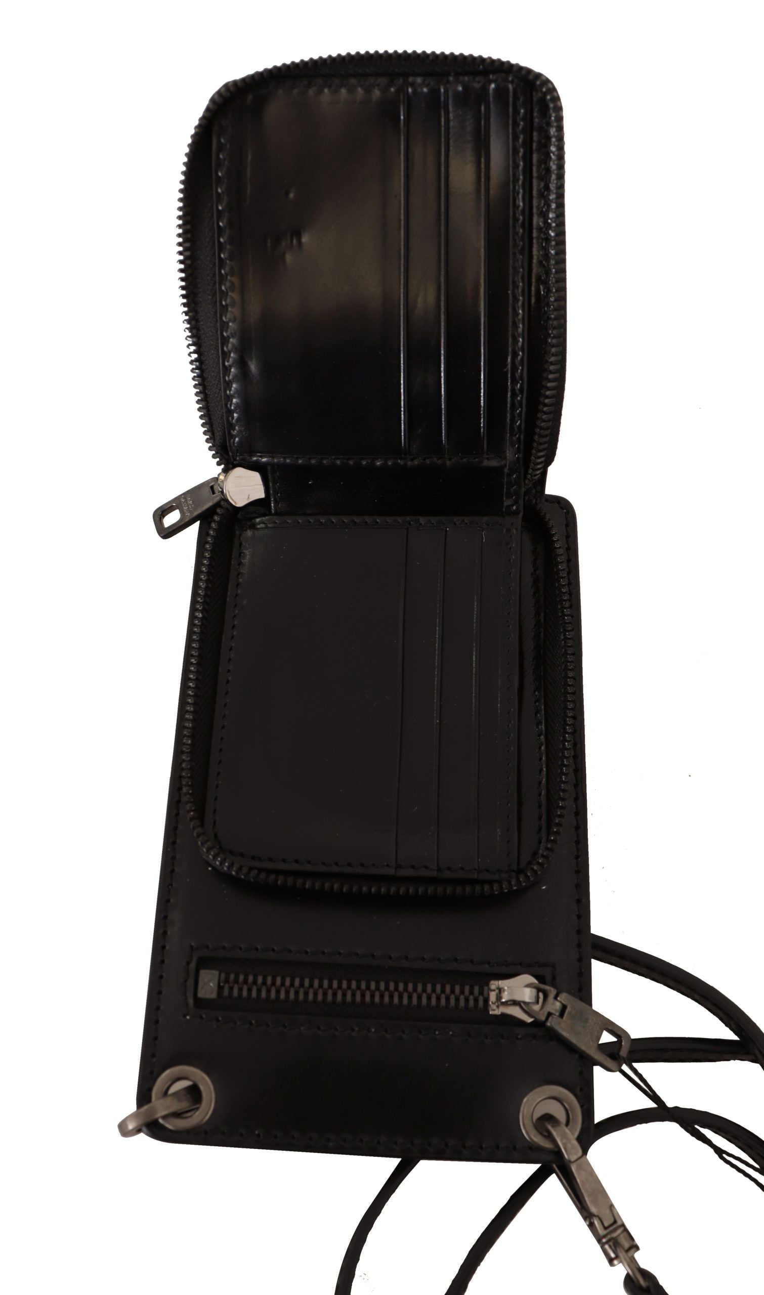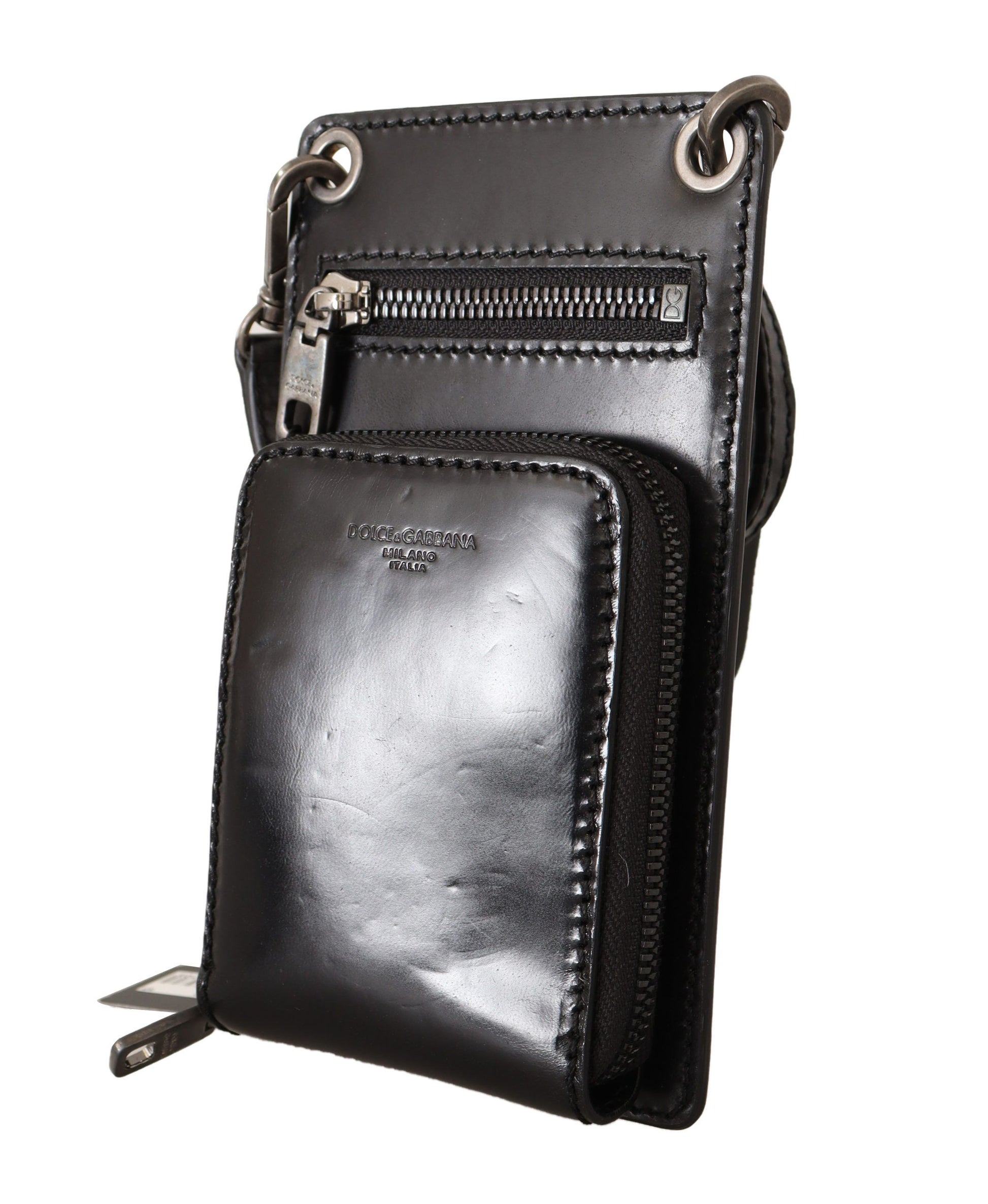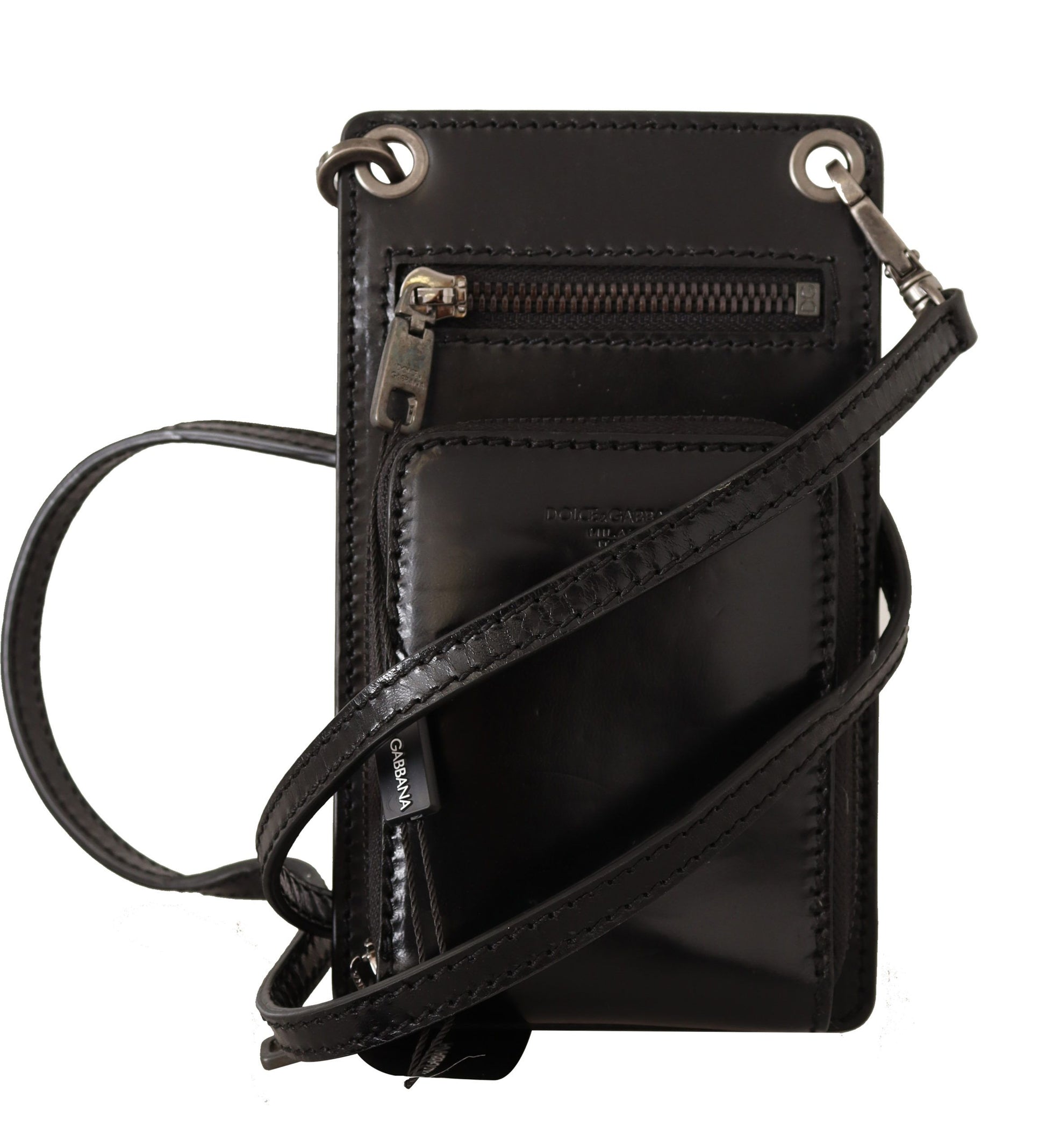 Indulge in the epitome of sophistication with Dolce & Gabbana’s elegant phone pocket wallet. Adorned with silver metal details, this versatile accessory boasts the convenience of card slots and a secure full zipper closure. The detachable neck or shoulder strap allows for varied styling, ensuring that your essentials are always within reach while on-the-go. Crafted from the finest leather and made in Italy, this wallet is not just a statement of fashion but a testament to luxury craftsmanship.