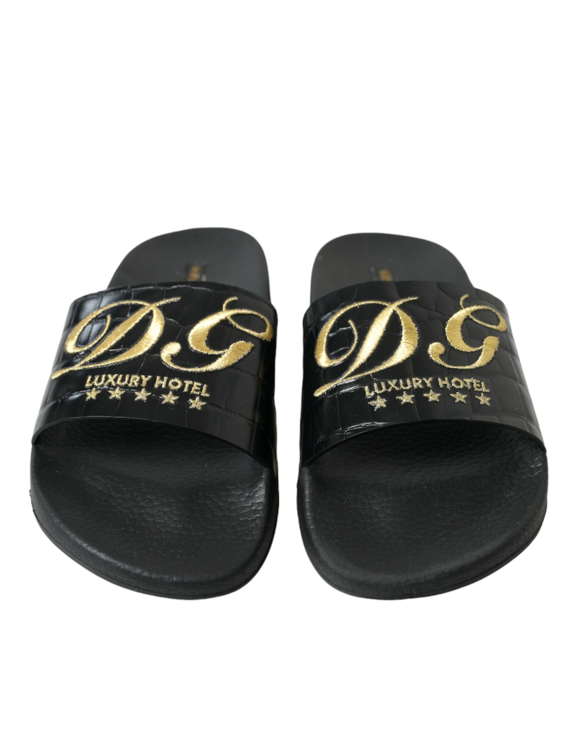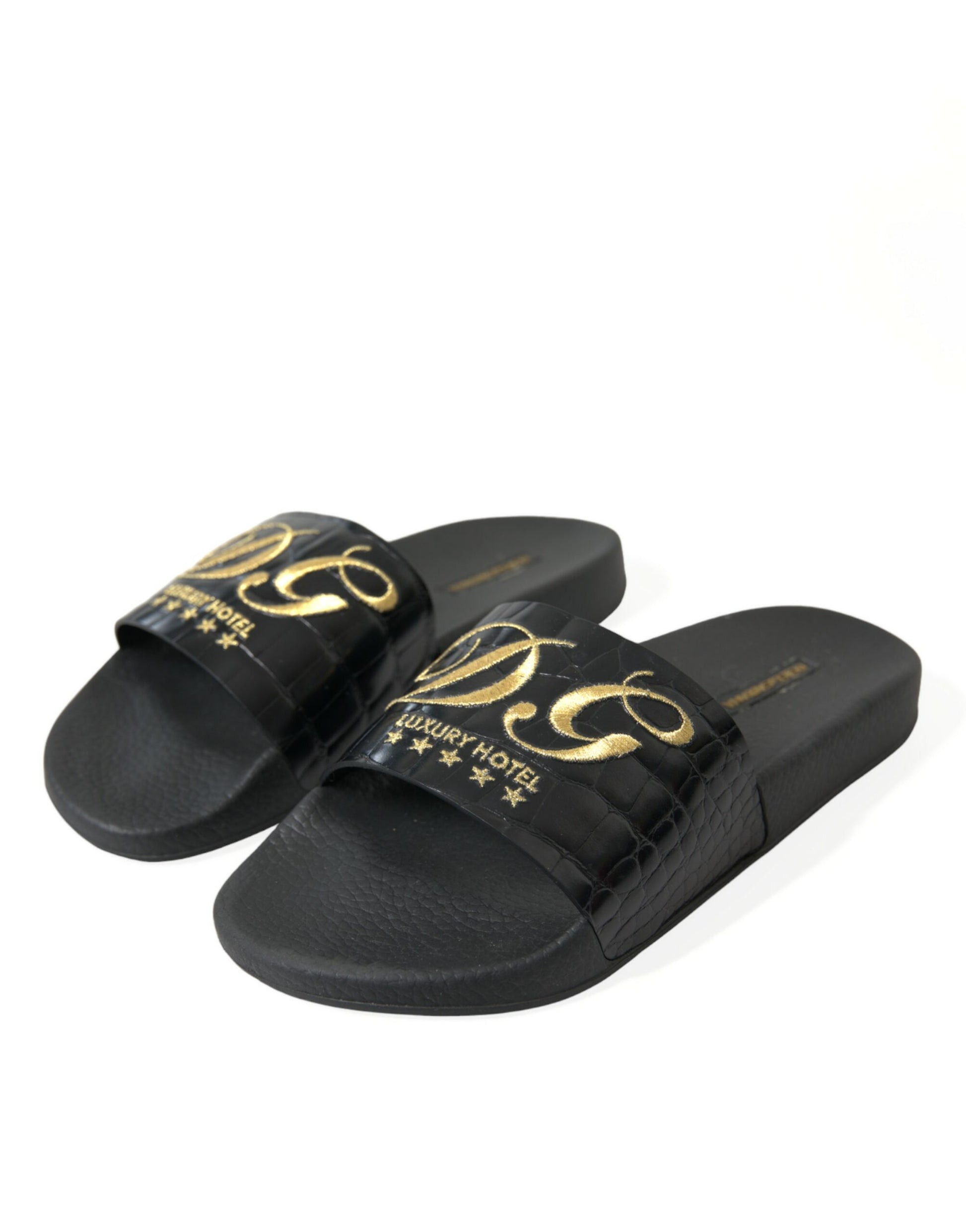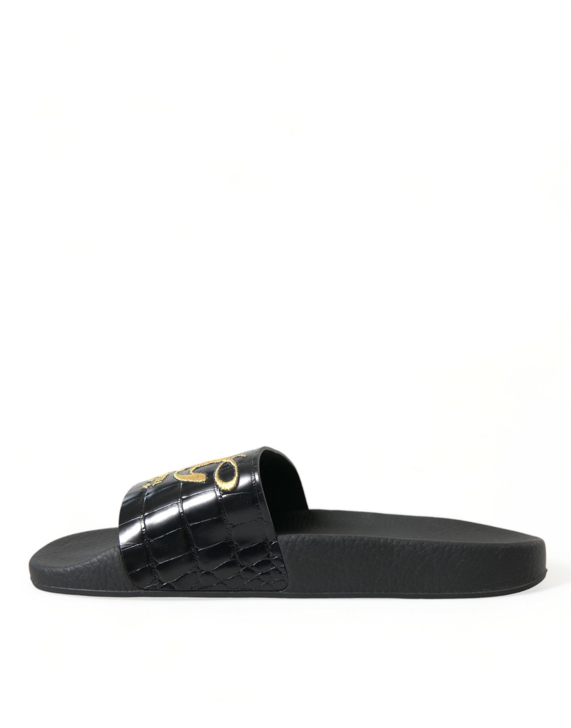 Step into luxury and sophistication with these gorgeous black leather slides, featuring a stunning gold logo embroidery that captures the essence of elegance. Crafted with 100% authentic leather and designed by the esteemed house of Dolce & Gabbana, these slides are not only a statement of style but also an embodiment of exquisite Italian craftsmanship. Perfect for adding a touch of glam to any outfit, they are complete with a comfy rubber sole tailored for all-day wear.