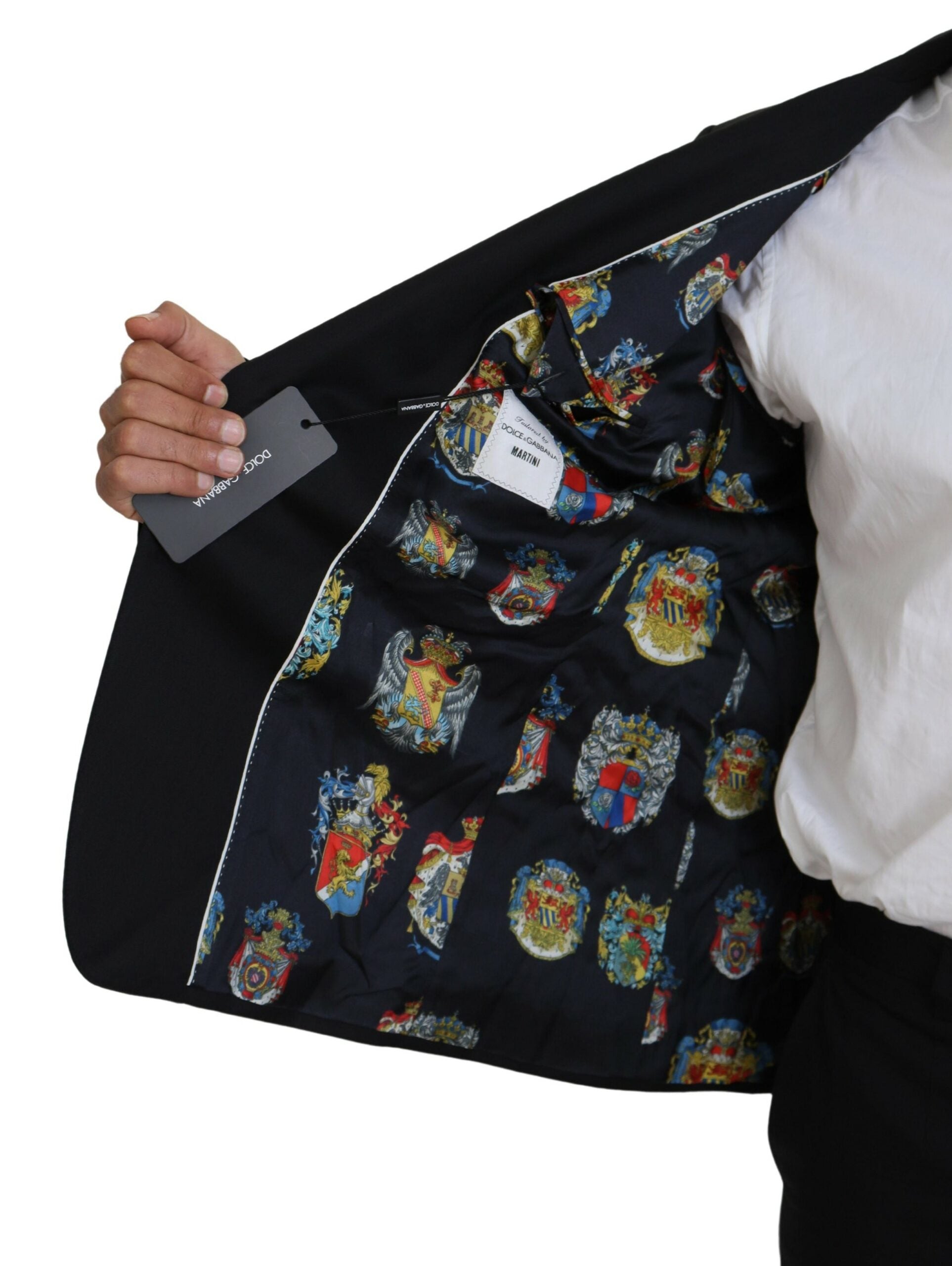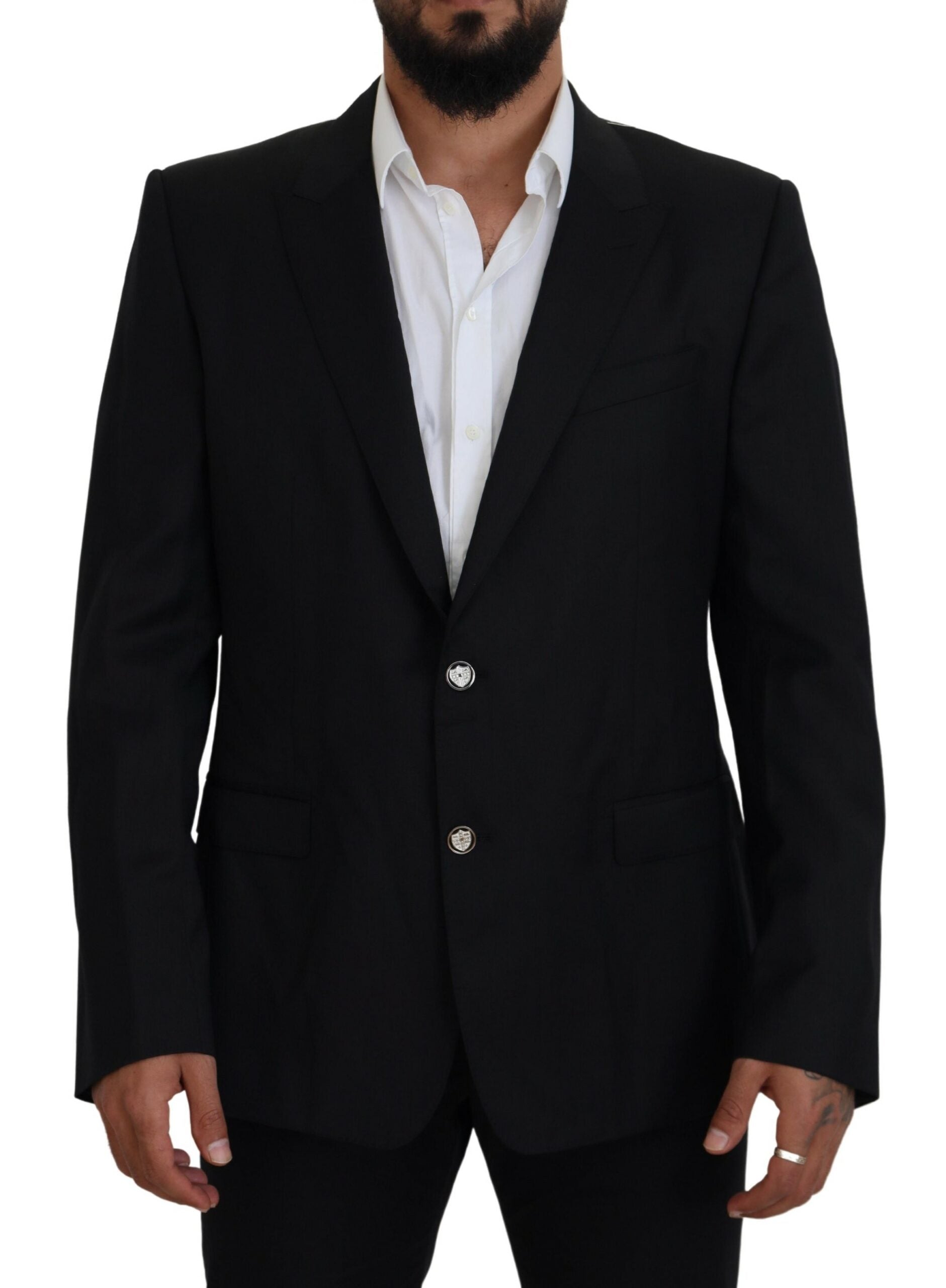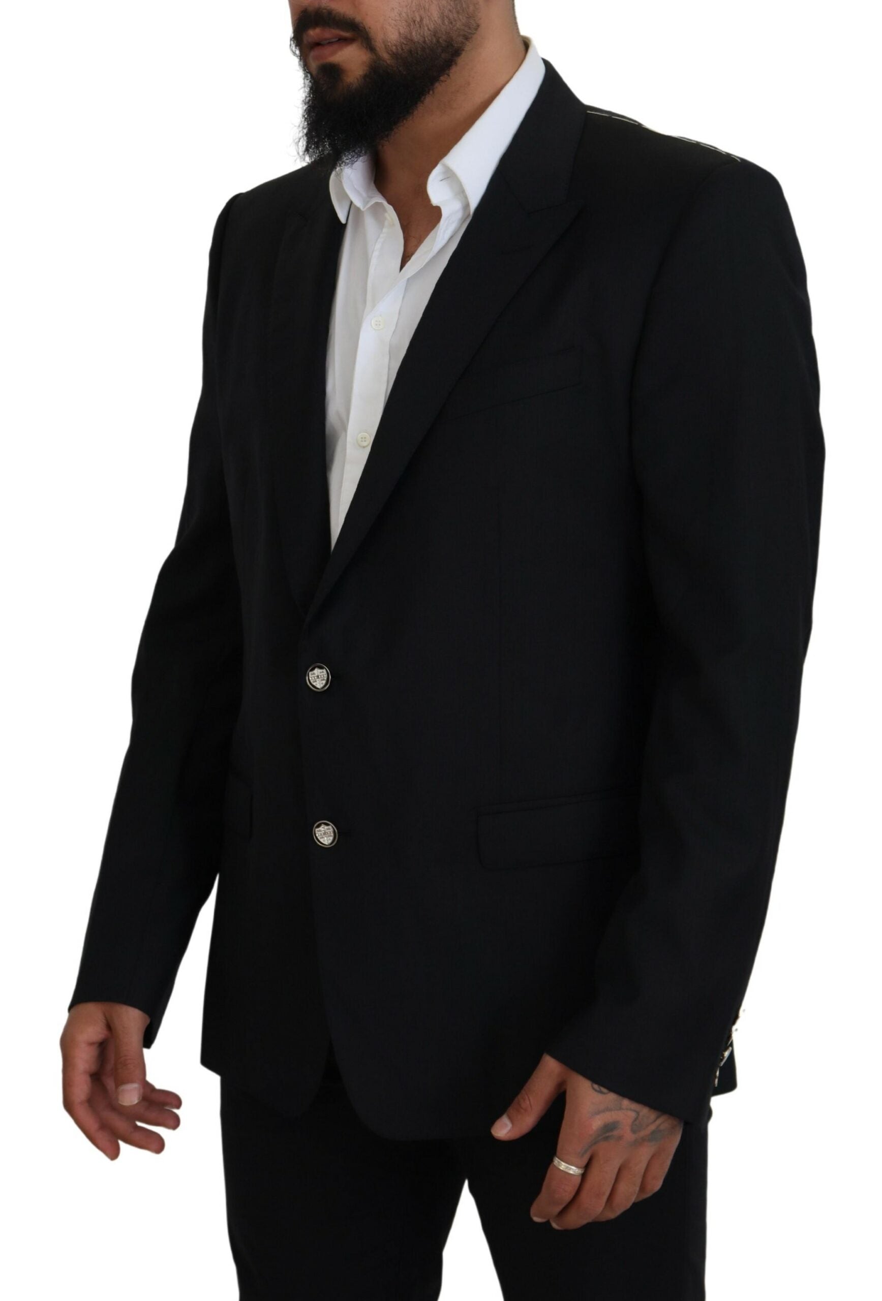 Step into classic refinement with our stunning, new with tags, 100% Authentic Dolce & Gabbana Black Martini Blazer. Tailored to perfection for the fashion-forward gentleman, this single-breasted formal jacket blazer is a true symbol of high-end craftsmanship. It offers luxe sensibility with its pure virgin wool construction, exquisite lining, and sophisticated logo details. Perfect for that polished look, made with pride in Italy.