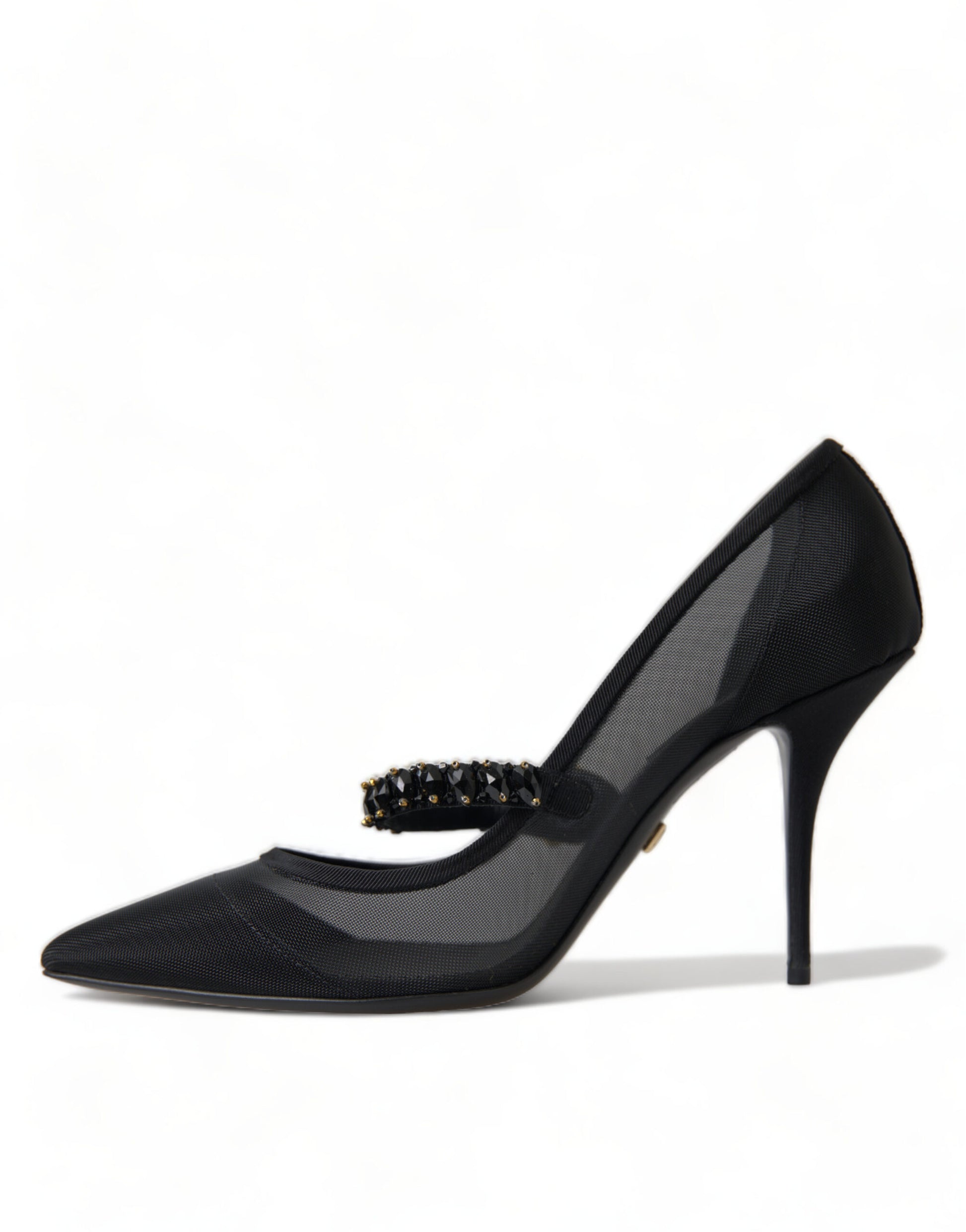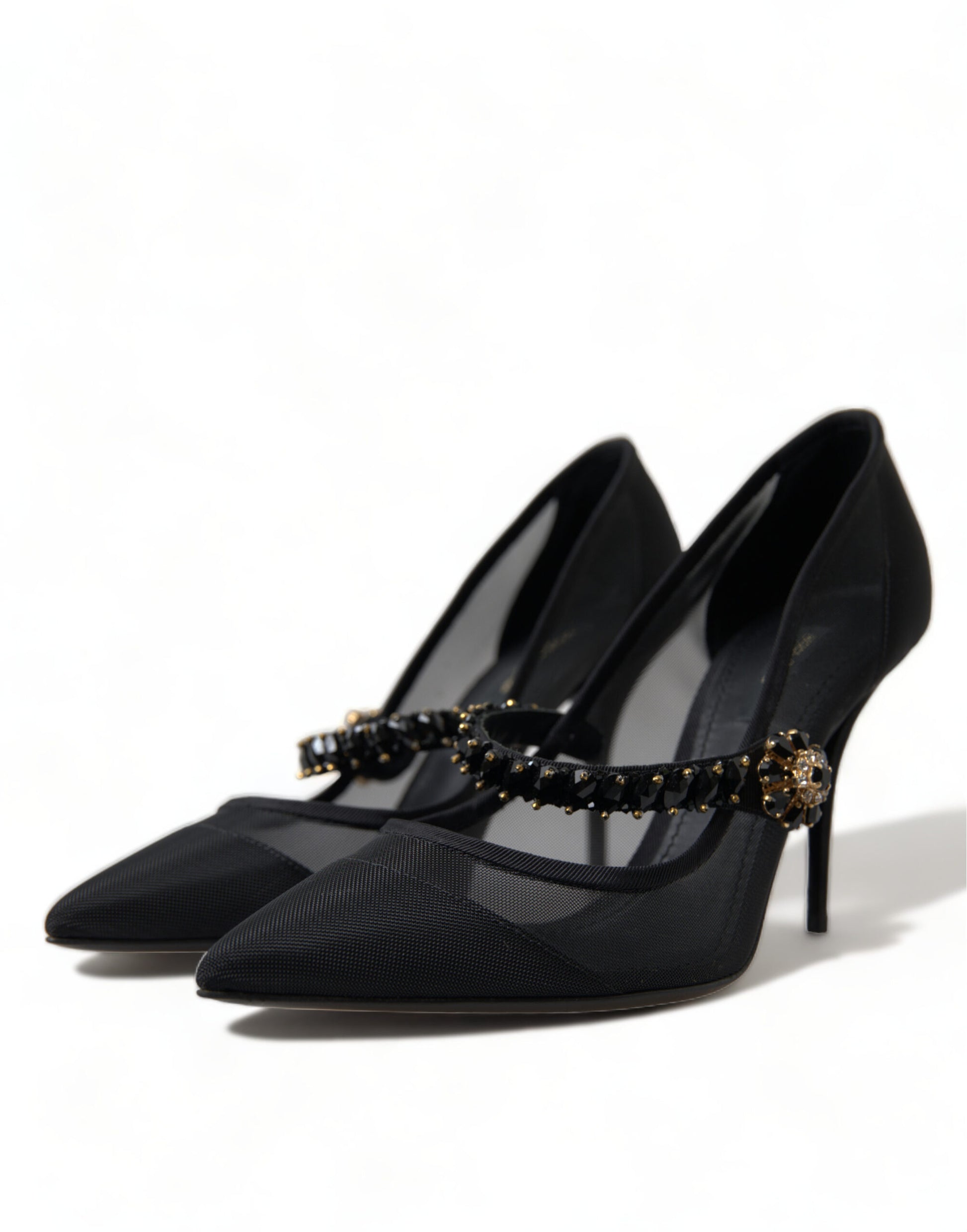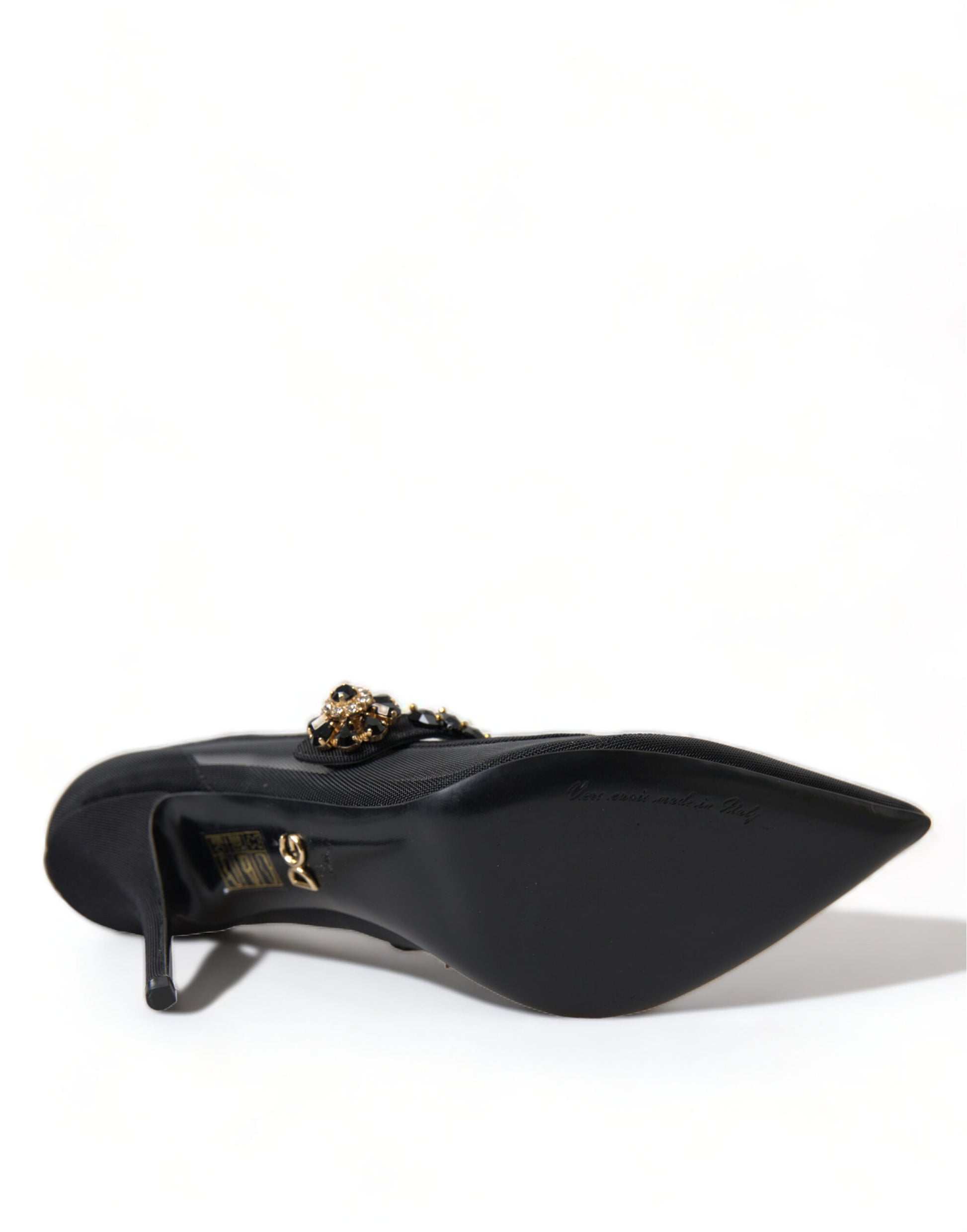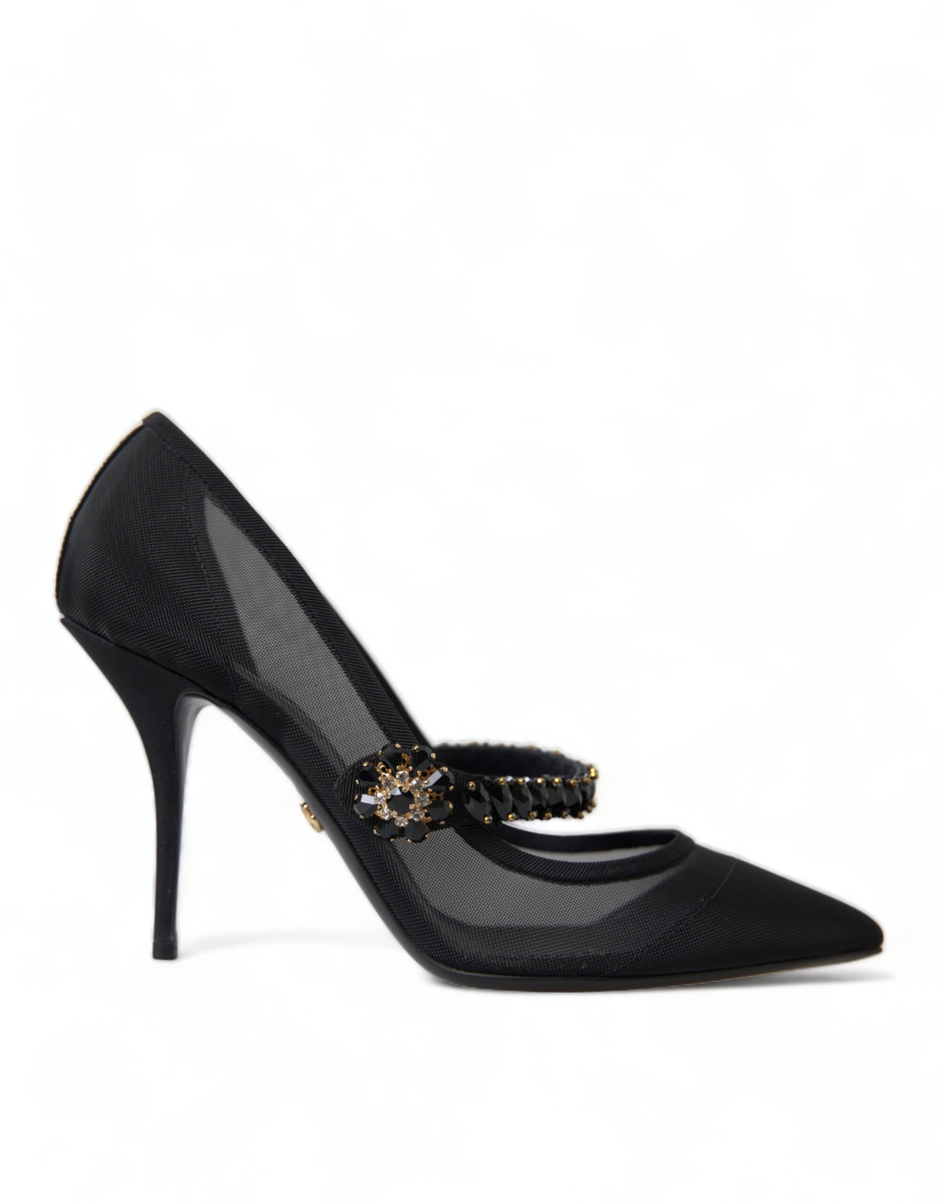 Step into luxury with these stunning black Mary Jane heels by Dolce & Gabbana. These pumps are a testament to timeless elegance, featuring a sparkling crystal-embellished strap and an alluring brooch at the center. The pointed toe design adds a touch of sophistication, making them the perfect choice for a glamorous evening event or a sophisticated outing. Crafted in Italy, these shoes boast a leather sole for superior comfort and durability.