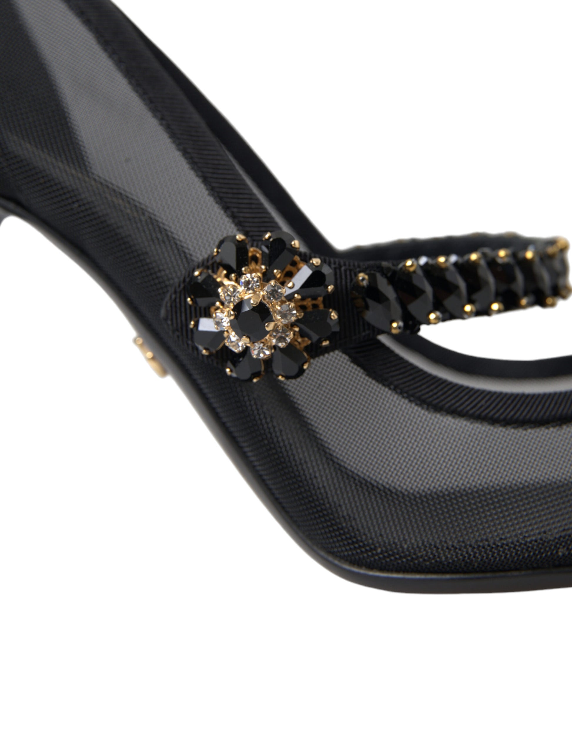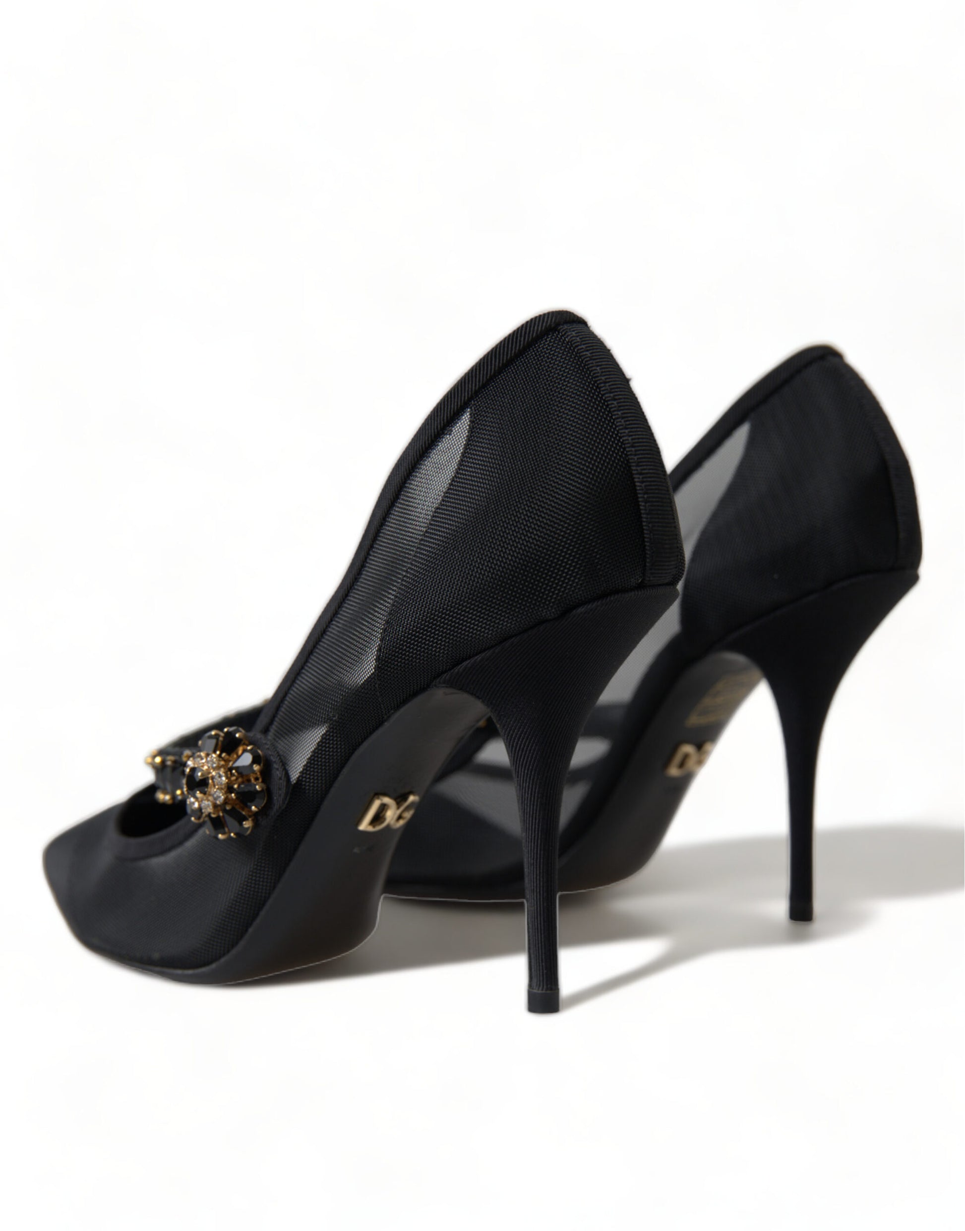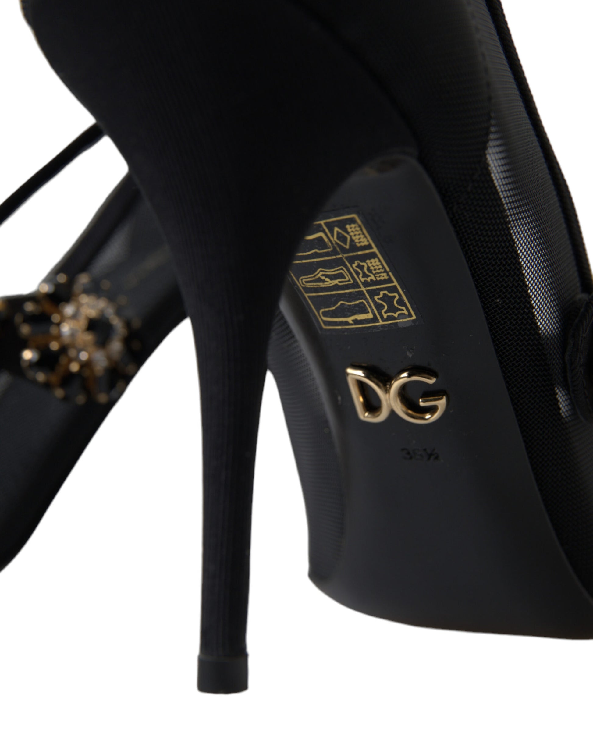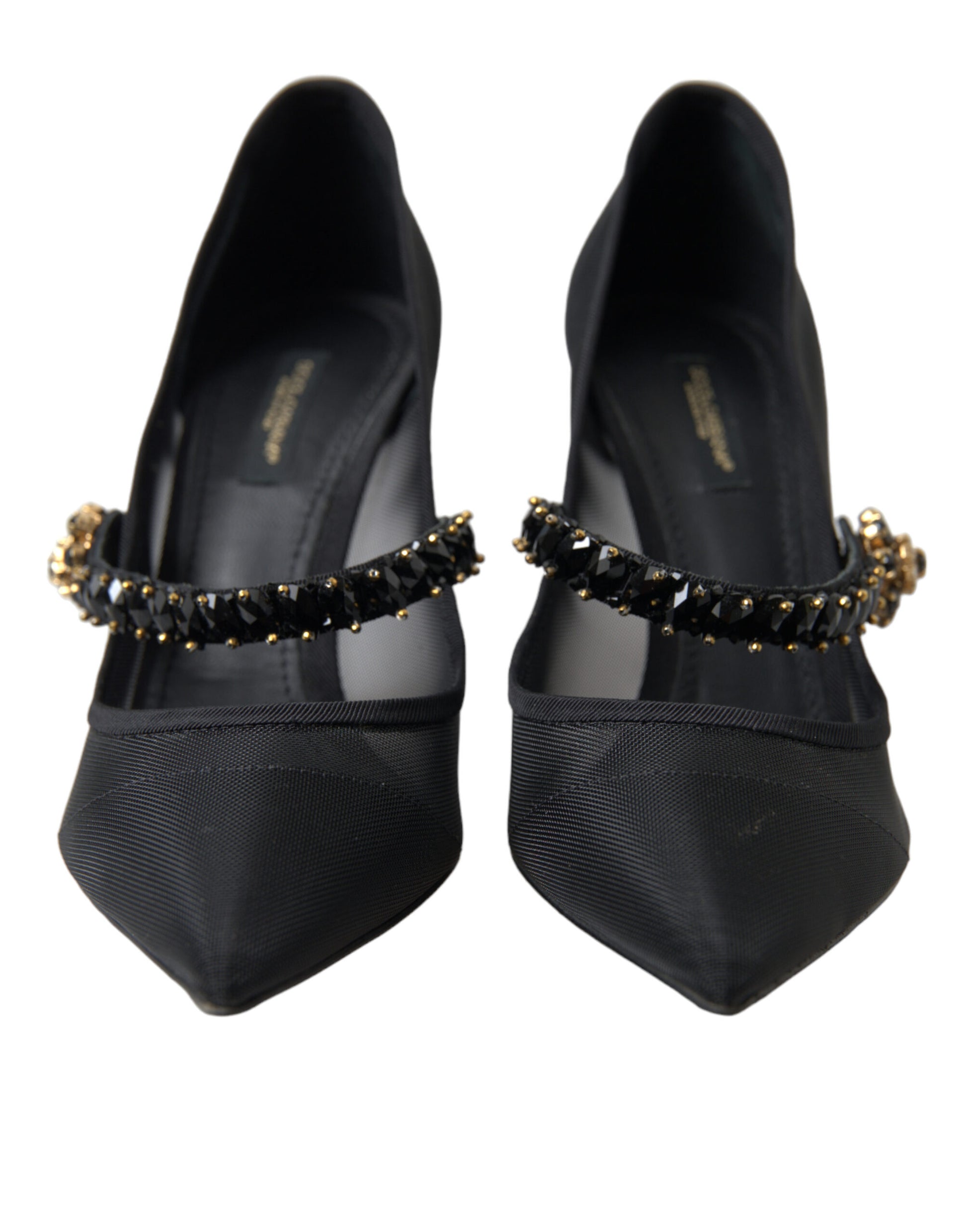 Step into luxury with these stunning black Mary Jane heels by Dolce & Gabbana. These pumps are a testament to timeless elegance, featuring a sparkling crystal-embellished strap and an alluring brooch at the center. The pointed toe design adds a touch of sophistication, making them the perfect choice for a glamorous evening event or a sophisticated outing. Crafted in Italy, these shoes boast a leather sole for superior comfort and durability.