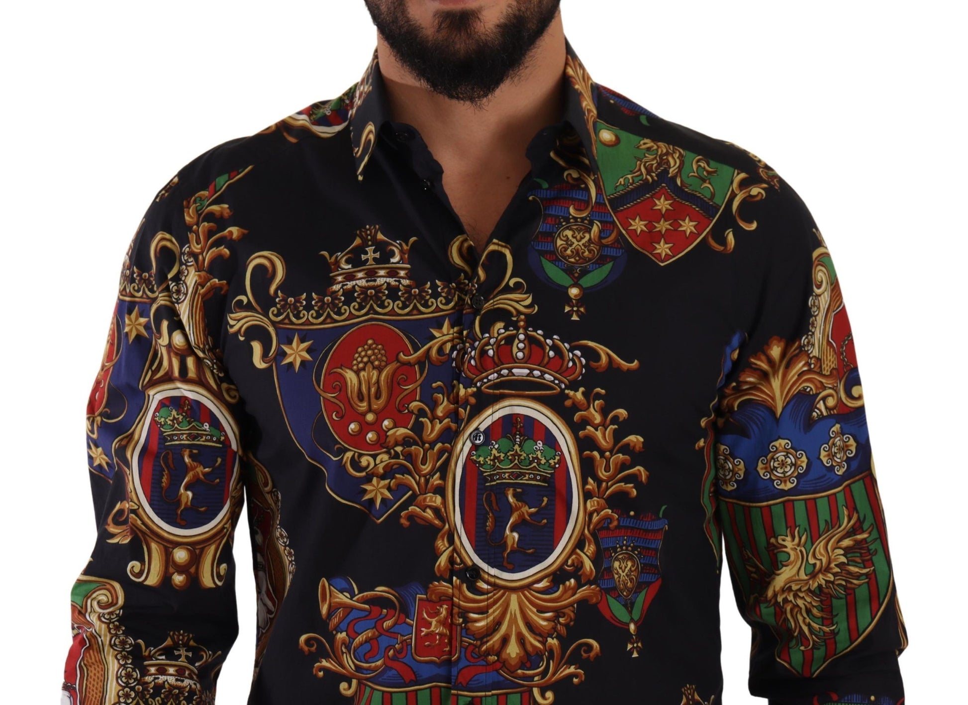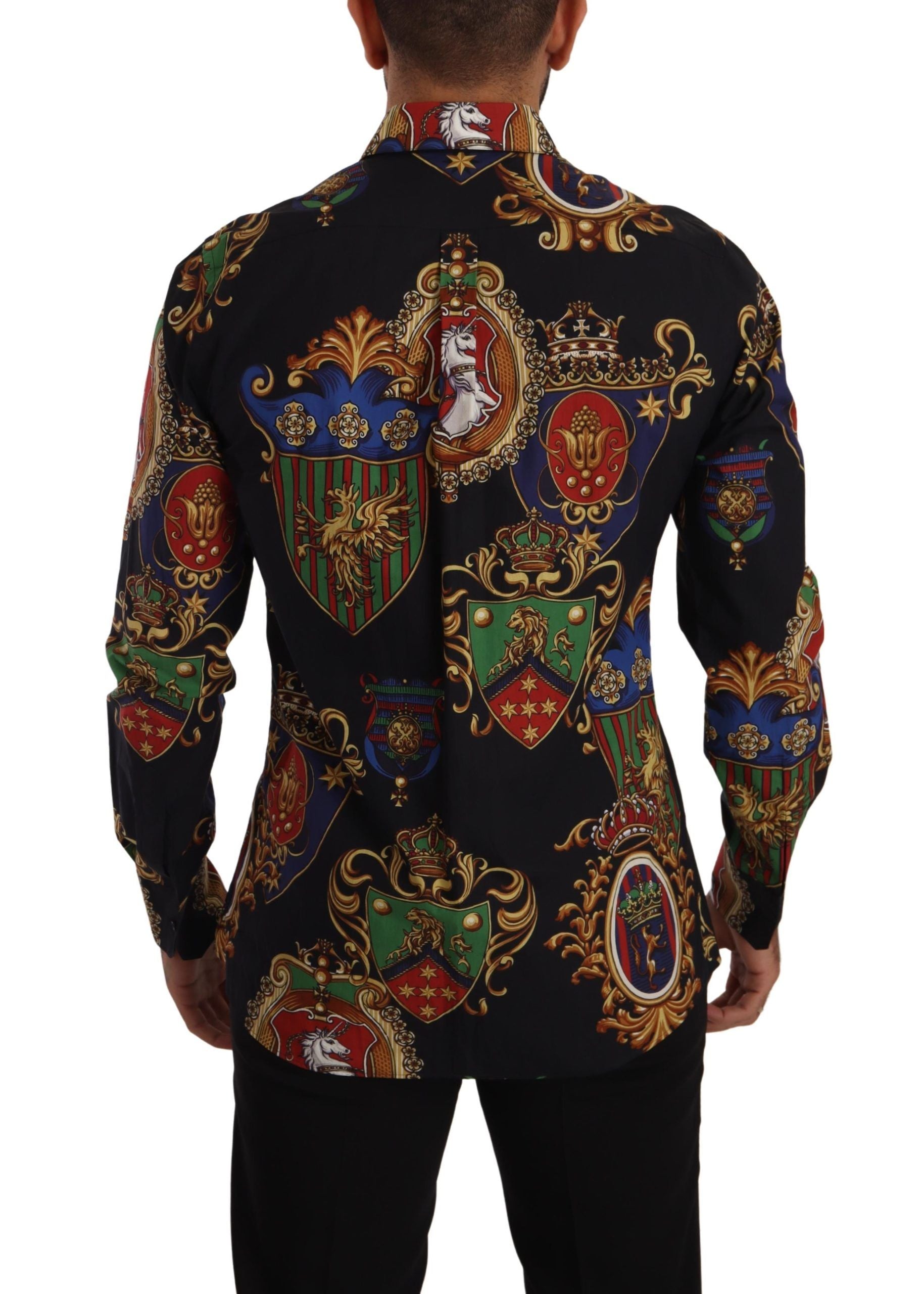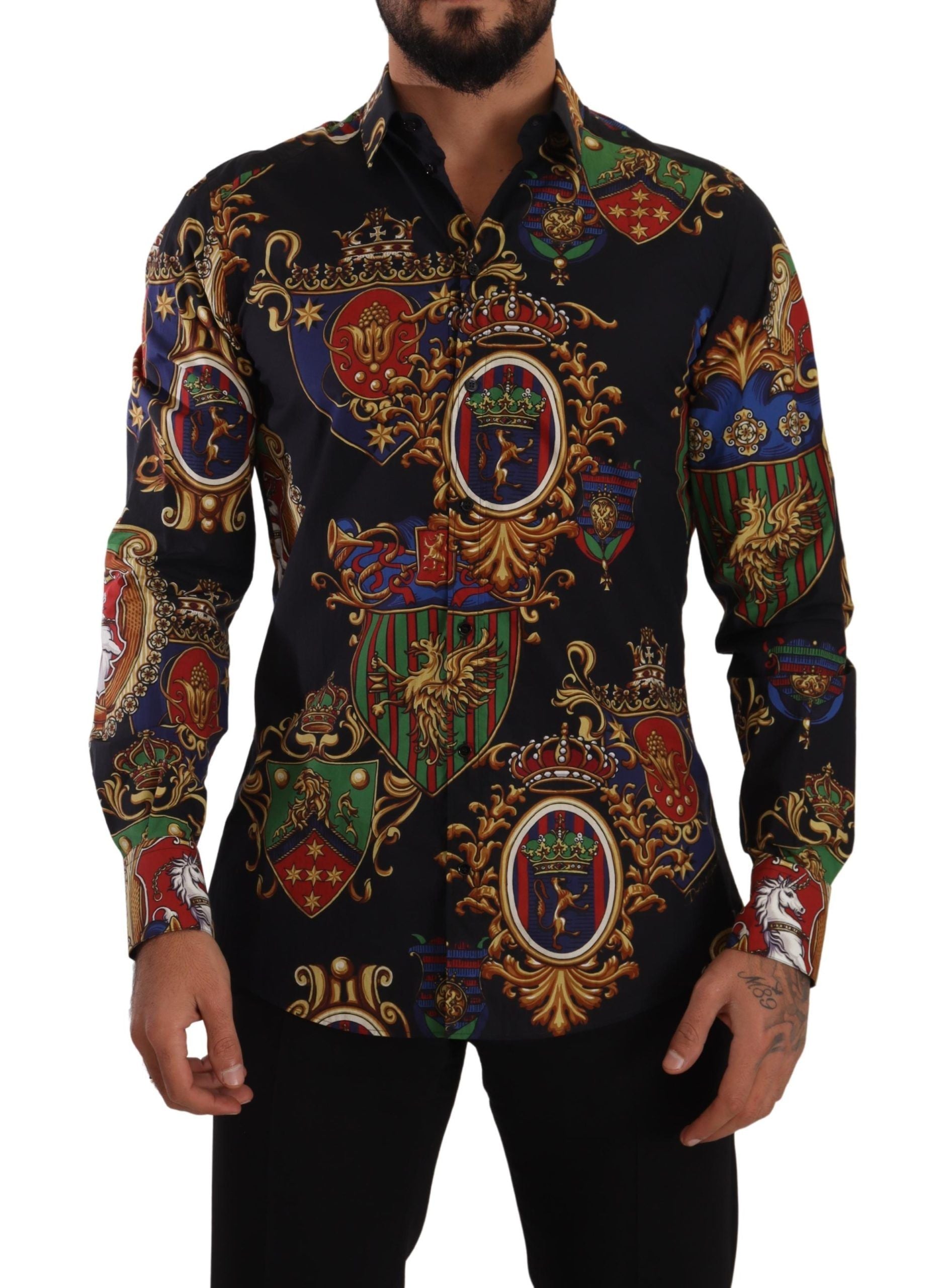 Indulge in the pinnacle of Italian craftsmanship with this exquisite Dolce & Gabbana shirt, designed for those who appreciate the merge of luxury with a touch of unique style. This slim fit marvel is not just a piece of clothing; it’s a statement. Crafted from the finest 100% cotton material, it promises comfort without compromising on elegance. Adorned with a distinctive multicolor medal print, set against a classic black backdrop, it’s bound to turn heads and elevate your wardrobe. Whether dressing for a casual outing or an upscale event, this shirt seamlessly transitions to fit any occasion, perfectly capturing the essence of versatility.