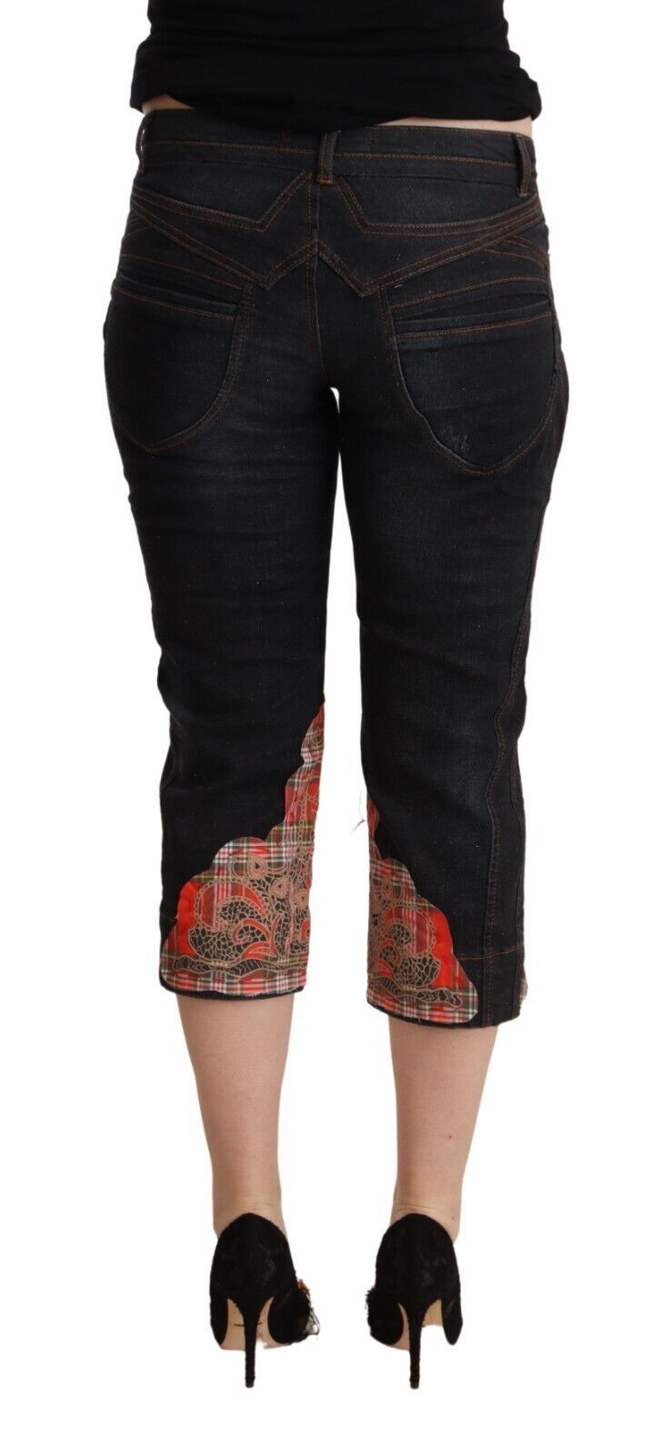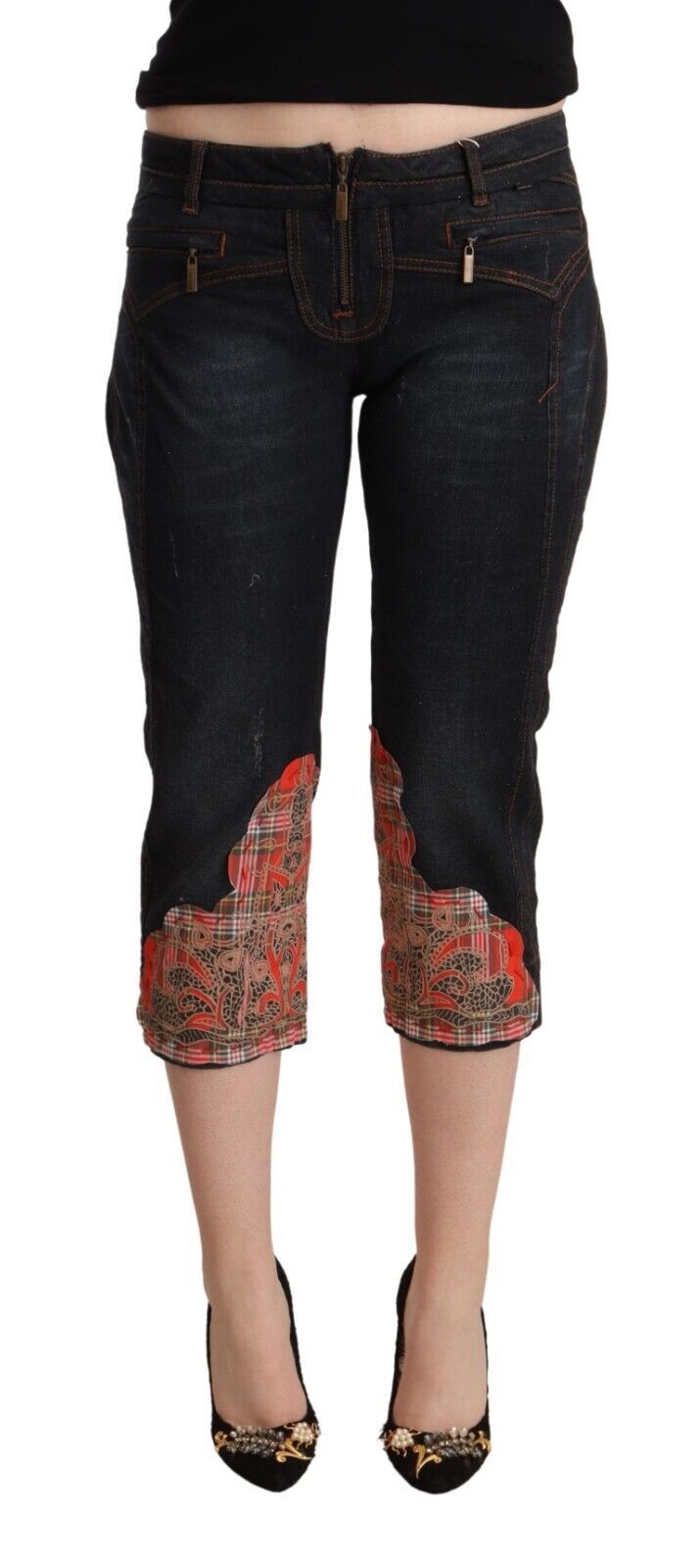 Exude effortless sophistication with our latest arrival, the exquisite Just Cavalli cropped capri jeans. These jeans are perfect for those who value comfort and style, boasting a modern low waist design and crafted from a blend that ensures a flattering fit. Complete with a classic black hue, they feature a sleek zipper and button closure, detailed with the iconic Just Cavalli logo for that touch of luxury.