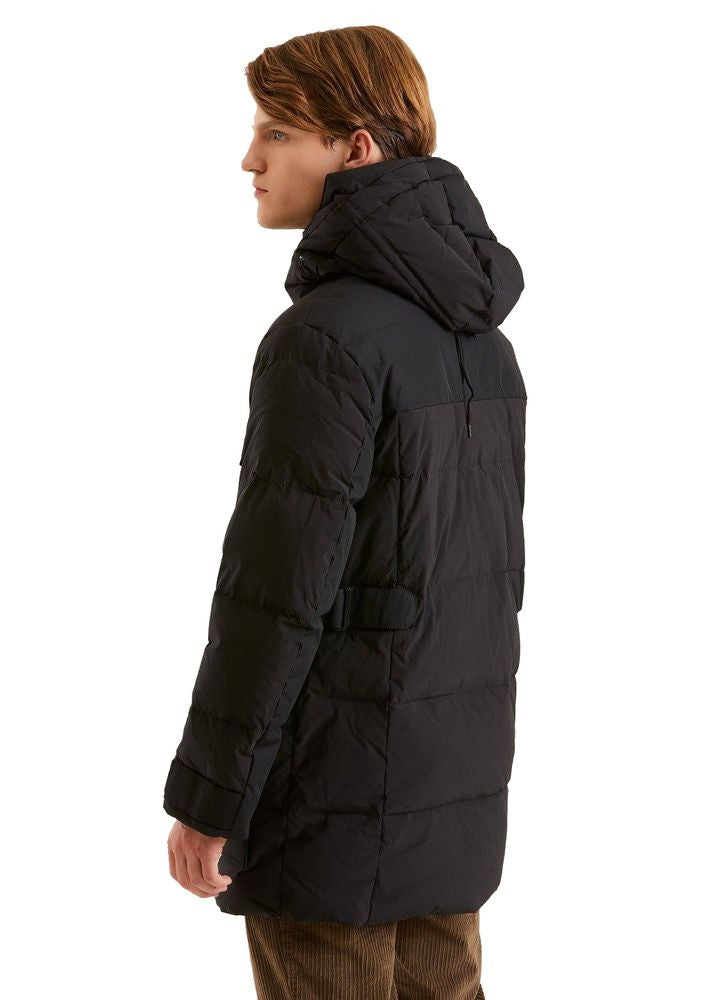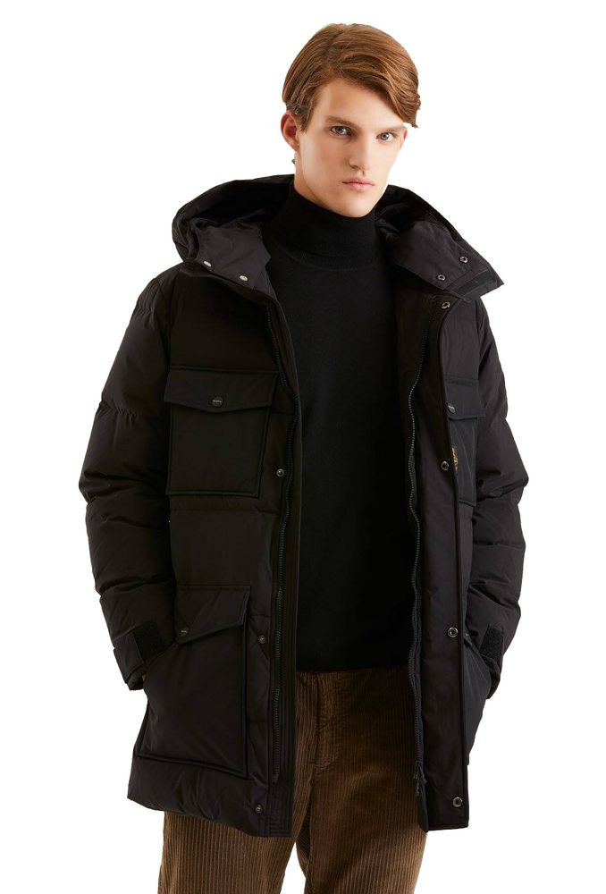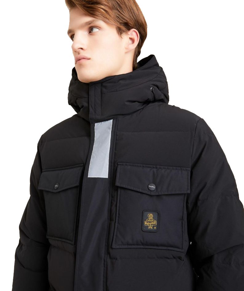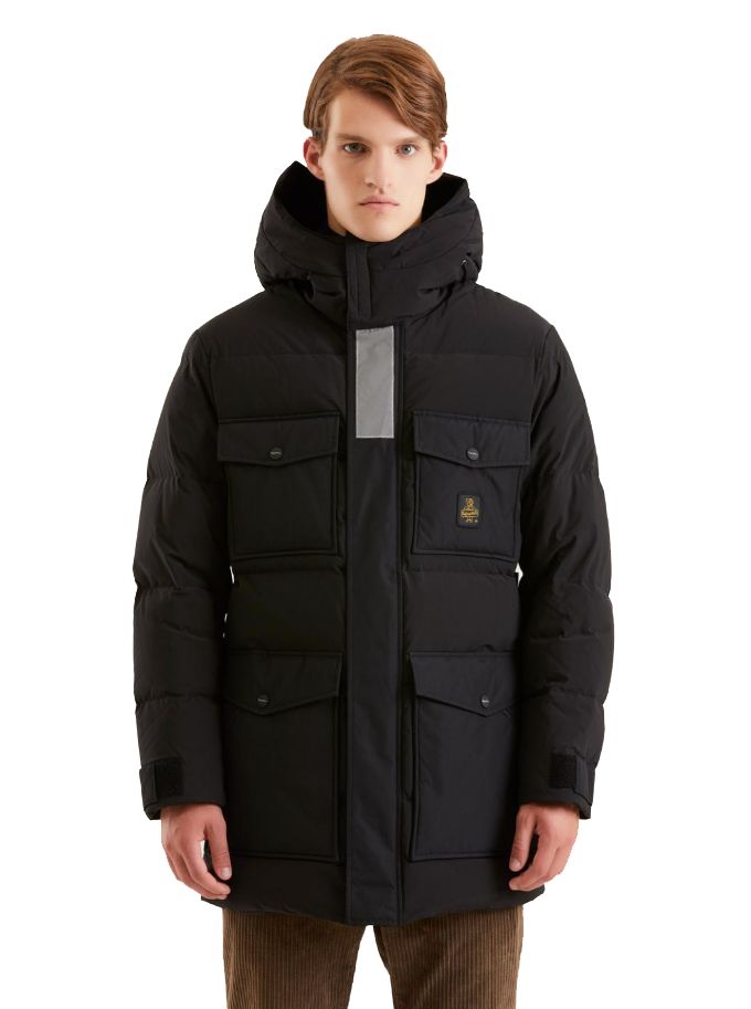 Experience the epitome of style meeting function with our sleek water-repellent parka, designed with an internal polyurethane anti-drip membrane to keep you dry in all conditions. The detachable maxi hood includes a high collar for additional warmth and protection, and our tailored double front maxi pockets provide ample storage. Reflective details on the front flap increase visibility and safety, while the custom double-slider zipper ensures ease of wear.