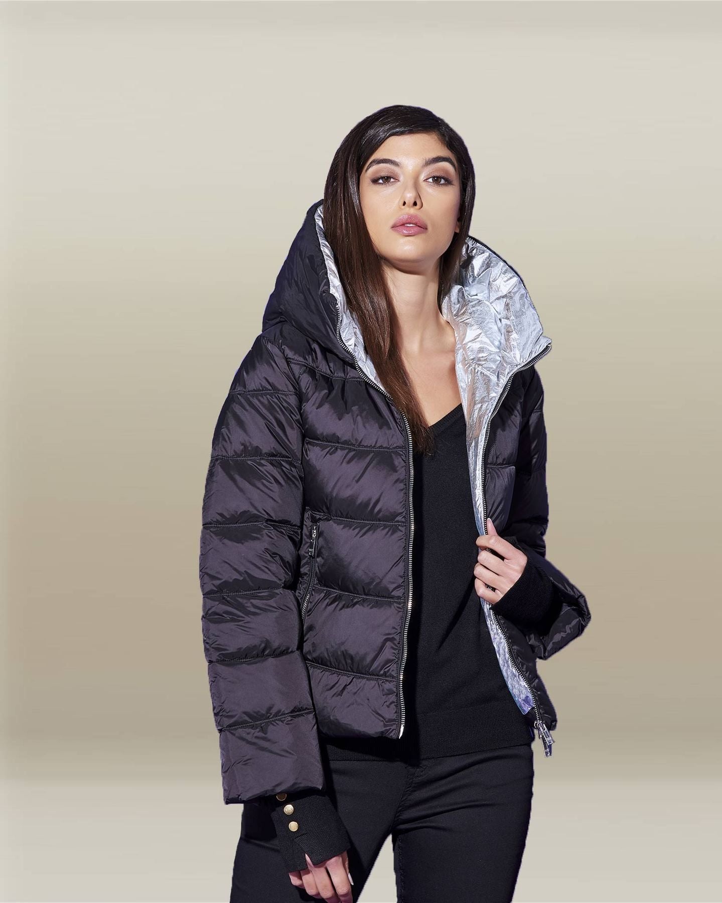 Step into the chill with our chic short padded down jacket – the optimal blend of warmth, comfort and style. The sleek black design is versatile, while the front zip closure and cozy hood ensure practicality without compromising on elegance. Perfect for keeping you toasty and fashionable throughout the cooler seasons.
