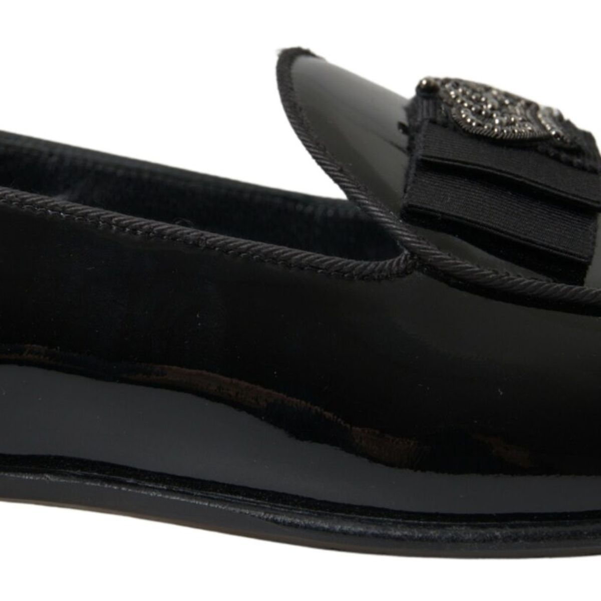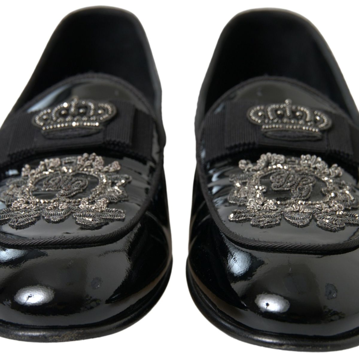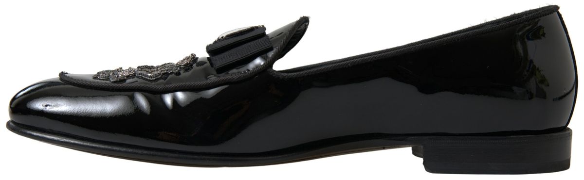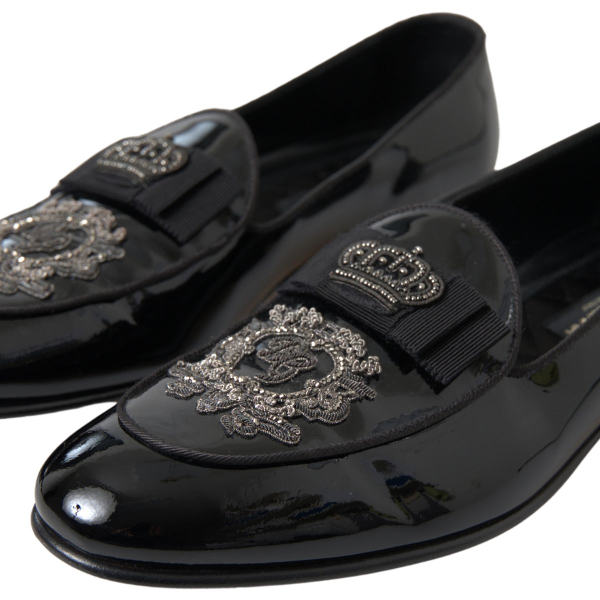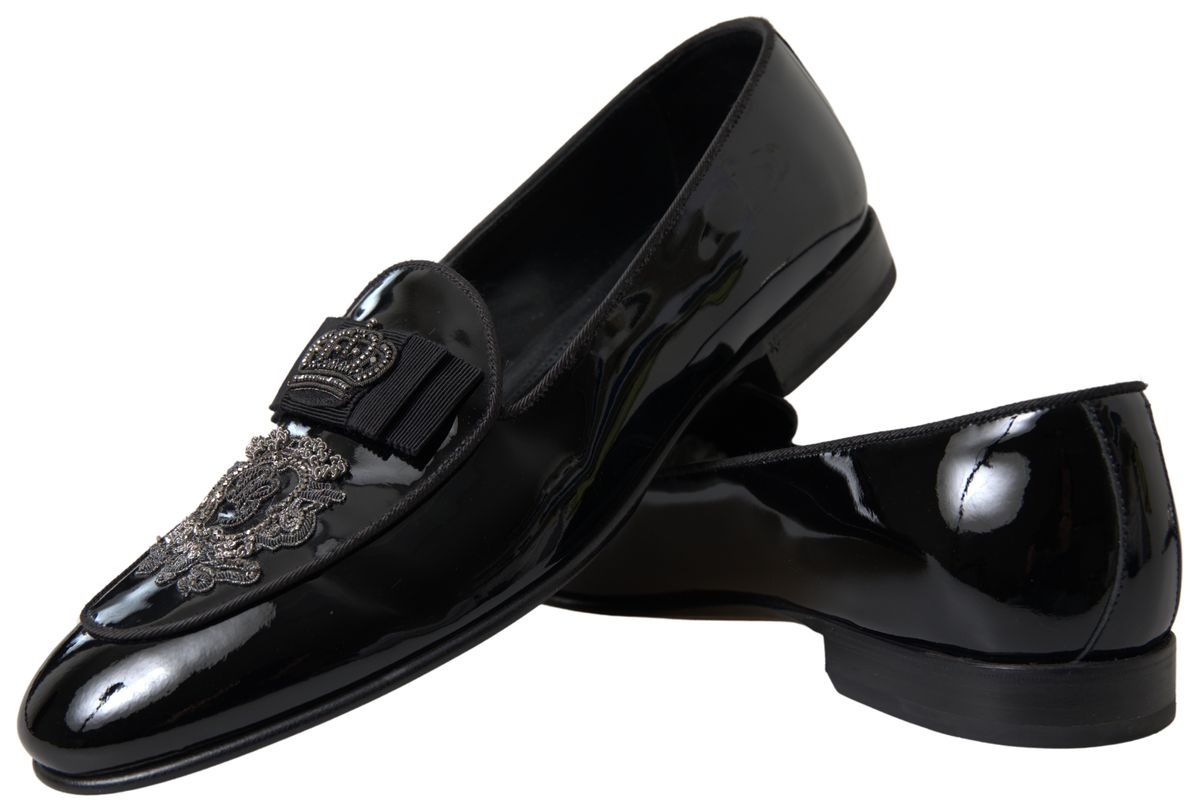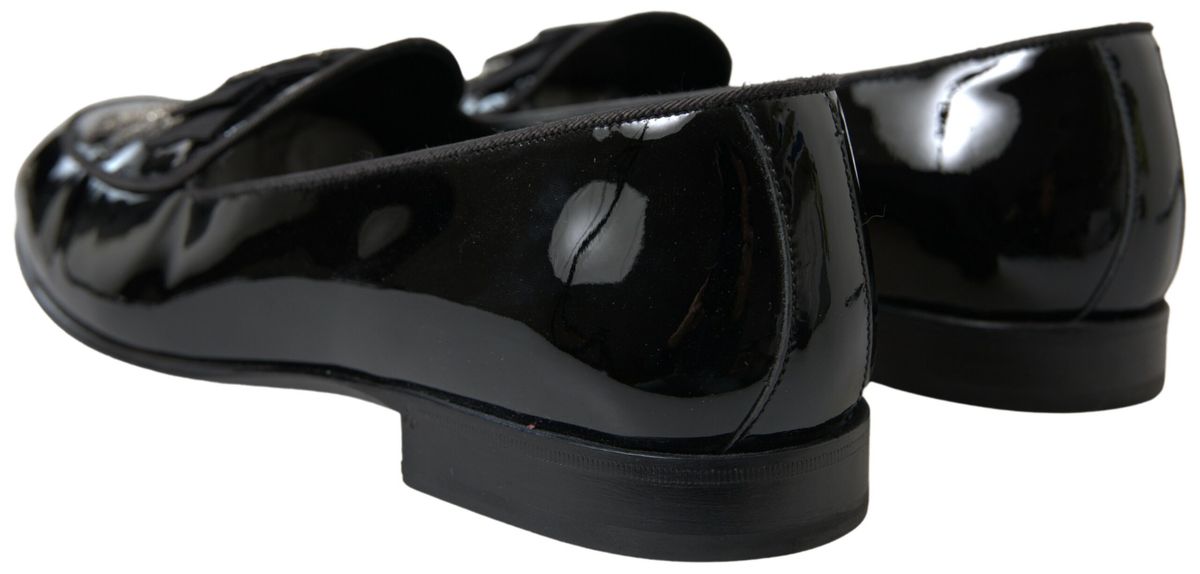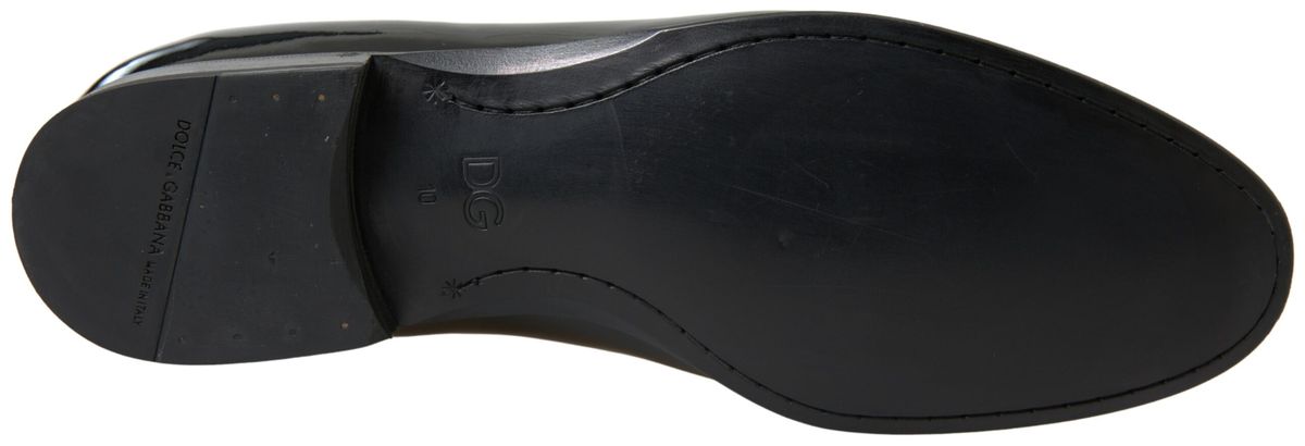 Embrace the epitome of luxury Italian craftsmanship with these exquisite loafers by Dolce & Gabbana. Perfect for discerning gentlemen who appreciate the finer details in fashion, these brand new, authentic slides boast a sleek black and silver design that’s sure to turn heads. The pure patent leather construction promises an opulent shine, enhancing their timeless appeal, while the detailed logo speaks of the high-end heritage of Dolce & Gabbana. Made in Italy, these loafers exhibit an unparalleled level of quality and elegance, making them an essential addition to your formal footwear collection.