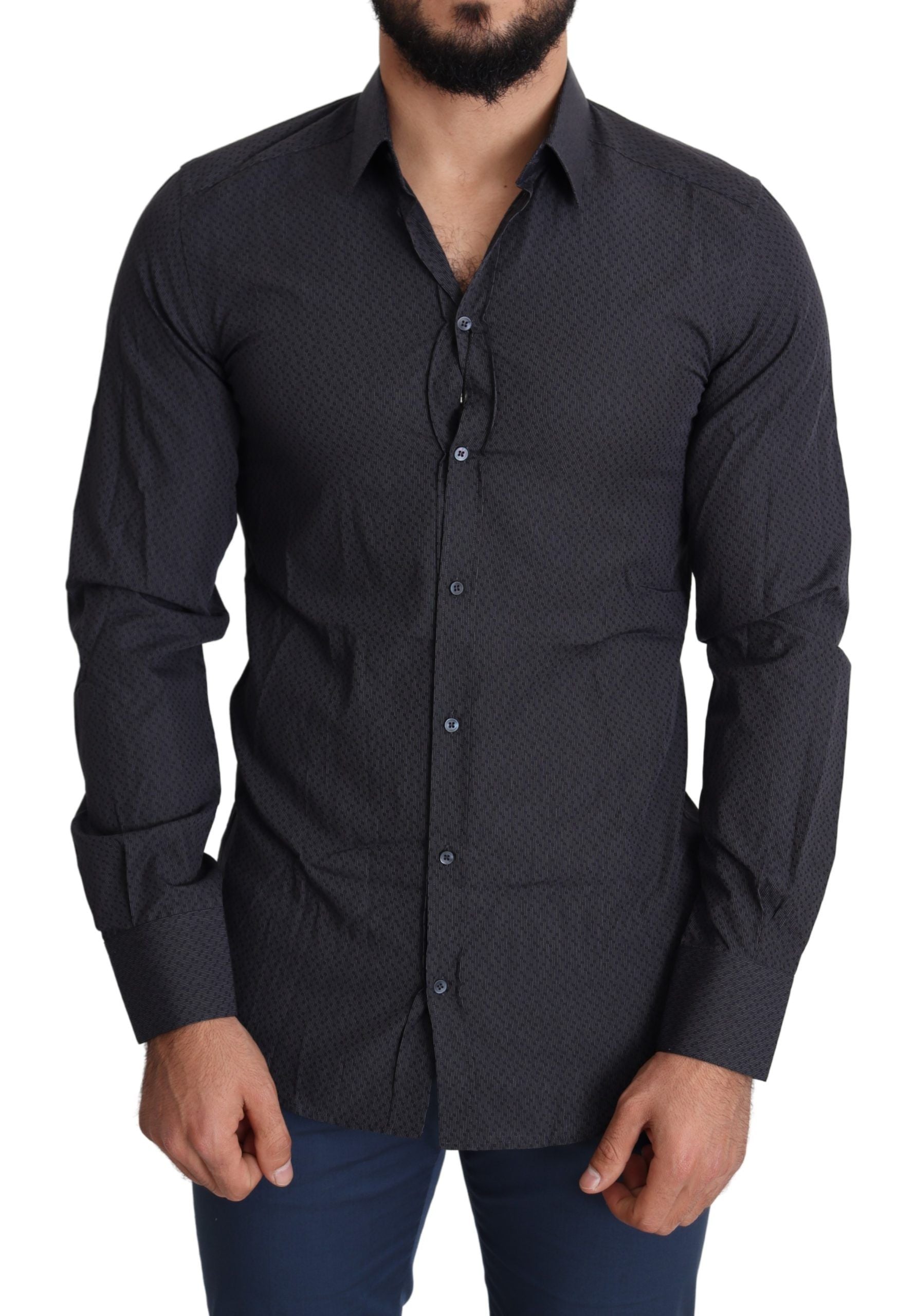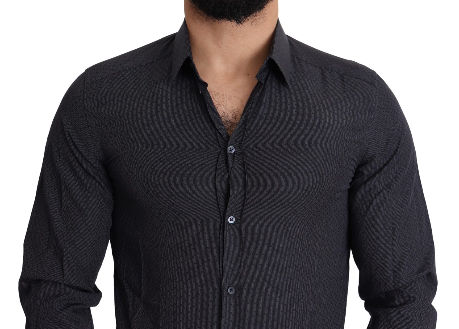 Discover the epitome of Italian sophistication with this stunning Dolce & Gabbana black dress shirt. Crafted from the finest 100% soft cotton, this shirt is a testament to elegance and style. The slim fit cut ensures a sleek silhouette, while the classic spread collar and one-button barrel cuffs add a touch of traditional charm. Finished with a front button closure and subtle logo details, it’s perfect for any formal event or stylish outing. Made in Italy, it’s an authentic designer piece that exudes luxury.