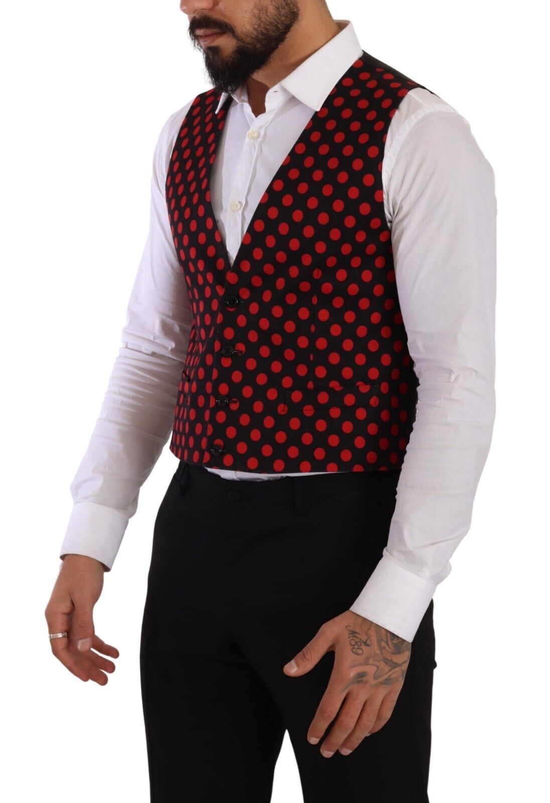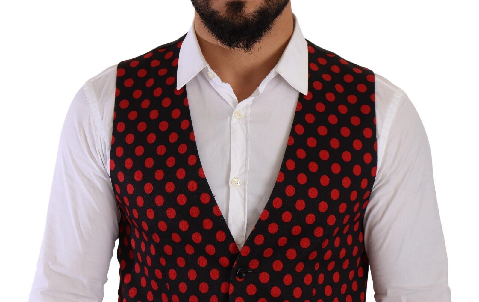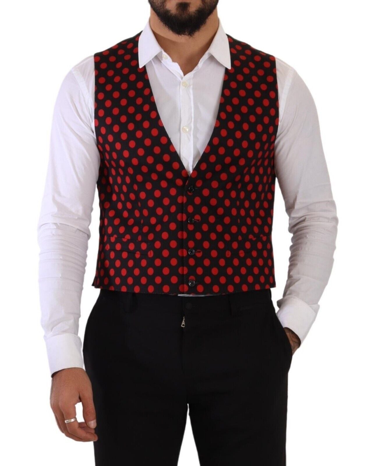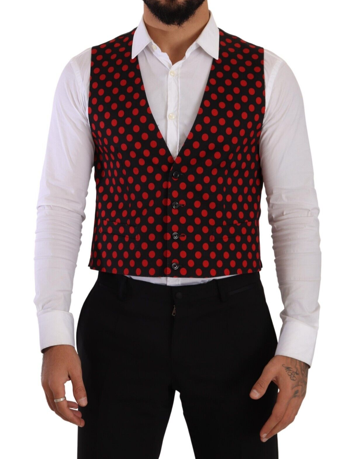 Make a striking impression at your next posh event with this authentic Dolce & Gabbana Single-breasted Dress Vest. Immaculately designed, it features a classic black hue with playful red polka dots, infusing a touch of whimsy into formal attire. Secured with a front button closure and showcasing the iconic brand logo, this vest is a testament to Italian craftsmanship.