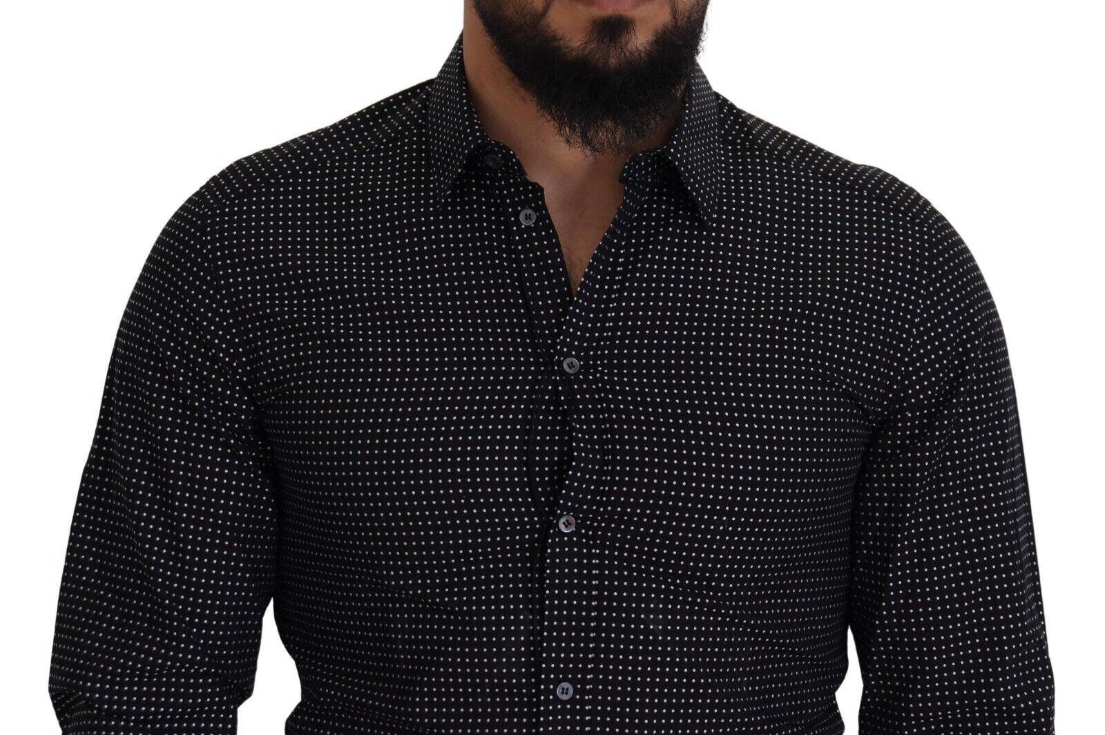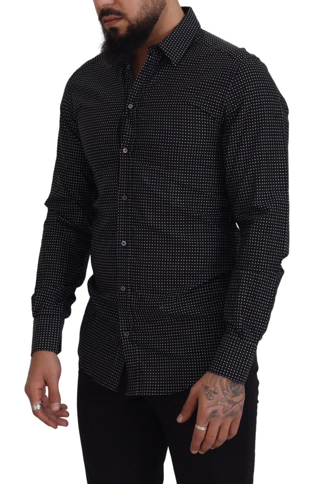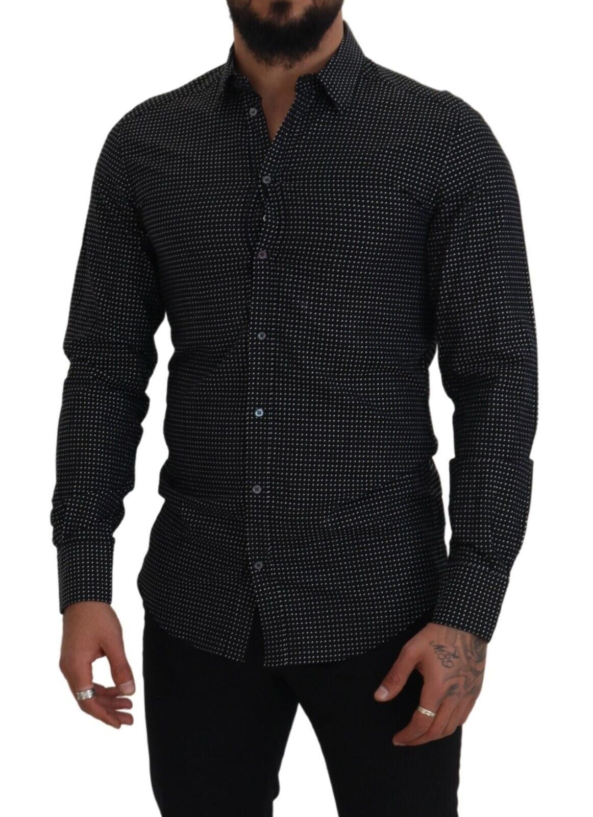 Indulge in the superior Italian craftsmanship of Dolce & Gabbana with this exquisite black dress shirt adorned with stylish polka dots. This 100% authentic slim-fit shirt is designed to bring a touch of classic elegance to your wardrobe, making it perfect for any formal or high-fashion occasion. Tailored from the finest cotton, it promises both comfort and durability. The shirt embodies a timeless appeal with a modern twist, featuring a classic neck, long sleeves, and a sleek button-down closure.