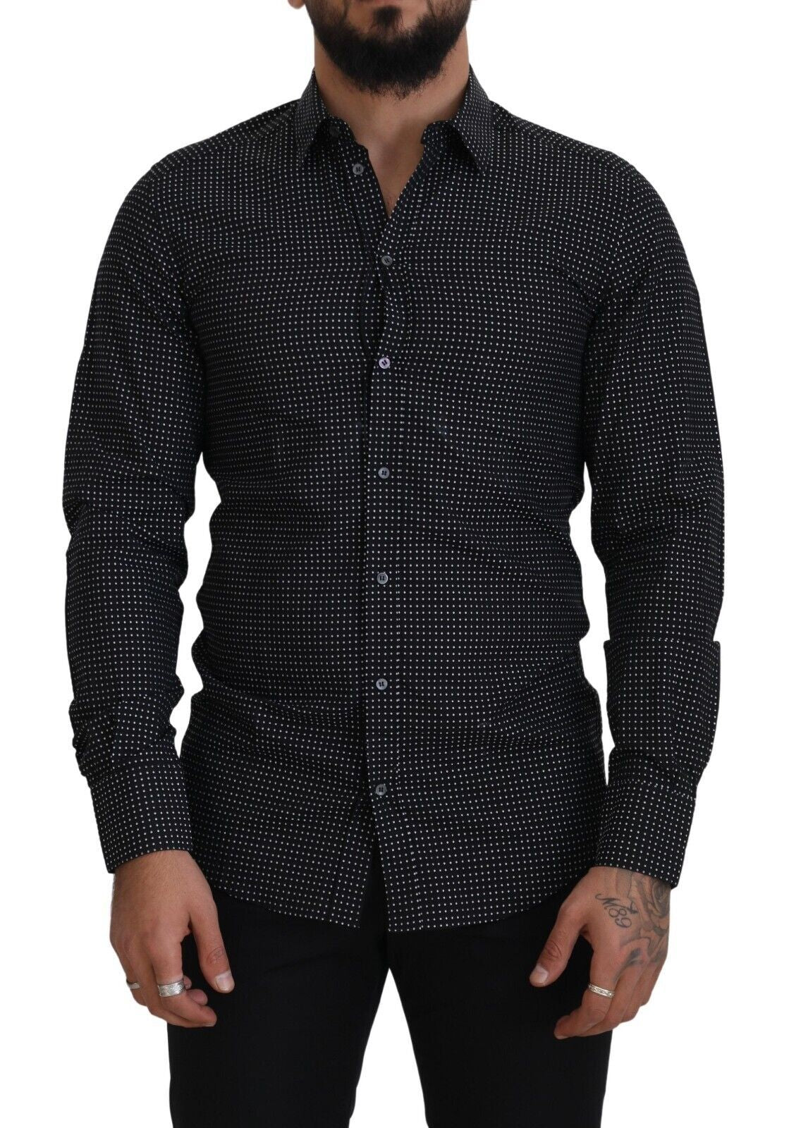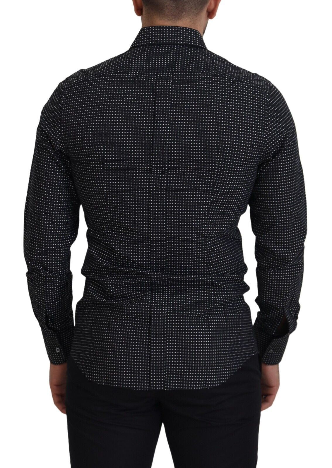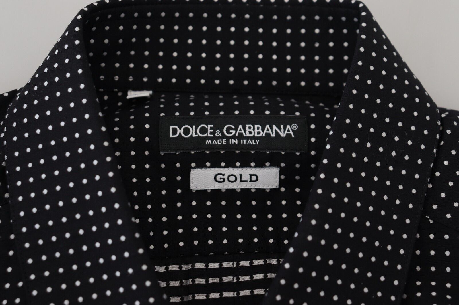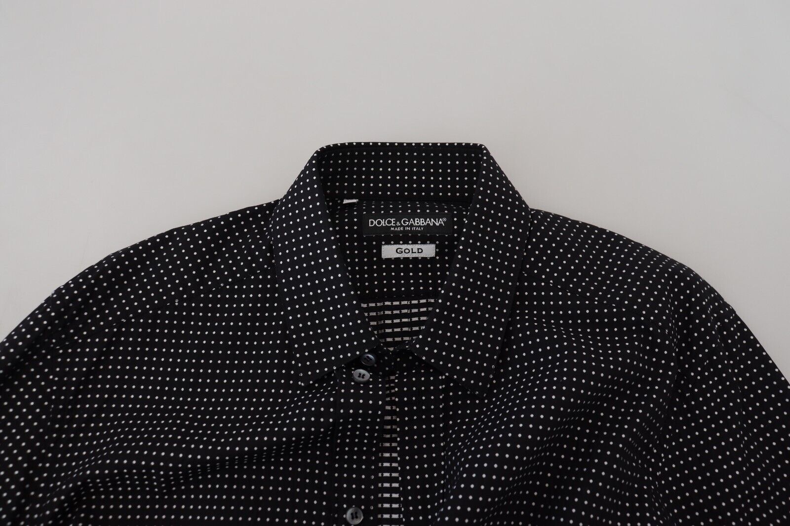 Indulge in the superior Italian craftsmanship of Dolce & Gabbana with this exquisite black dress shirt adorned with stylish polka dots. This 100% authentic slim-fit shirt is designed to bring a touch of classic elegance to your wardrobe, making it perfect for any formal or high-fashion occasion. Tailored from the finest cotton, it promises both comfort and durability. The shirt embodies a timeless appeal with a modern twist, featuring a classic neck, long sleeves, and a sleek button-down closure.