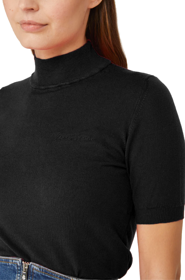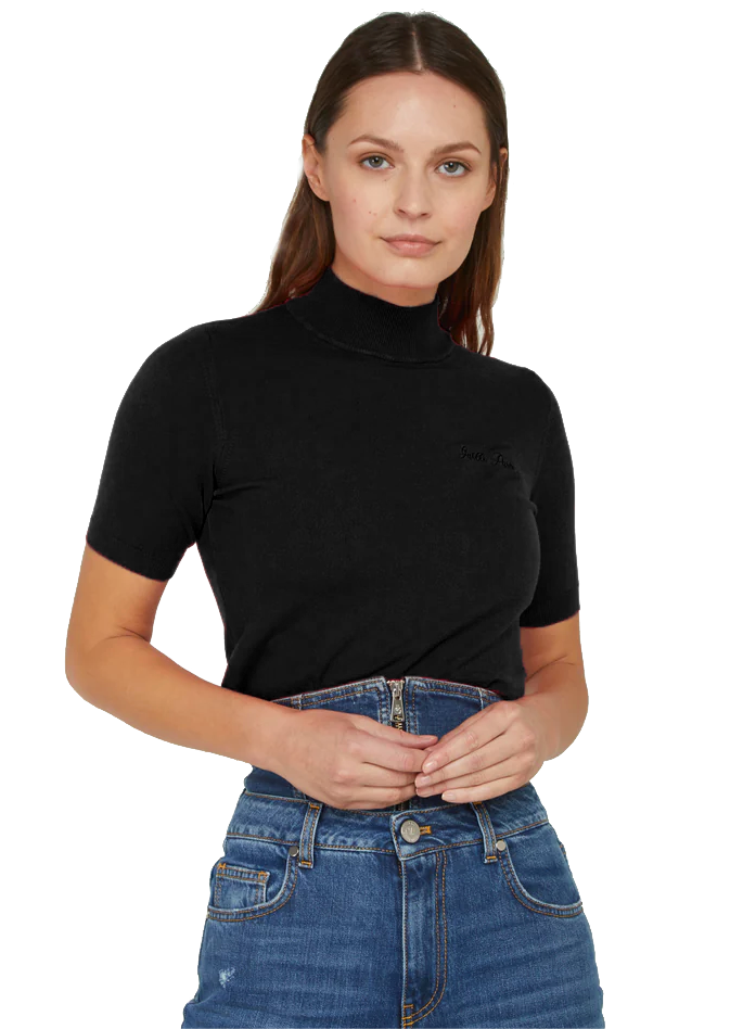 Experience the epitome of chic comfort with this sophisticated short-sleeved turtleneck sweater, featuring an exquisitely embroidered logo on the chest. Crafted with a blend of high-quality materials, this piece is a testament to Italian elegance and style.