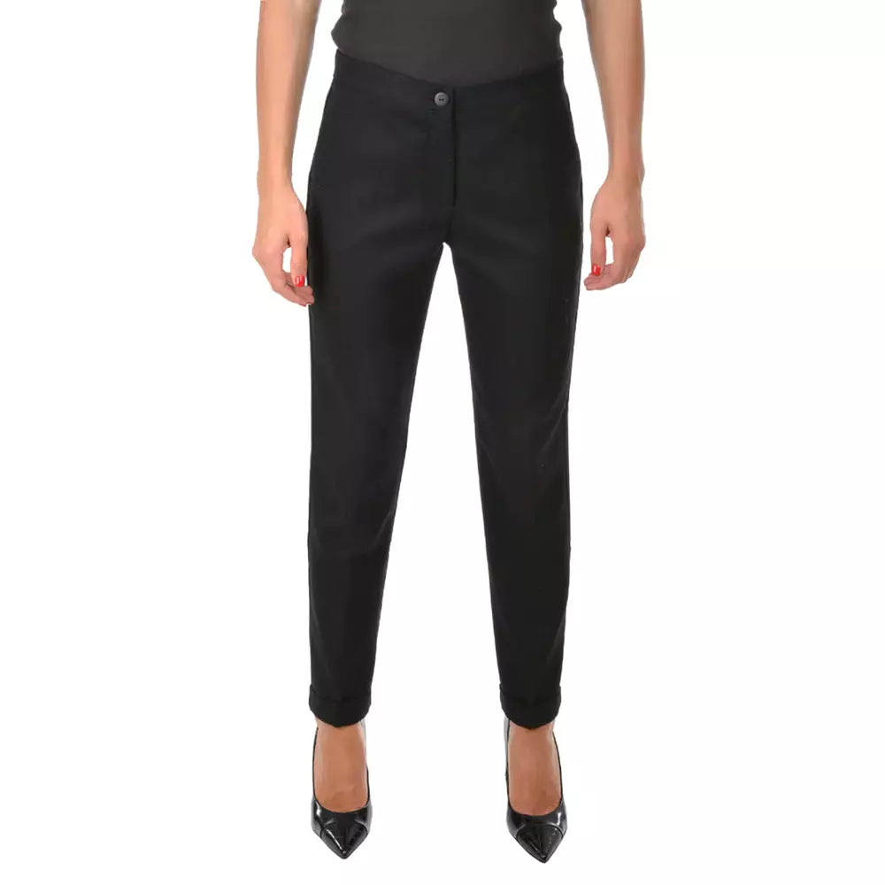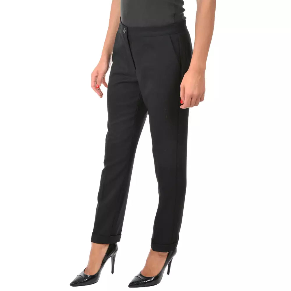 Elevate your wardrobe with these sophisticated cigarette trousers that blend style and comfort seamlessly. Featuring a smooth button and zip closure, these trousers are tailored to offer a flattering fit. The design includes two side pockets for functionality while showcasing a discreet metal logo on the back for an added touch of elegance.