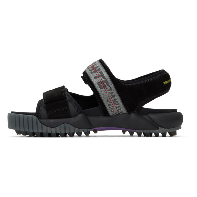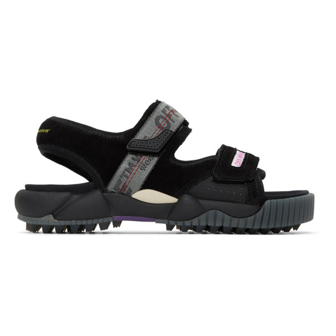 Elevate your adventuring style with the latest creation from Off-White: the robust trekking sandals. Fashionable yet functional, these sandals feature a durable polyester-suede blend, punctuated with the iconic brand logo emblazoned on the laces, embodying a bold aesthetic with a nod to utility. The sturdy rubber sole is designed to grip terrain, making these ideal for the modern explorer with a taste for high-end fashion. Step confidently into the wild or urban jungle with Off-White’s signature touch.