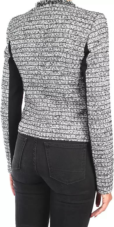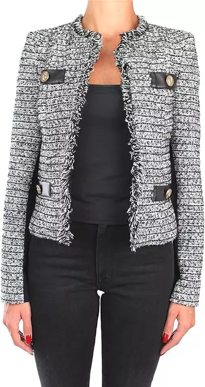 Discover sophistication with this chic knit jacket, perfect for elevating any ensemble. Featuring a unique raw cut collar and convenient hook closure, this piece is designed to offer both style and comfort. Pockets accented with eco-leather edges and a tasteful silver button add a touch of elegance, while the lined interior ensures a smooth, high-quality finish. Crafted from a harmonious blend of fibers, this jacket is a versatile addition to your wardrobe.