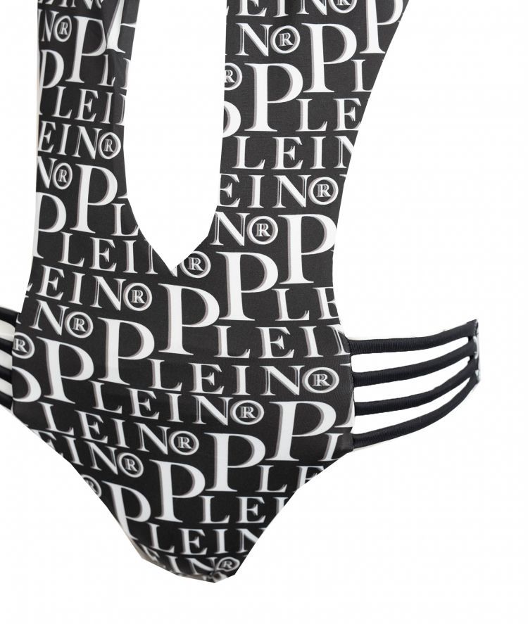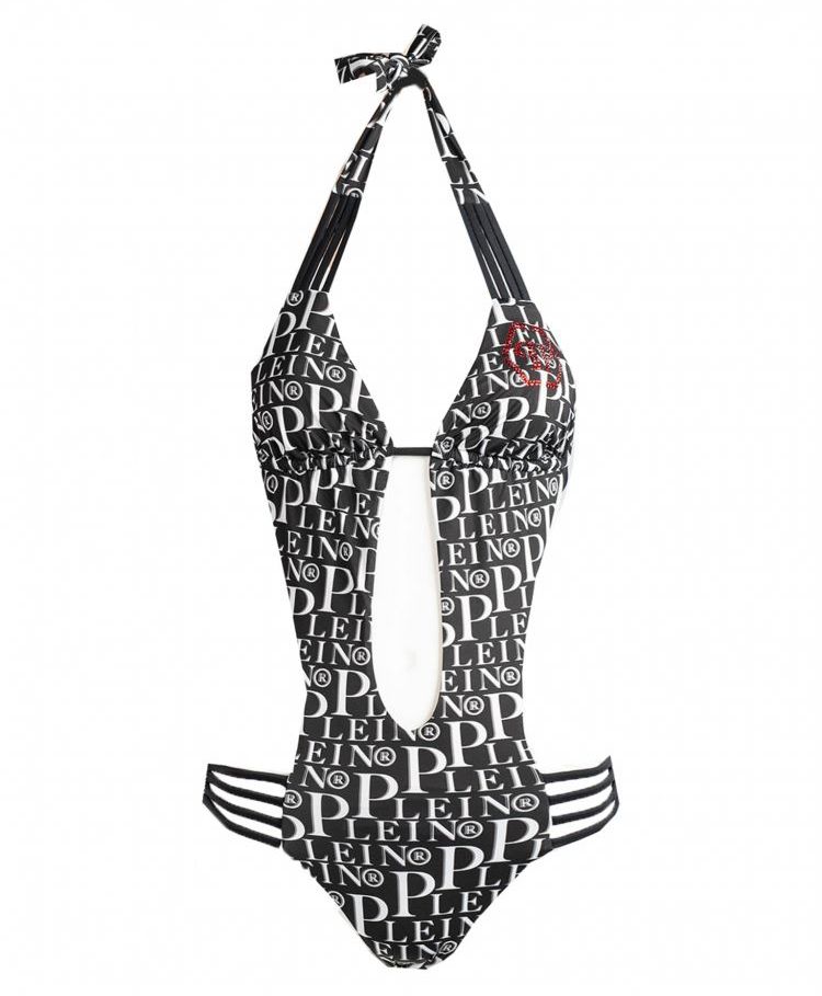 Elevate your beachside ensemble with this elegant one-piece trikini, adorned with striking logo prints that cover its sleek silhouette. A lustrous brass logo distinctly embellishes the chest area, adding a touch of luxury to your swimwear collection. Perfect for making a statement under the sun.