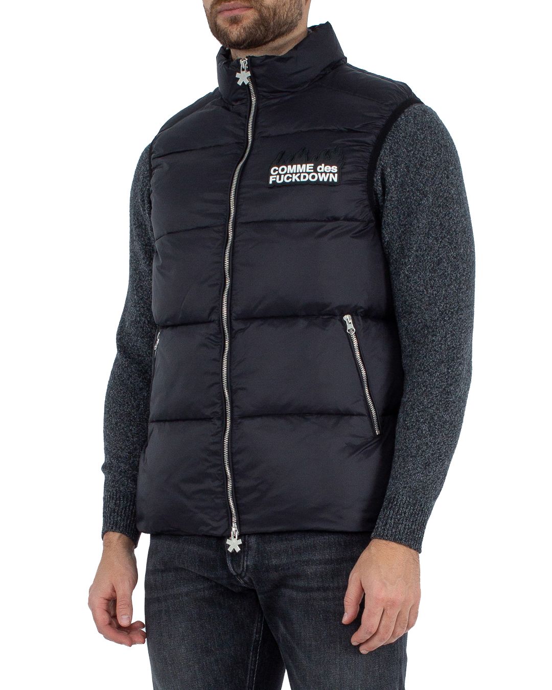 Elevate your off-duty style with the bold assertiveness of Comme Des Fuckdown’s padded sleeveless gilet. This sleek black number, crafted from premium 100% polyester, promises to keep you at the forefront of urban fashion with its technical fabric construction and statement-making rubber logo on the chest. Functional and effortlessly trendy, it sports practical zip pockets for your essentials. Made for the daring, wear it to make your mark.