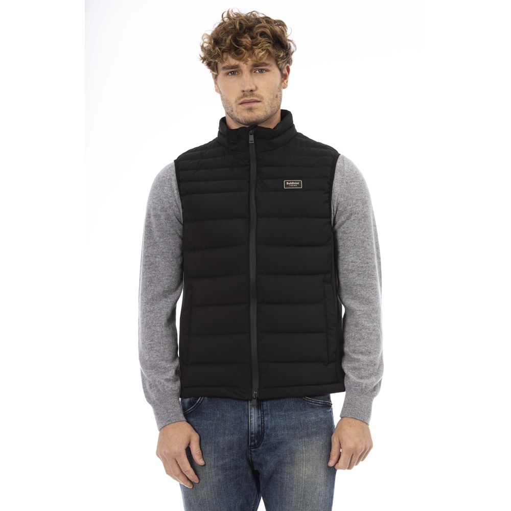 Experience the sleek fusion of sophistication and practicality with Baldinini Trend’s meticulously quilted vest. This classic black piece is accentuated with a striking contrast chest patch, adding an edge to your wardrobe. The side pockets offer utility, while the zip closure ensures a secure fit. Perfect for layering, this vest is an embodiment of modern style with an Italian twist.