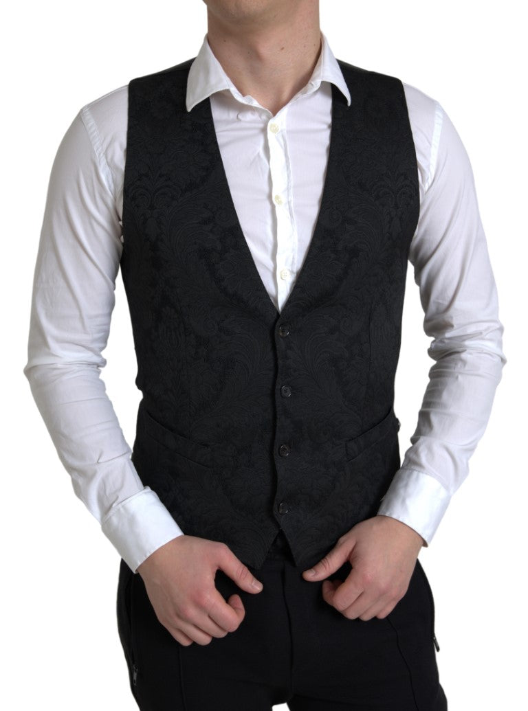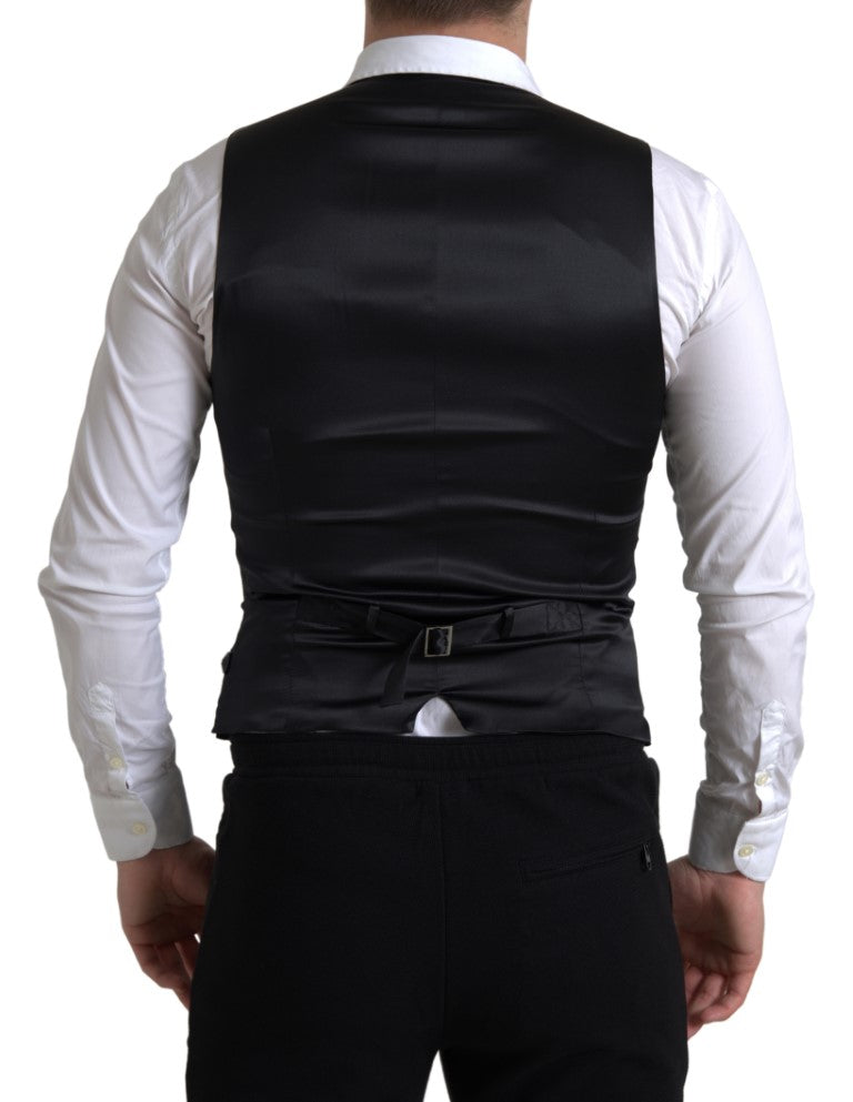 Discover elegance and sophistication with our exquisite single-breasted dress vest by Dolce & Gabbana. Tailored from a luxurious blend of fabrics, this vest ensures a sharp silhouette for any formal occasion. Its sleek black color is versatile and timeless, designed for the discerning gentleman who appreciates the finest in fashion craftsmanship. Radiate confidence at your next event with this essential piece of sartorial elegance.