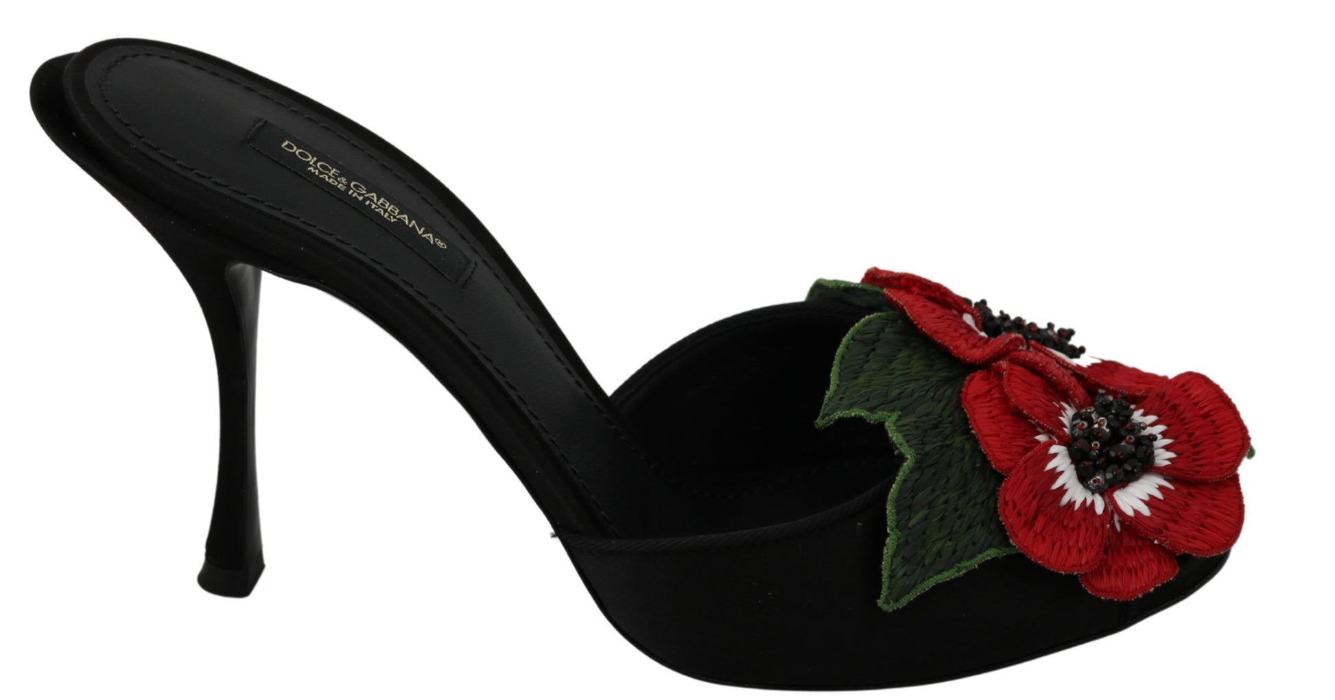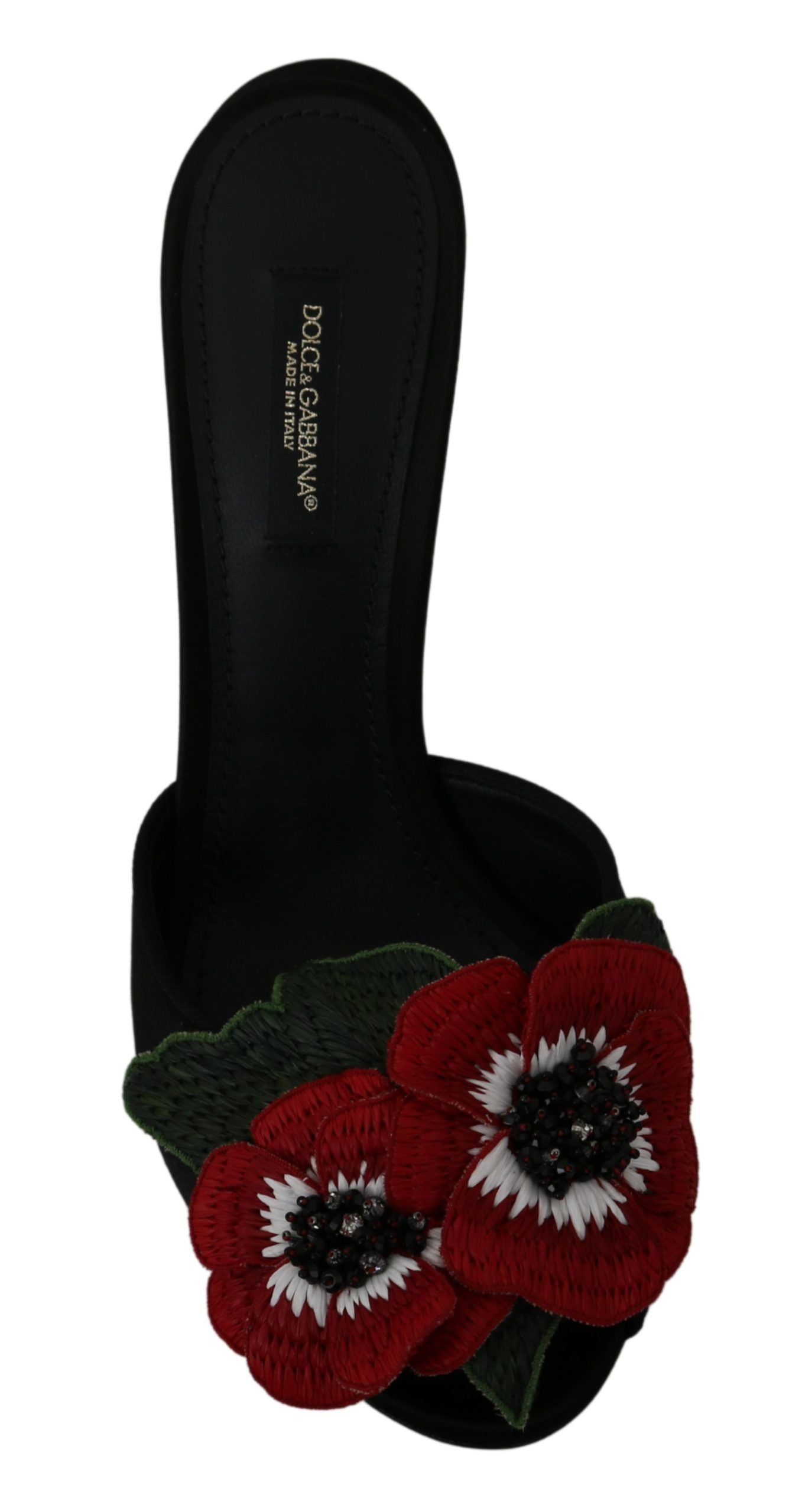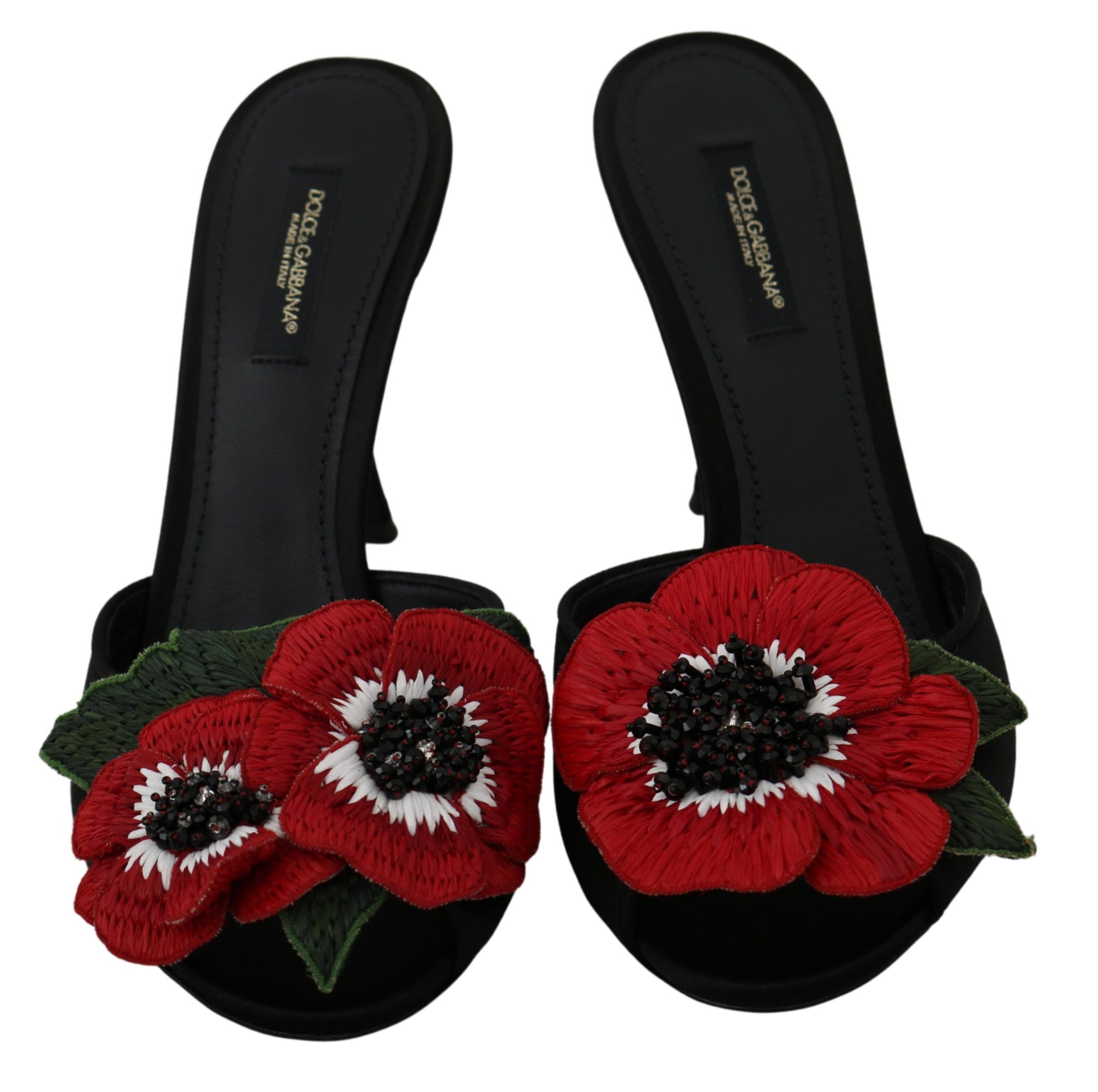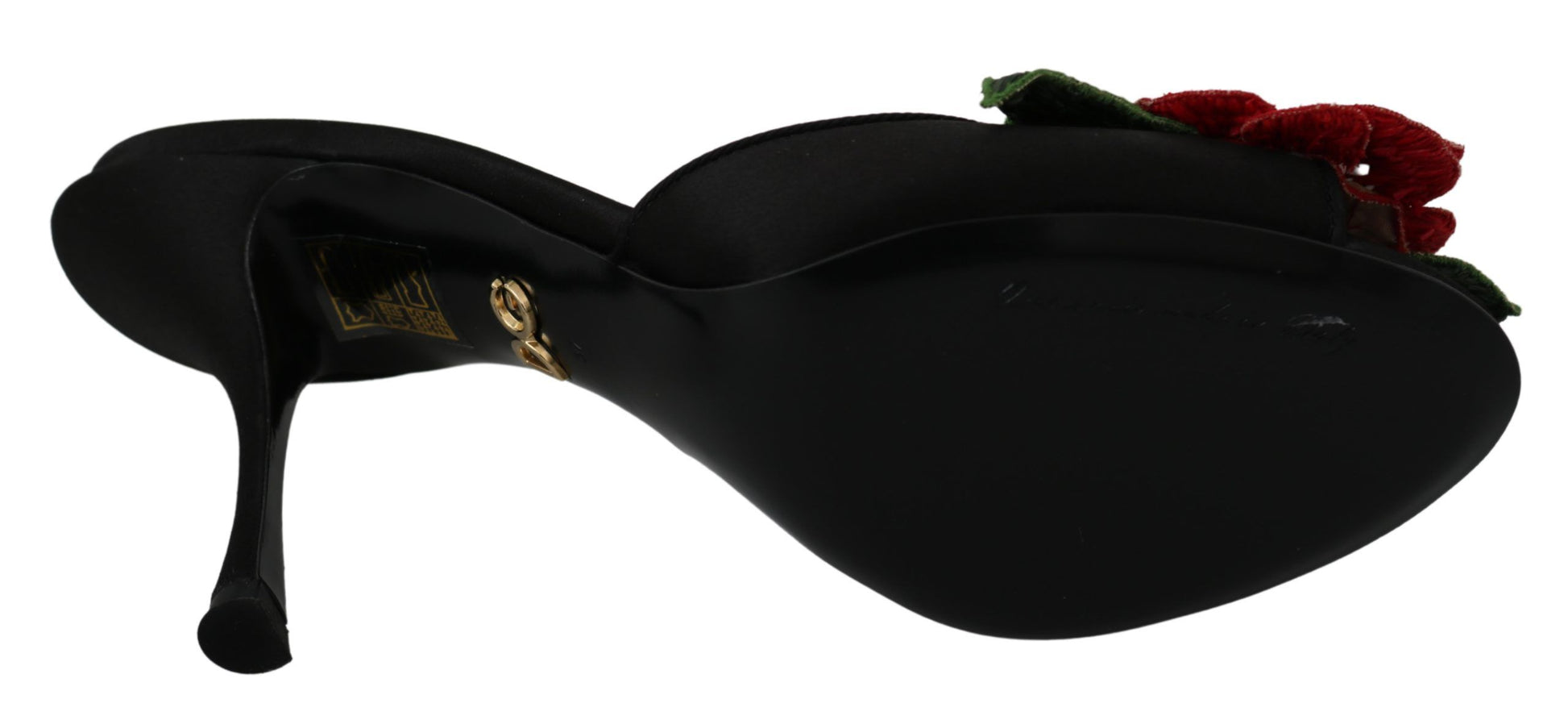 Discover the epitome of Italian elegance with these stunning slide-on sandals from Dolce & Gabbana, a perfect blend of luxury and style. These open-toe heels feature a lavish black silk composition with exquisite red rose detailing and sparkling crystal accents. Crafted for comfort and lasting quality, these sandals boast a genuine leather sole and are adorned with the unmistakable logo details of Dolce & Gabbana. Indulge in the refinement and craftsmanship Made in Italy with these beautiful shoes.