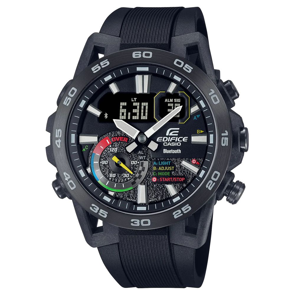 Type of mechanism: QUARTZ. Display: ANALOG/DIGITAL. Material Of Case: STAINLESS STEEL. Colour Of Case: BLACK. Material Of Bracelet: RESIN. Colour Of Bracelet: BLACK. Dial Colour:BLACK. Glass type: MINERAL. Clousure: BUCKLE. Water resistence: 10ATM. Diameter dial: 48MM. Special Functions:CASIO EDIFICE-PHONE FINDER-ON AND OFF BUTTON OPERATION TONE, LOW BATTERY WARNING, MULTIPLE ALARM, 5 ALARMS, BLUETOOTH, STEEL CASE, COMPLETE AUTOMATIC CALENDAR, CHRONO 1/1000, 1 HOUR, 3-FOLD BUCKLE ONE TOUCH, WORLD TIME IN 40 COUNTRIES, NORMAL 12/24 HOUR TIME DISPLAY, LAP MEMORY 200, FULLY AUTOMATIC LED LIGHT, NEO-DISPLAY
