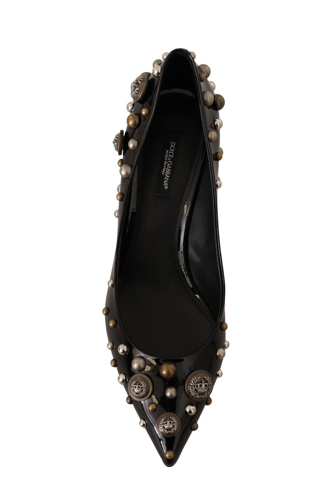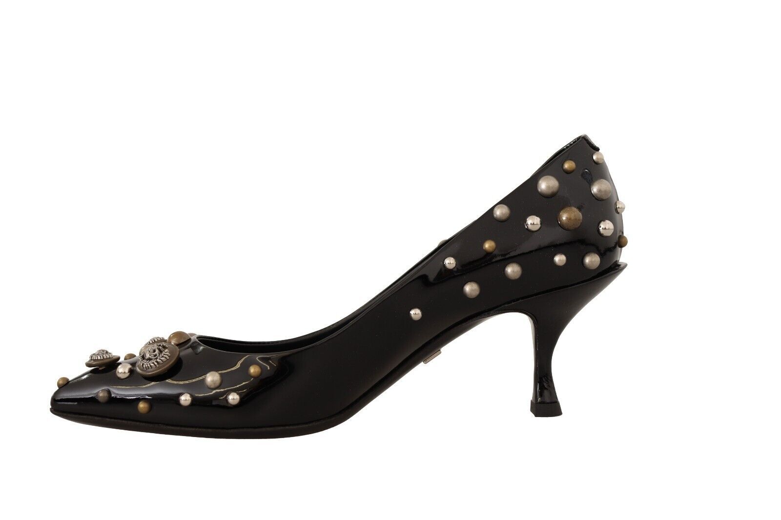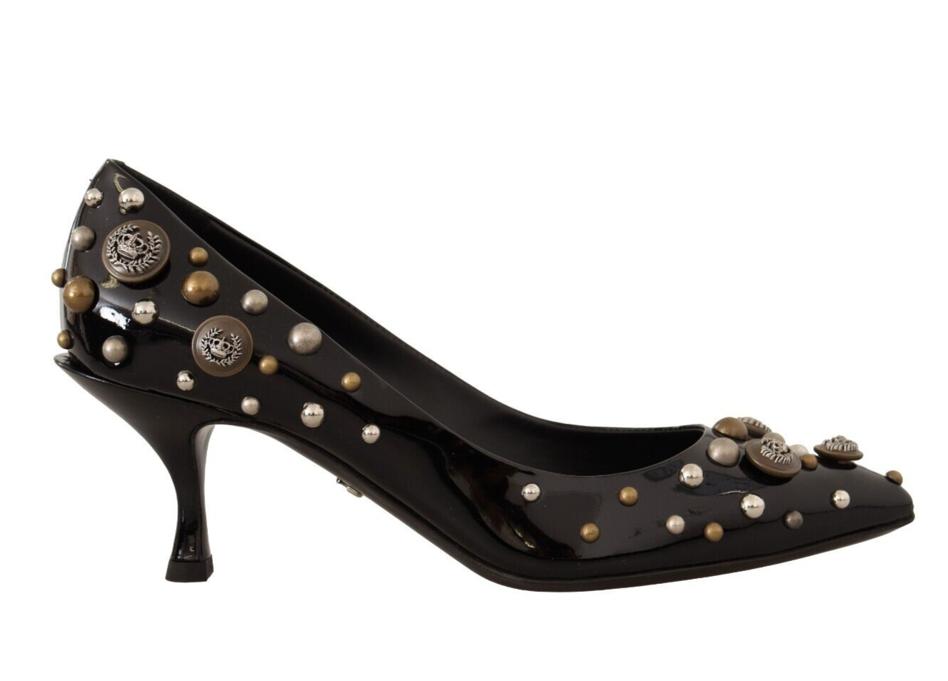 Step into luxury with these stunning new-with-tags, Dolce & Gabbana leather pumps. Adorned with edgy studs, these shoes flaunt a sophisticated mid kitten heel and a sleek pointed toe, perfect for the fashion-forward woman. Crafted from 100% premium leather with a comfortable sole, these pumps offer both remarkable quality and comfort. A subtle logo detail adds a touch of brand prestige to these Italian-made heels.