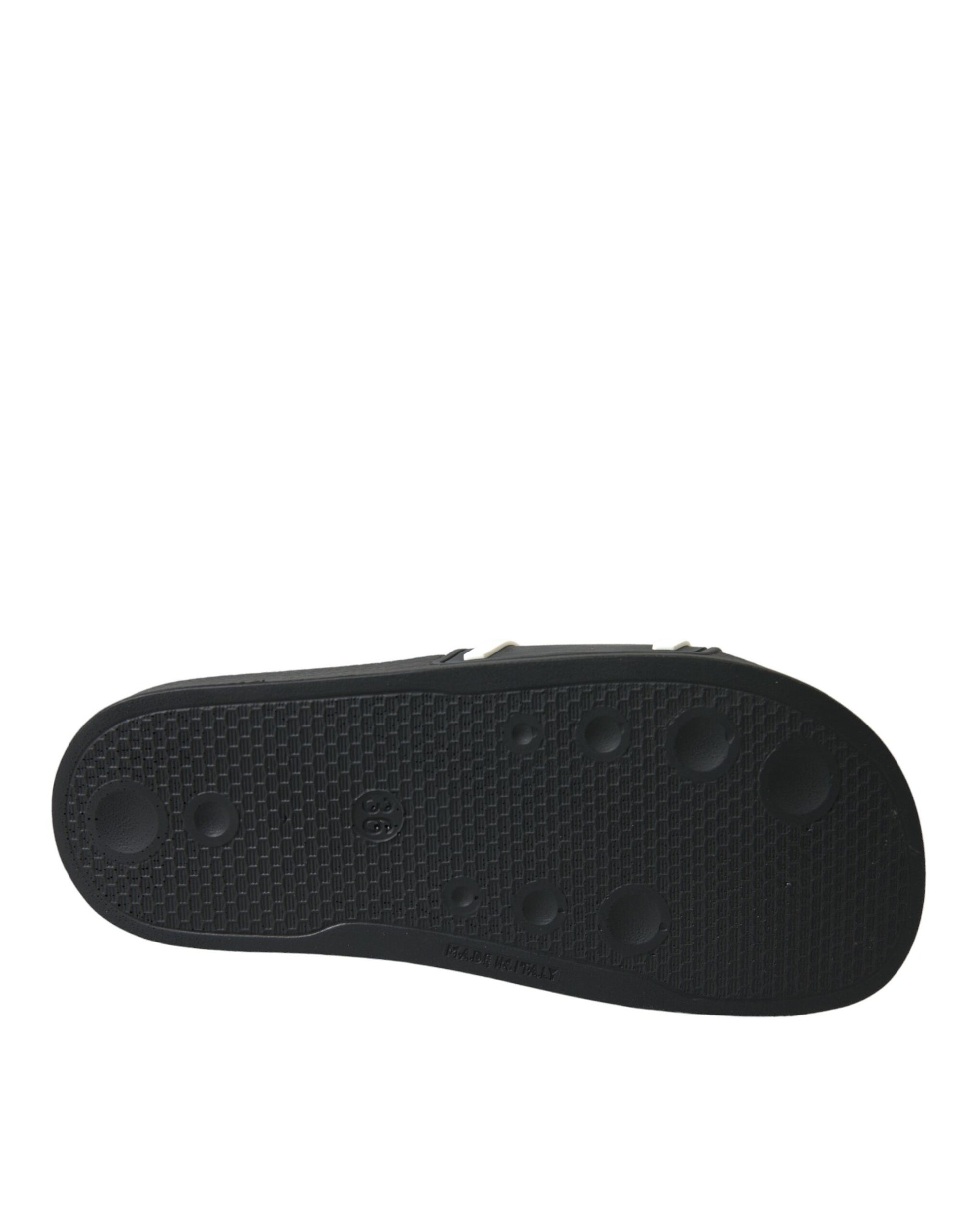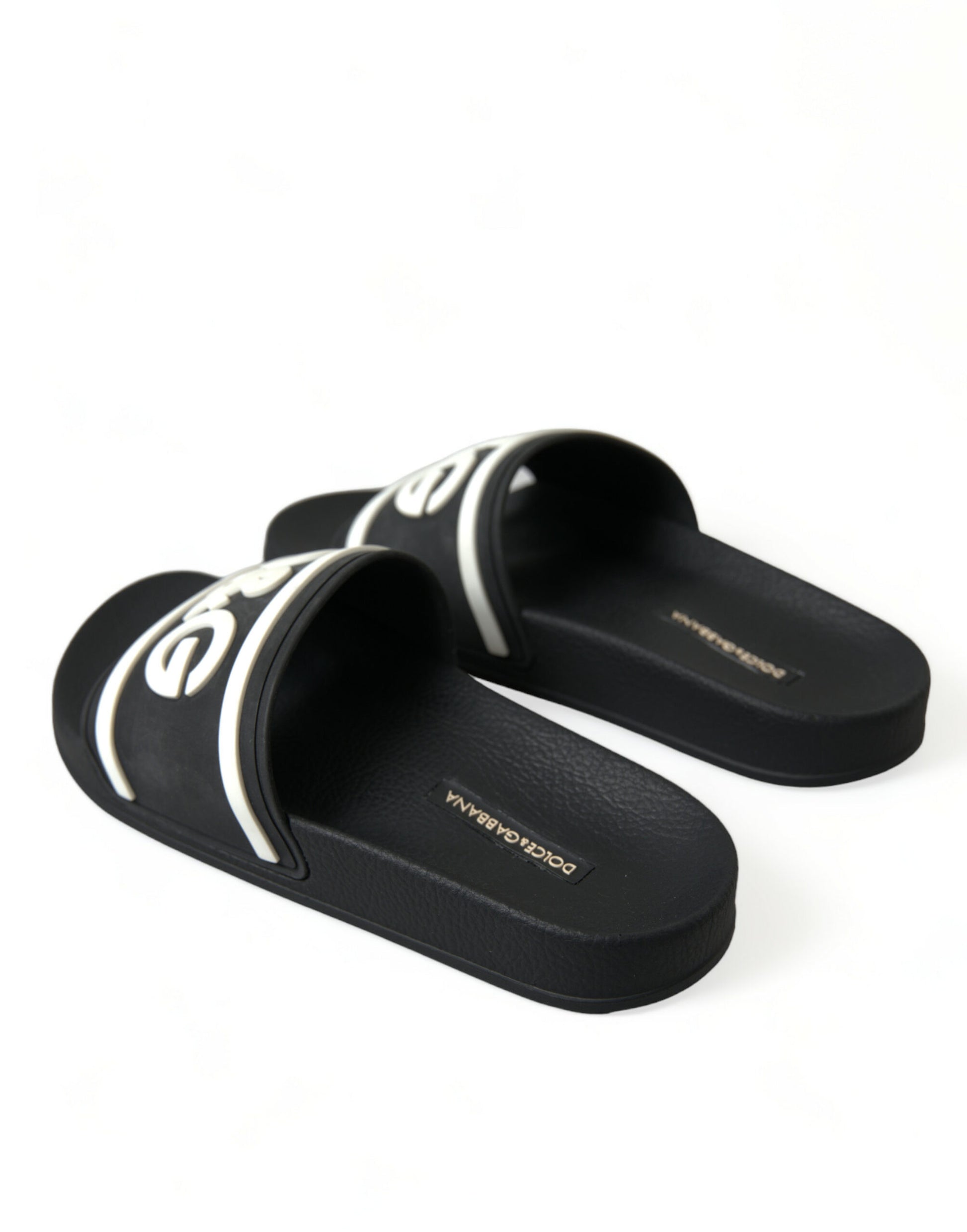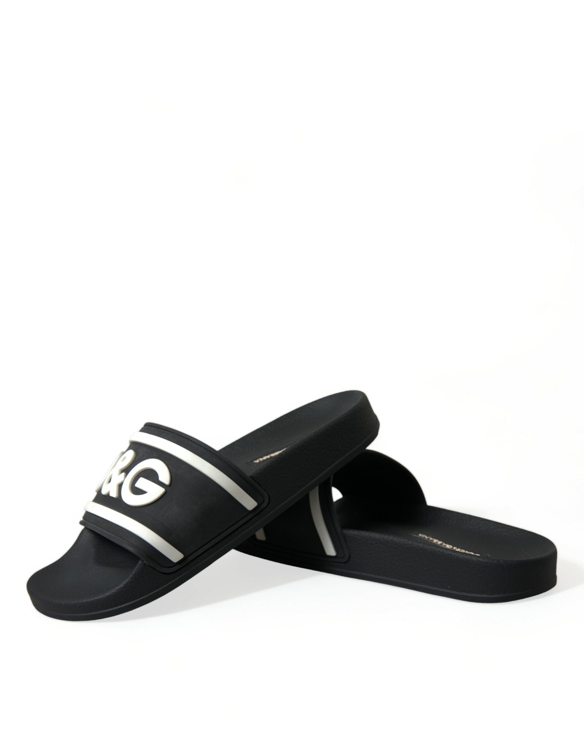 Step into pure elegance with these chic slides by Dolce & Gabbana. Crafted with a dedication to luxury and comfort, these slides are more than just footwear—they’re a fashion statement. Flaunting a sleek black and white logo print, they are perfect for those who appreciate the finer details in life. The crafted 100% rubber material ensures durability, while the extra-light rubber soles with embossed Dolce & Gabbana logo lettering provide comfort and style. Made in Italy, these slides embody sophistication and are a must-have for any fashion-forward wardrobe.