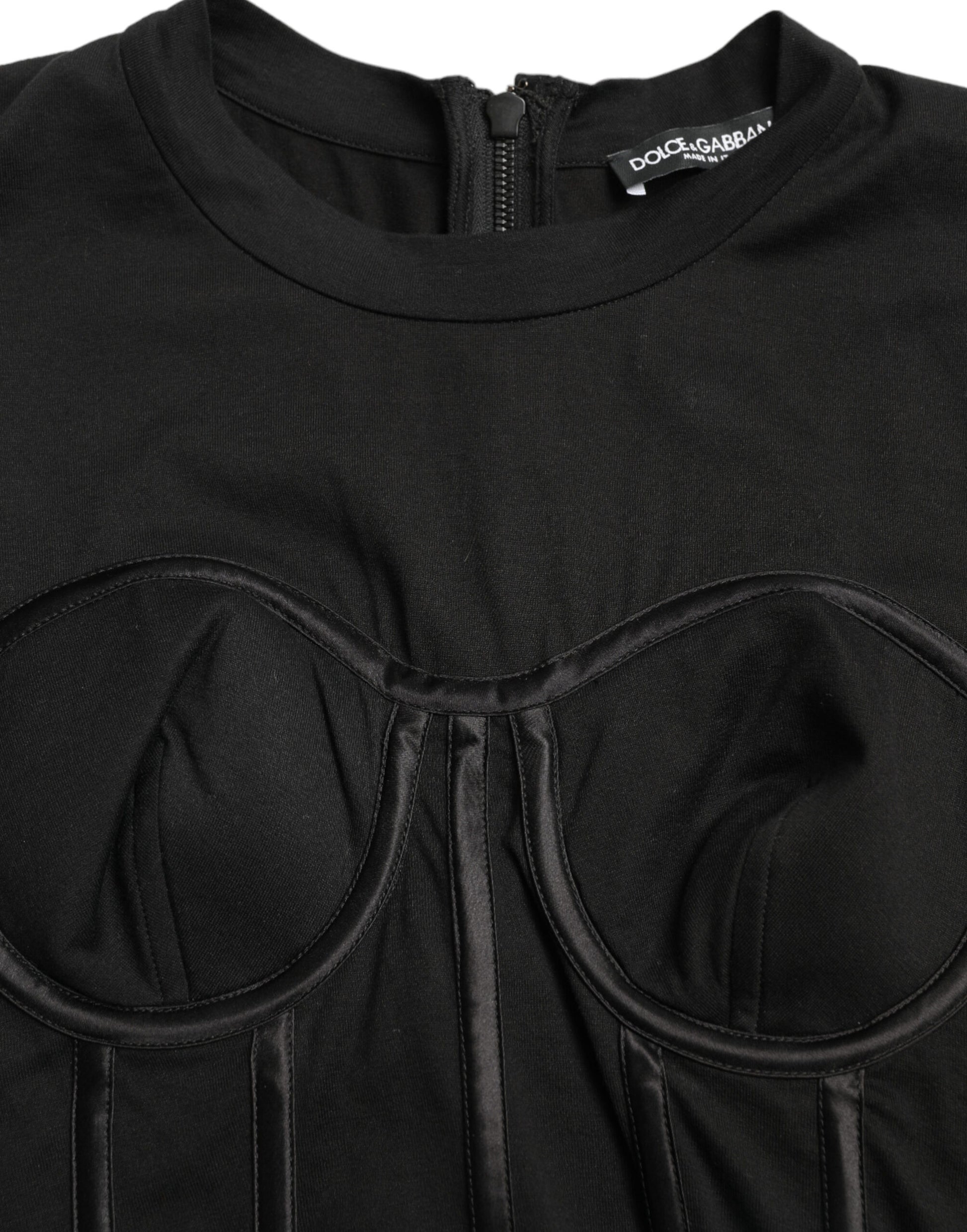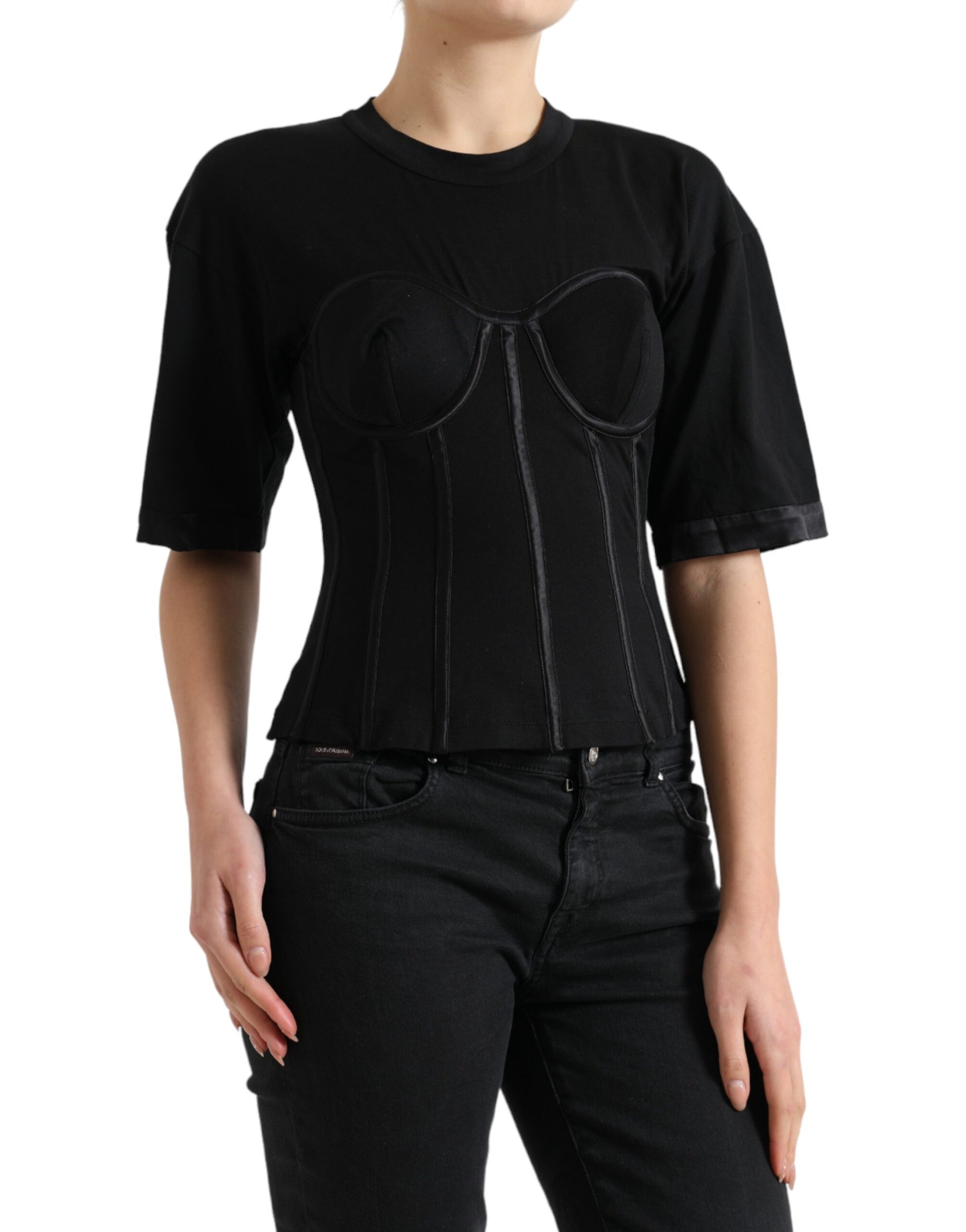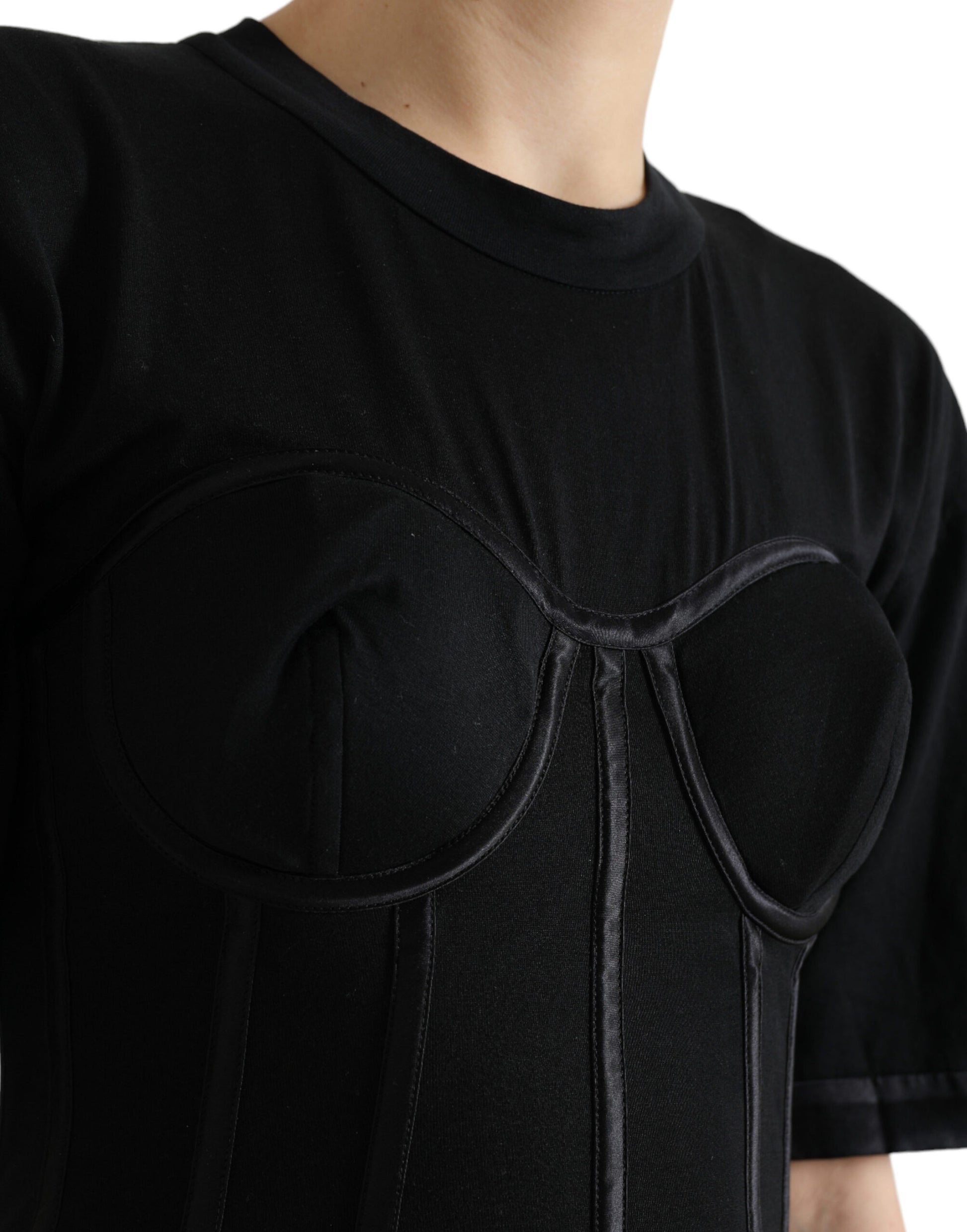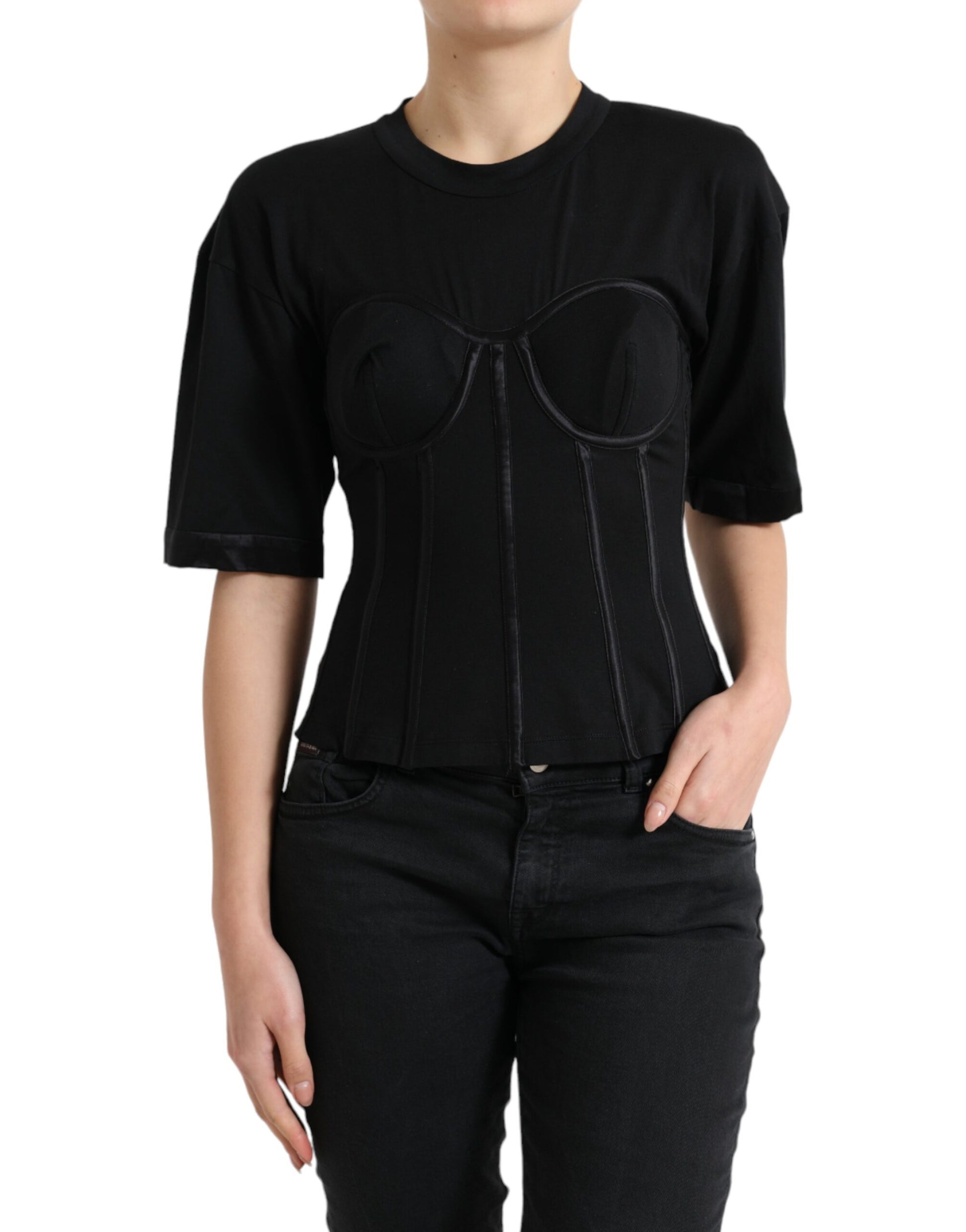Experience the epitome of Italian luxury with this exquisite Dolce & Gabbana bustier t-shirt. Crafted with a blend of high-quality cotton and silk, this piece ensures both comfort and style. The boned bodice with elegant satin trim adds a touch of sophistication, making it perfectly suitable for any upscale occasion. Its sleek black color scheme is versatile and chic, while the back zipper closure ensures a secure and flattering fit. Empower your wardrobe with this gorgeous top that embodies the essence of Dolce & Gabbana’s iconic fashion sense, all while showcasing the perfect balance of form and function.