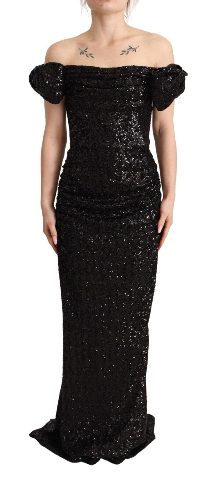 Indulge in the opulence of a Dolce & Gabbana sequined off-shoulder long dress, perfect for making a sophisticated and sparkling statement at any high-profile event. This stunning black sheath dress showcases exquisite Italian craftsmanship with intricate sequin detailing, ensuring you shimmer with every step. Featured with a convenient zipper closure on the back, this garment is not just a piece of fashion but a symbol of luxury and exclusivity.