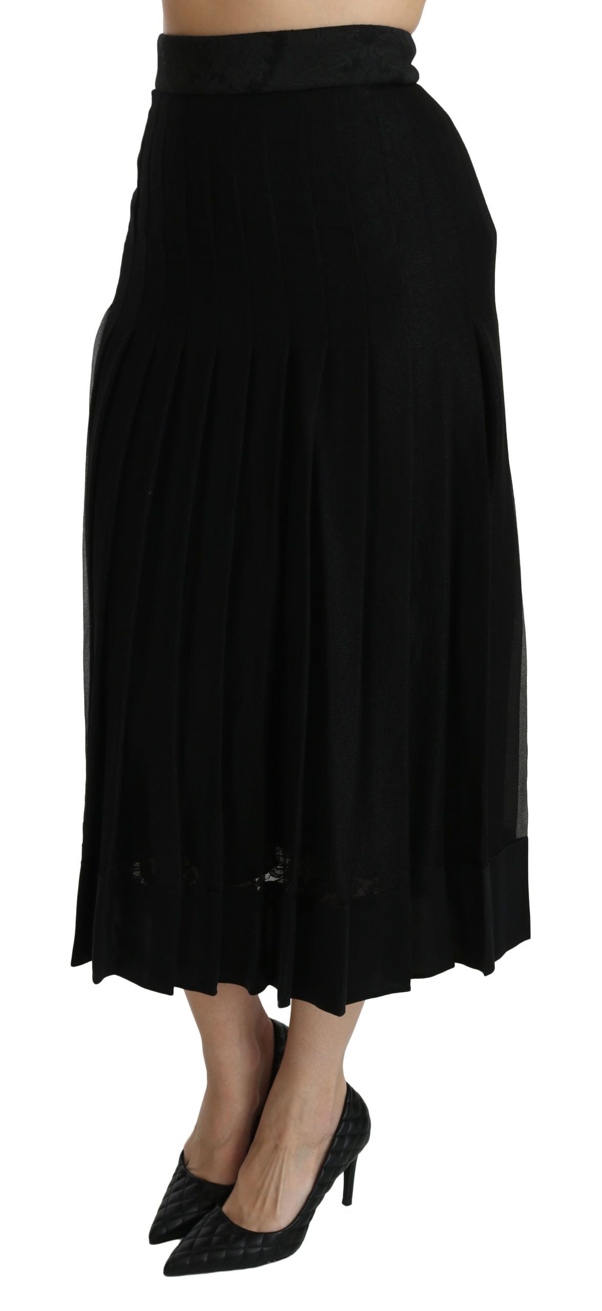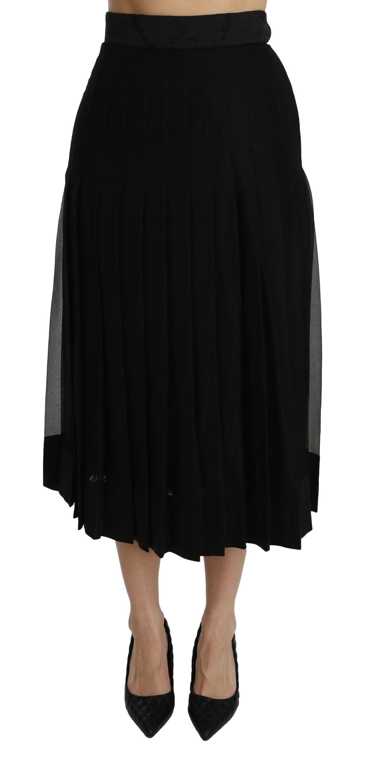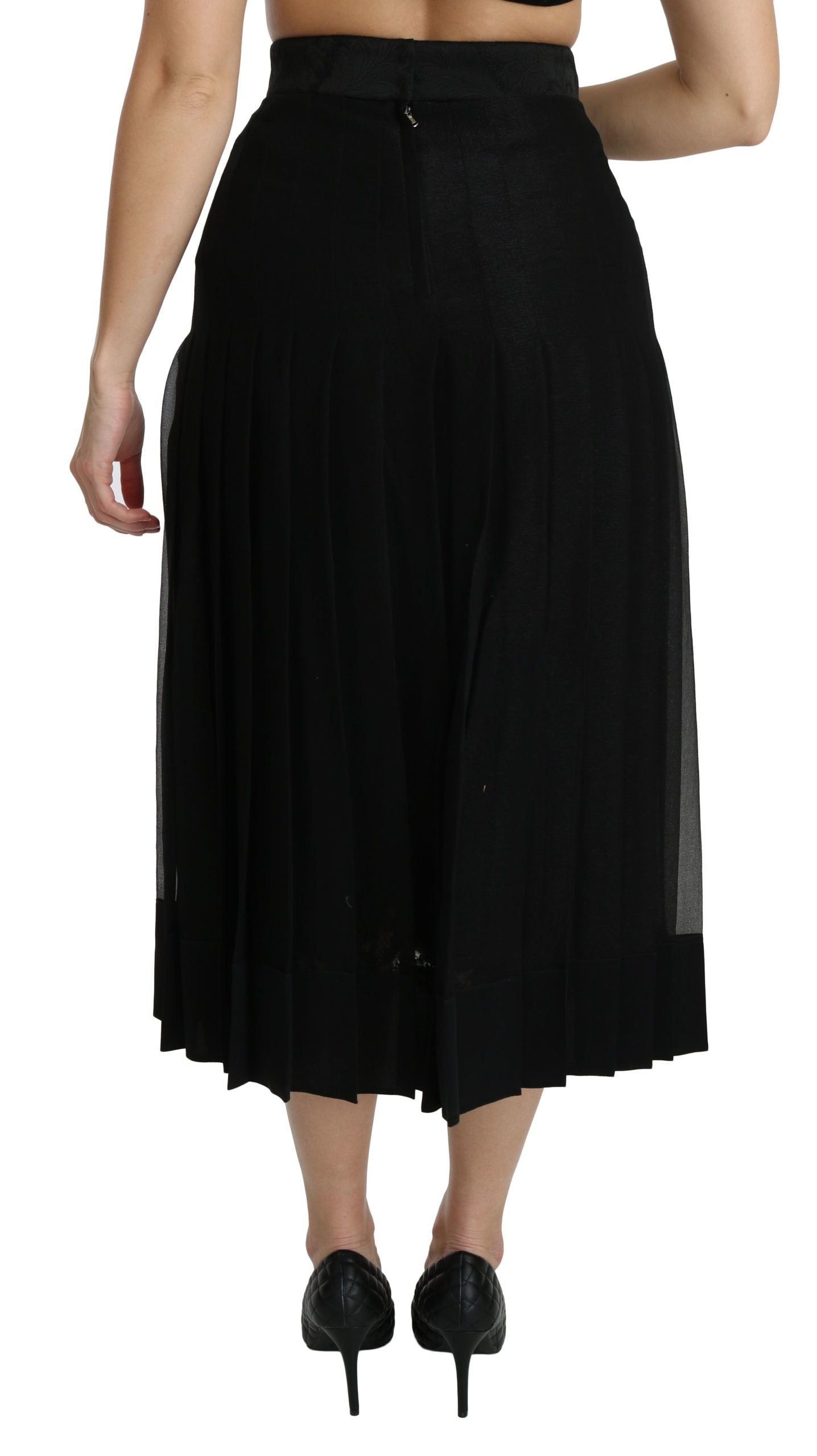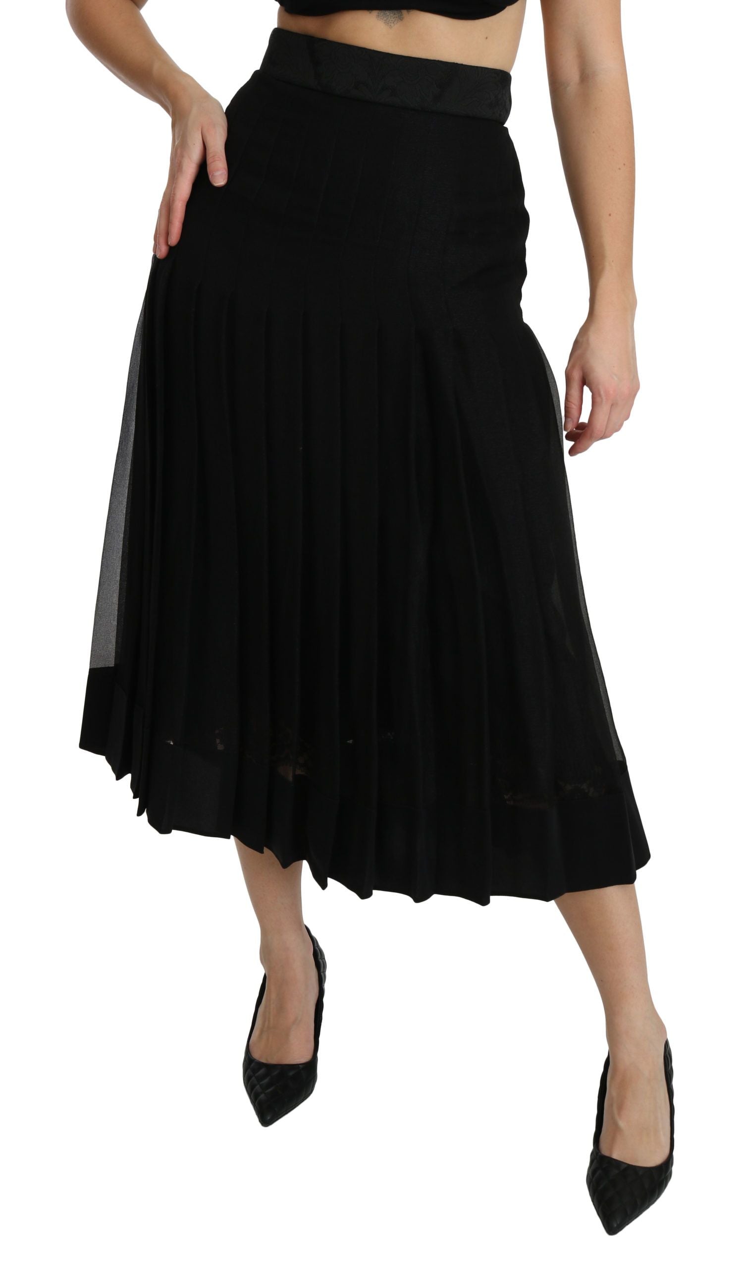 Presenting an exquisite sartorial piece from Dolce & Gabbana – an embodiment of sophistication and timeless elegance. Gorgeous and brand new with tags, this high-waisted, pleated midi skirt is tailored to perfection. Its luxurious black silk blend fabric ensures a flattering drape beneath the knee, making it the perfect accompaniment for your haute couture collection. Designed and crafted in Italy, it epitomizes the brand’s dedication to traditional craftsmanship combined with modern appeal.