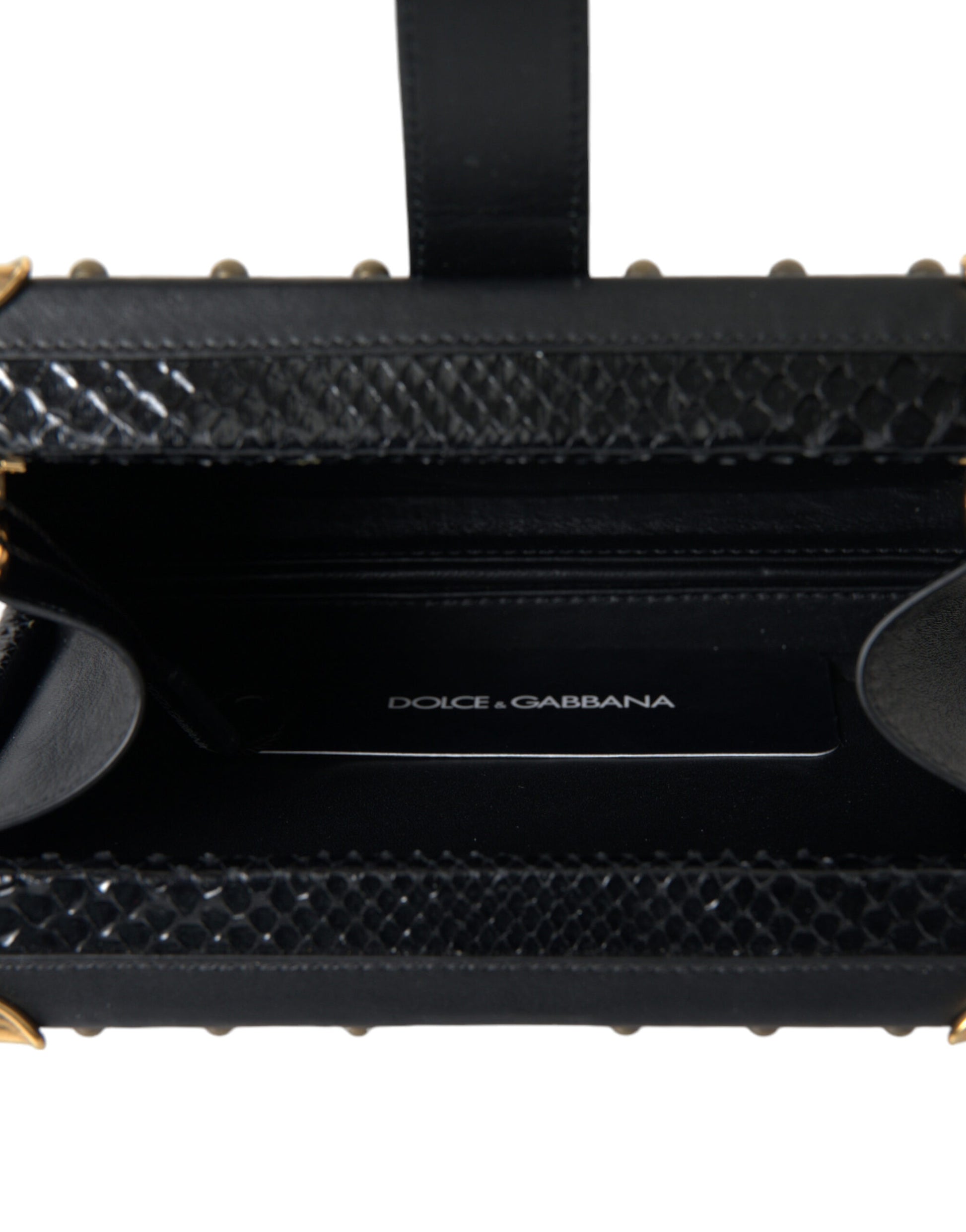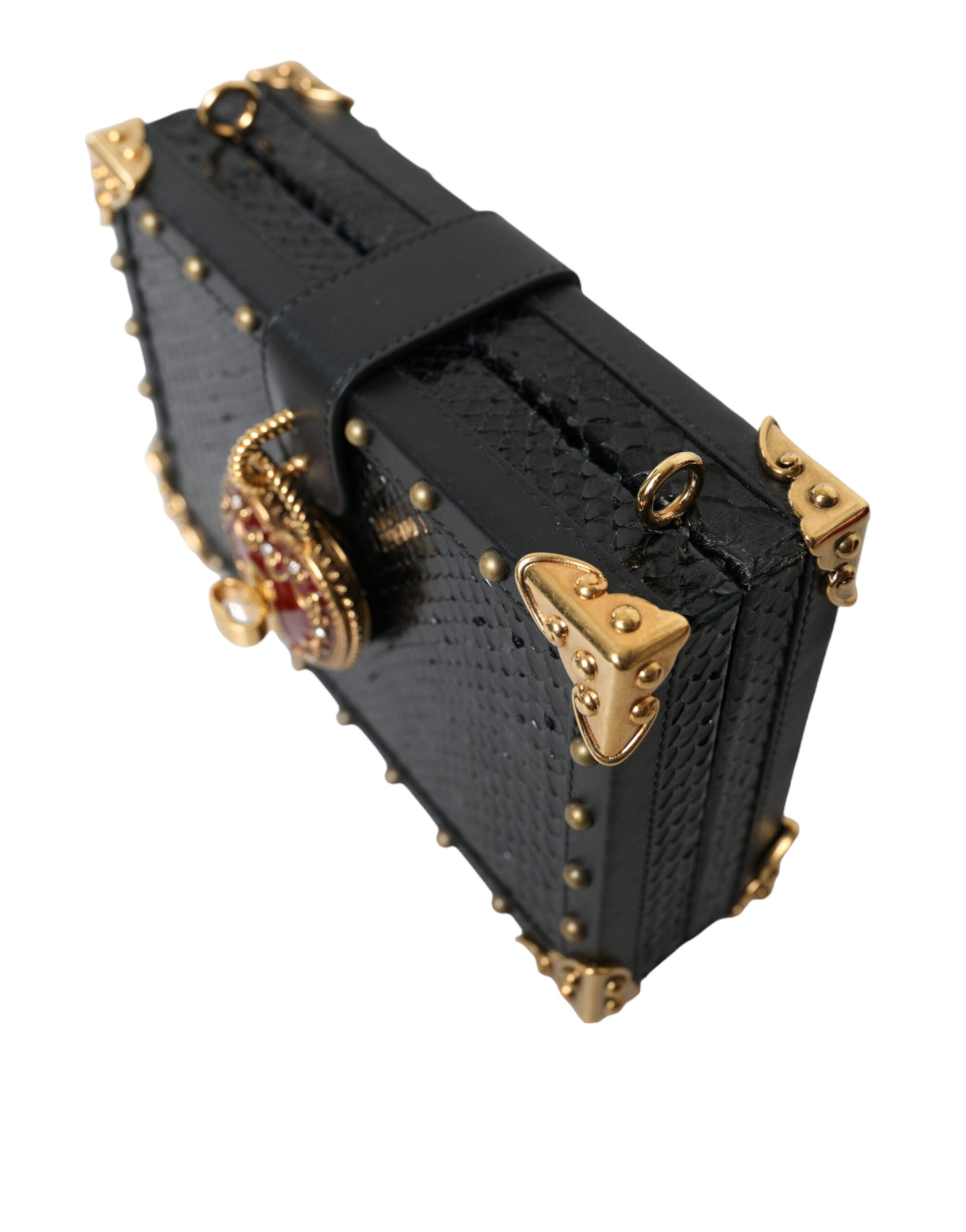 Discover the epitome of luxury with this exquisite box clutch shoulder bag by Dolce & Gabbana. Crafted from premium 100% Ayers leather, this stunning accessory in classic black is complemented by eye-catching gold metal detailing. Its adjustable and detachable shoulder strap offers versatile carriage options to suit any occasion. The bag secures with an elegant padlock closure and features a sleek black inner lining. Proudly made in Italy, this piece is a testament to exceptional craftsmanship and exclusive style.