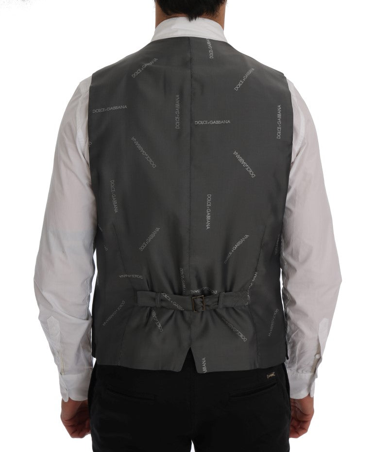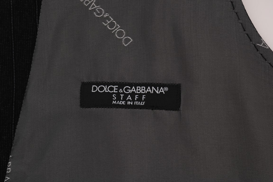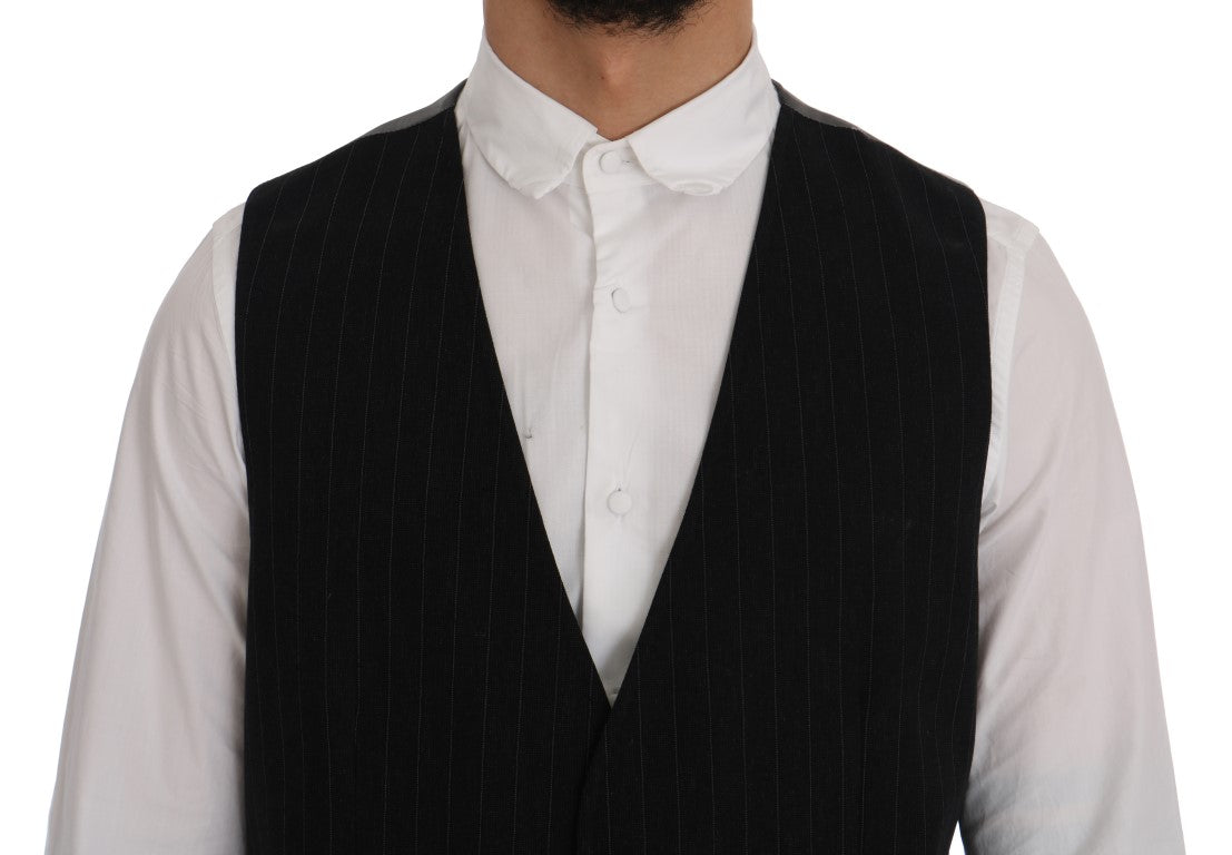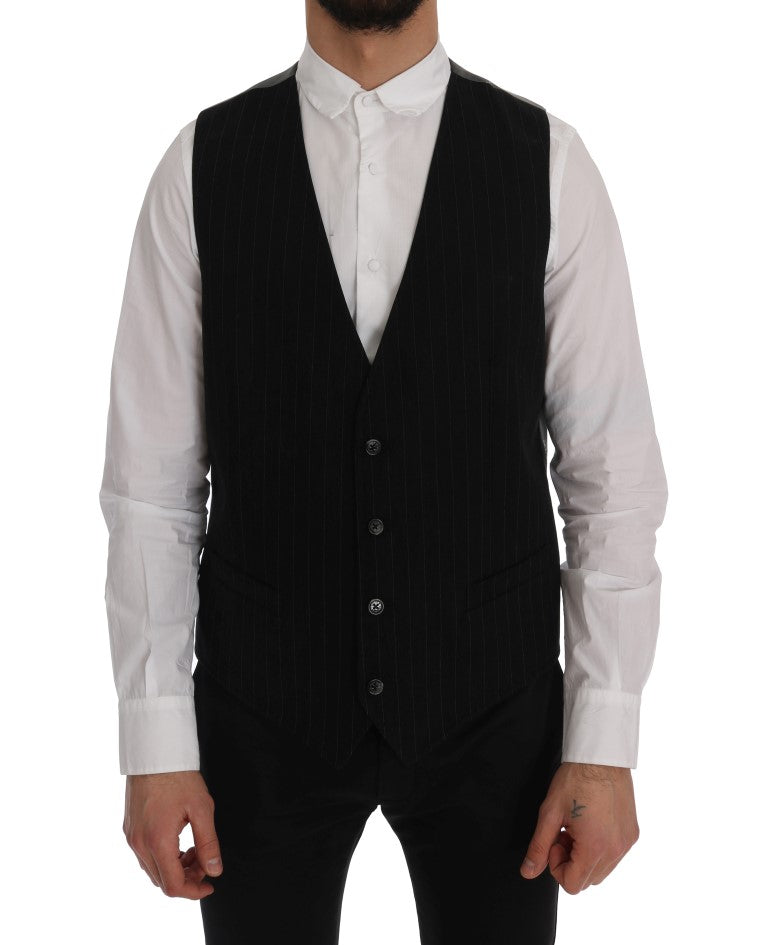 Embrace elegance with this striking striped black waistcoat vest from the luxury house of Dolce & Gabbana. Perfect for adding a touch of sophistication to any ensemble, this single-breasted vest features a classic design with a modern twist, complete with a full front button closure and an adjustable back waist strap. Expertly crafted in Italy, this waistcoat proudly exhibits the brand’s iconic logo details, ensuring authenticity and unparalleled style.