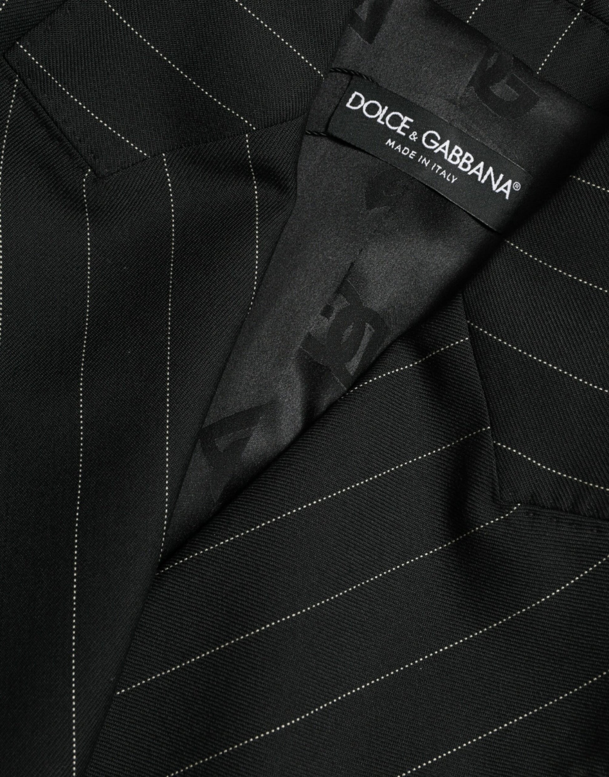 Immerse in the epitome of luxury with this exquisite Dolce & Gabbana blazer. This gorgeous item is not just a piece of clothing, but a statement of refined taste, featuring a striking striped pattern accentuated by peak lapels and a sophisticated double-breasted front button fastening. The pure black hue adds to its versatility, making it a perfect piece for both formal and casual chic ensembles. Tailored to perfection in Italy, this blazer showcases exceptional craftsmanship and an unwavering attention to detail with front pockets and elegant long sleeves. Its luxuriant lining is pure silk, ensuring sublime comfort with a touch of opulence.