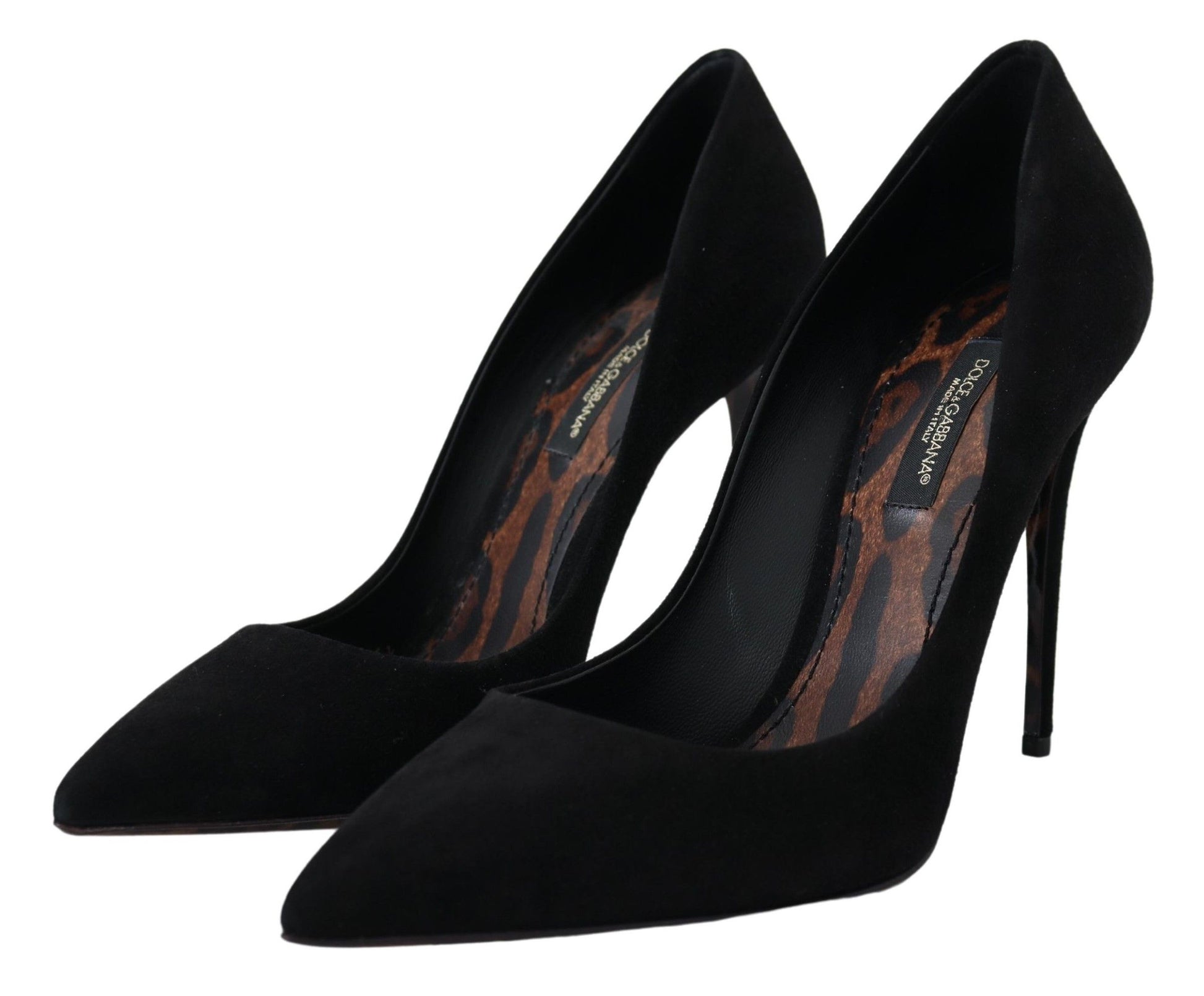 Indulge in the epitome of sophistication with these exquisite stiletto heels from Dolce & Gabbana. Gorgeous and brand new with tags, these pumps are fashioned from luxurious 100% suede leather, offering a chic addition to any ensemble. Designed to elevate your style, the shoes feature a classic black hue complemented by a striking brown leopard print on both the inner and outer sole for an unexpected twist. A leather bottom sole and subtle logo details carve out an exclusive look. Expert craftsmanship from Italy ensures each step you take is in pure elegance.