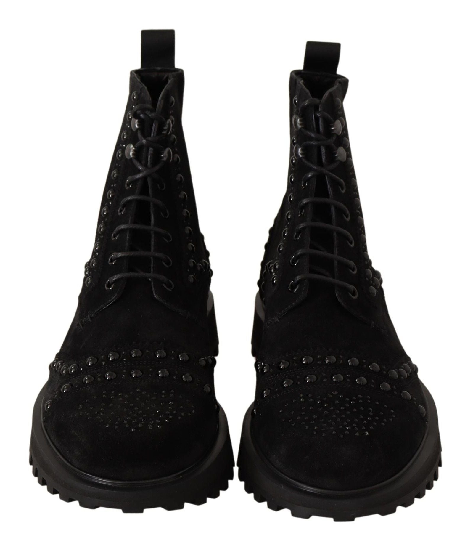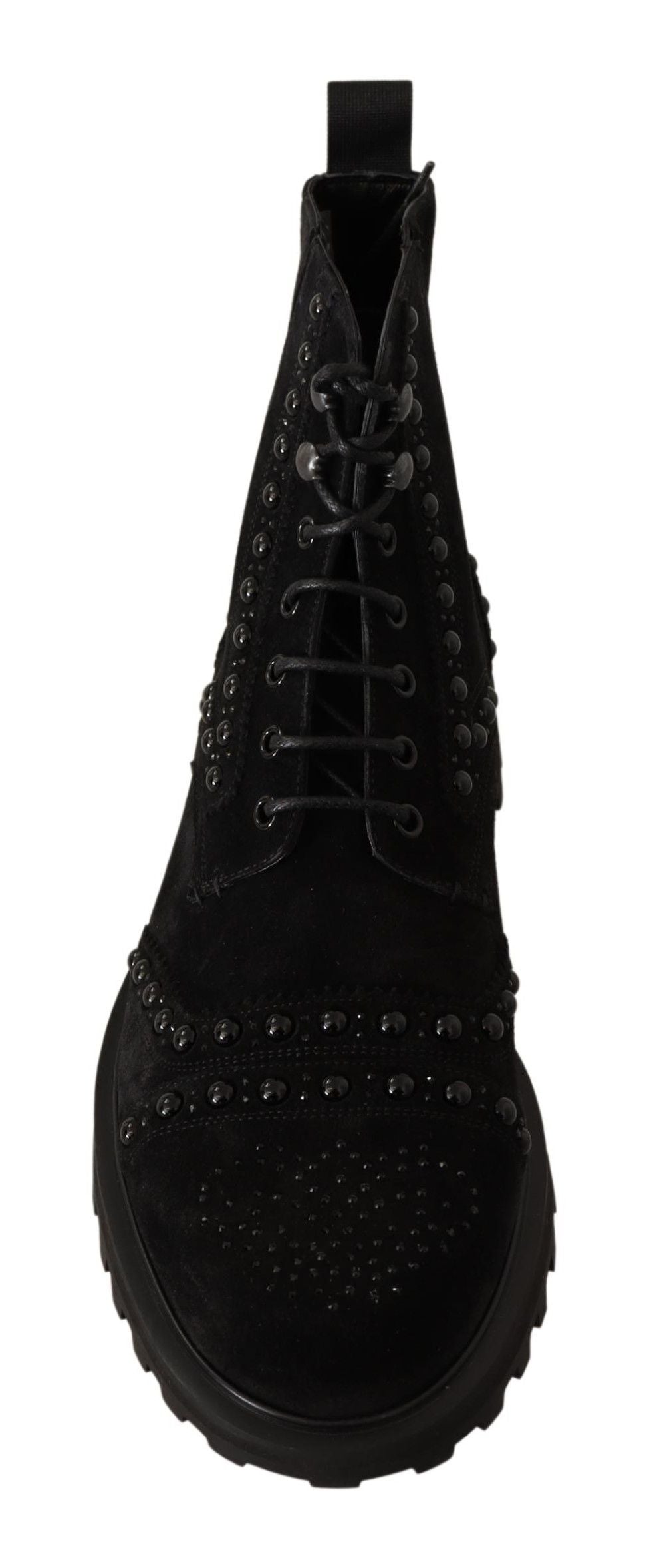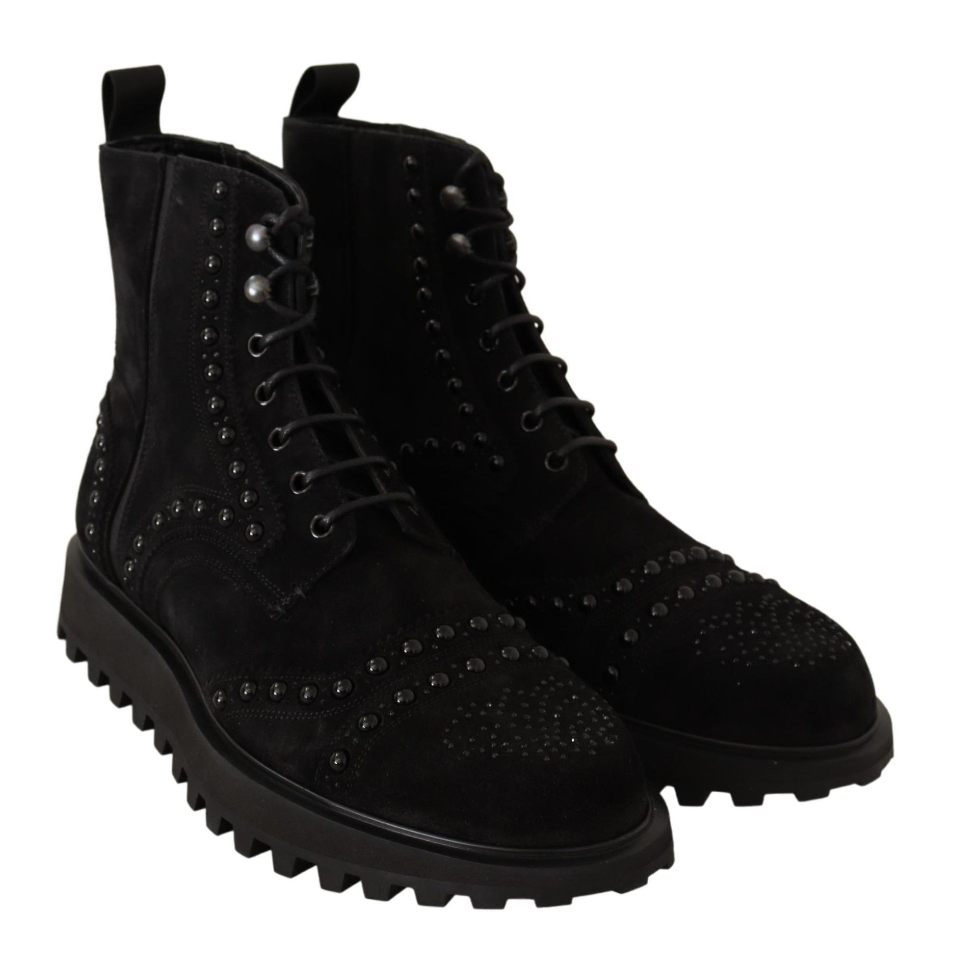 Indulge in the epitome of luxury and refinement with these exquisite Studded Suede Ankle Boots from Dolce & Gabbana. Boasting a sleek black color and intricately embellished with metal studs, these lace-up boots are a testament to high craftsmanship. Made in Italy, they are perfect for those who appreciate footwear that marries style with exceptional quality.