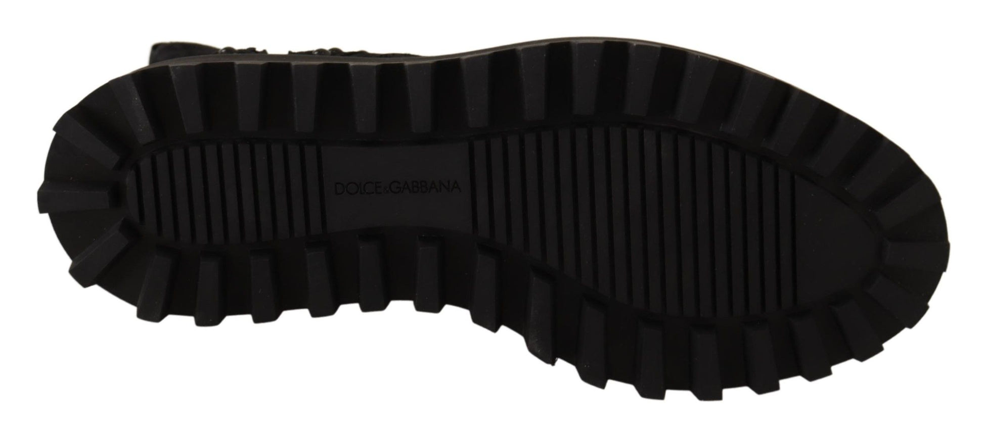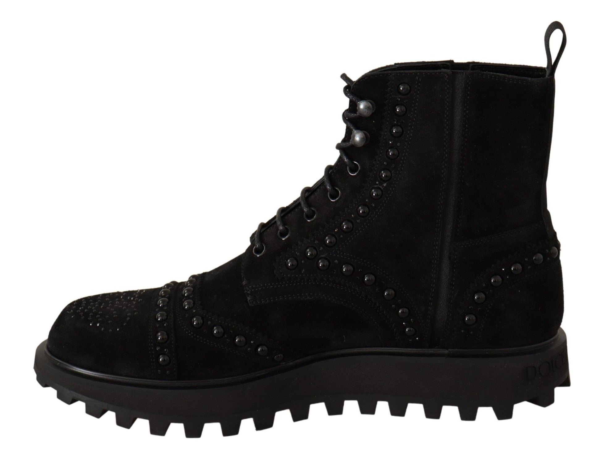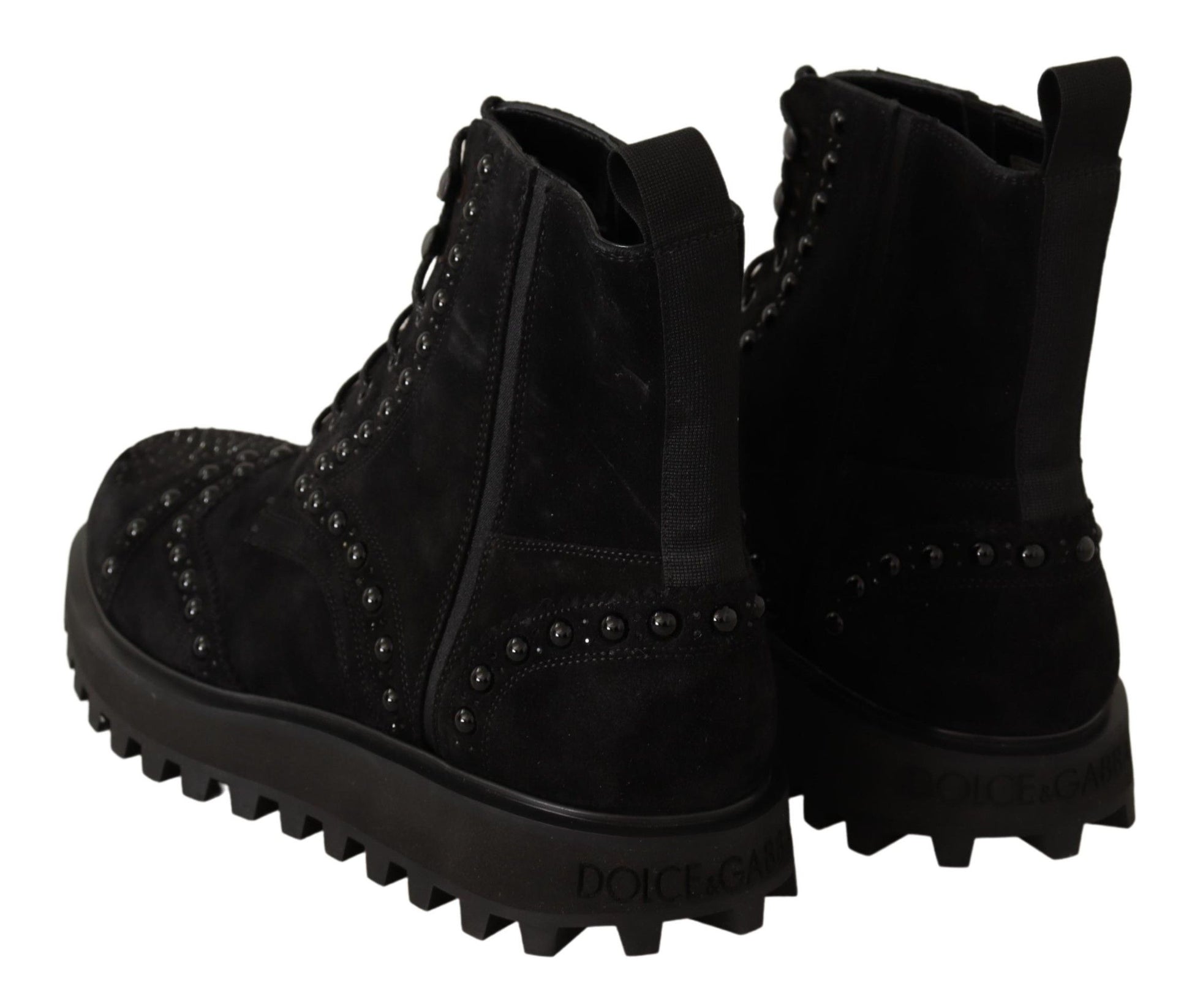 Indulge in the epitome of luxury and refinement with these exquisite Studded Suede Ankle Boots from Dolce & Gabbana. Boasting a sleek black color and intricately embellished with metal studs, these lace-up boots are a testament to high craftsmanship. Made in Italy, they are perfect for those who appreciate footwear that marries style with exceptional quality.