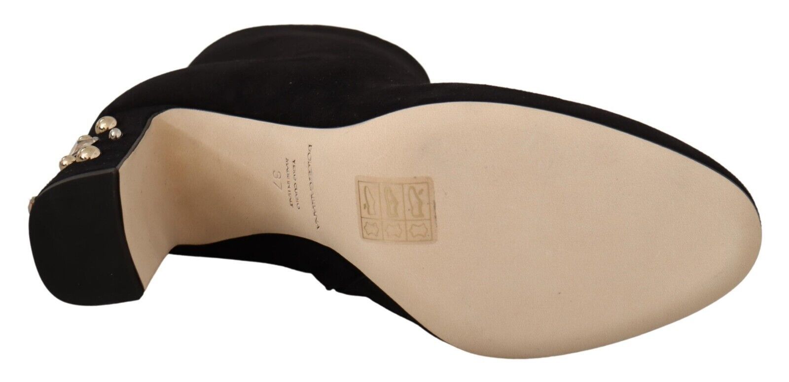 Embrace the luxury and sophistication of Dolce & Gabbana with our stunning suede ankle boots adorned with sparkling crystal embellishments. These brand new boots come with tags, ensuring their authenticity and unparalleled quality. Crafted from premium leather suede, these boots feature a comfortable leather sole and a convenient side zipper opening for ease of wear. With exquisite logo details, they are not only a style statement but also a testament to Italian craftsmanship and comfort.