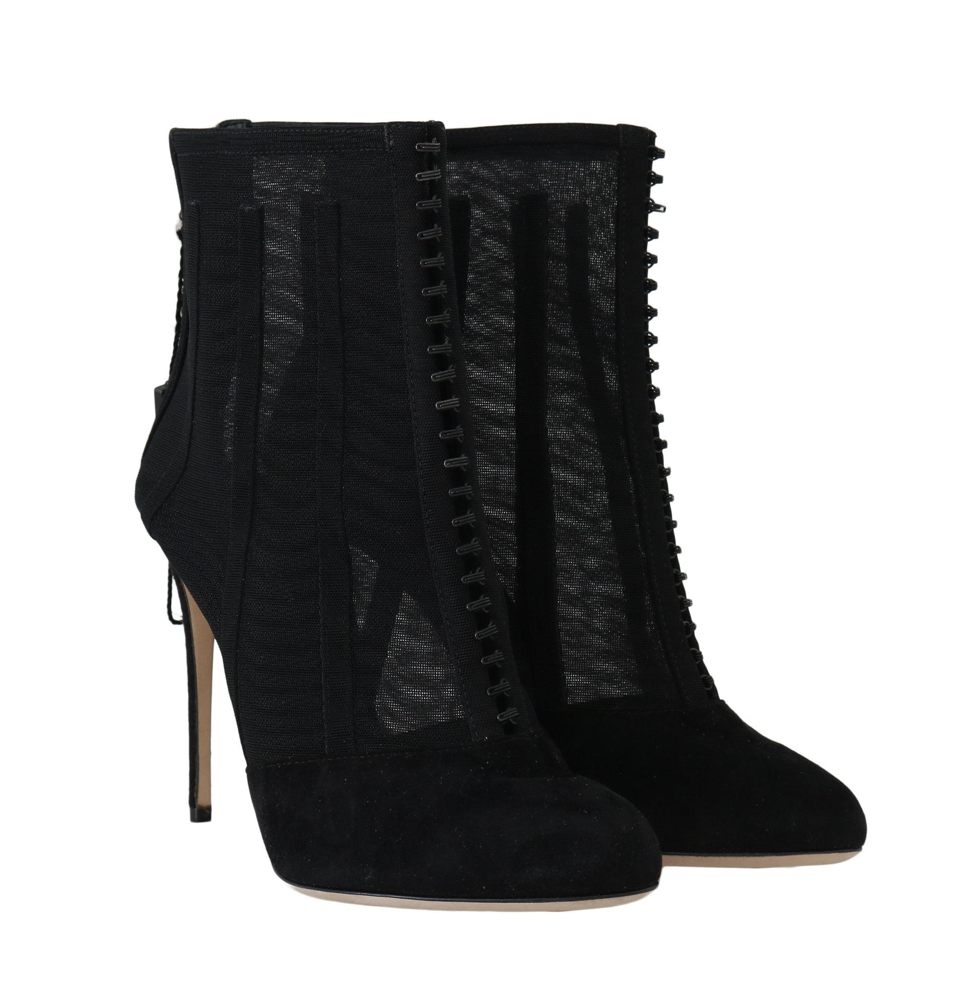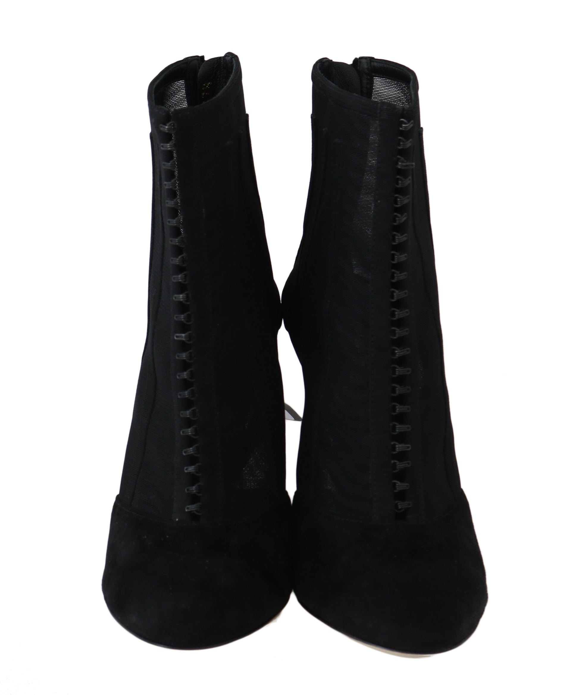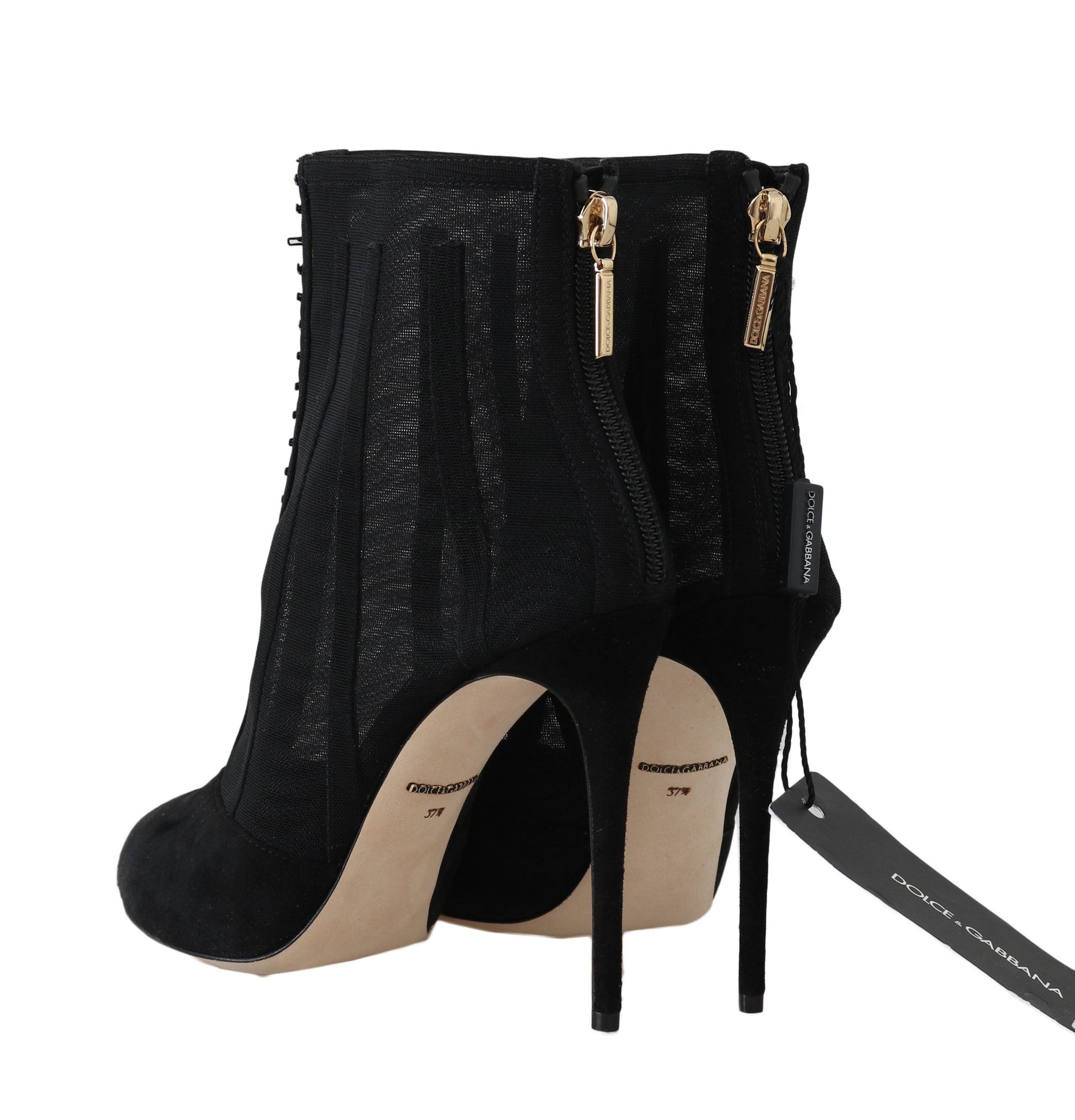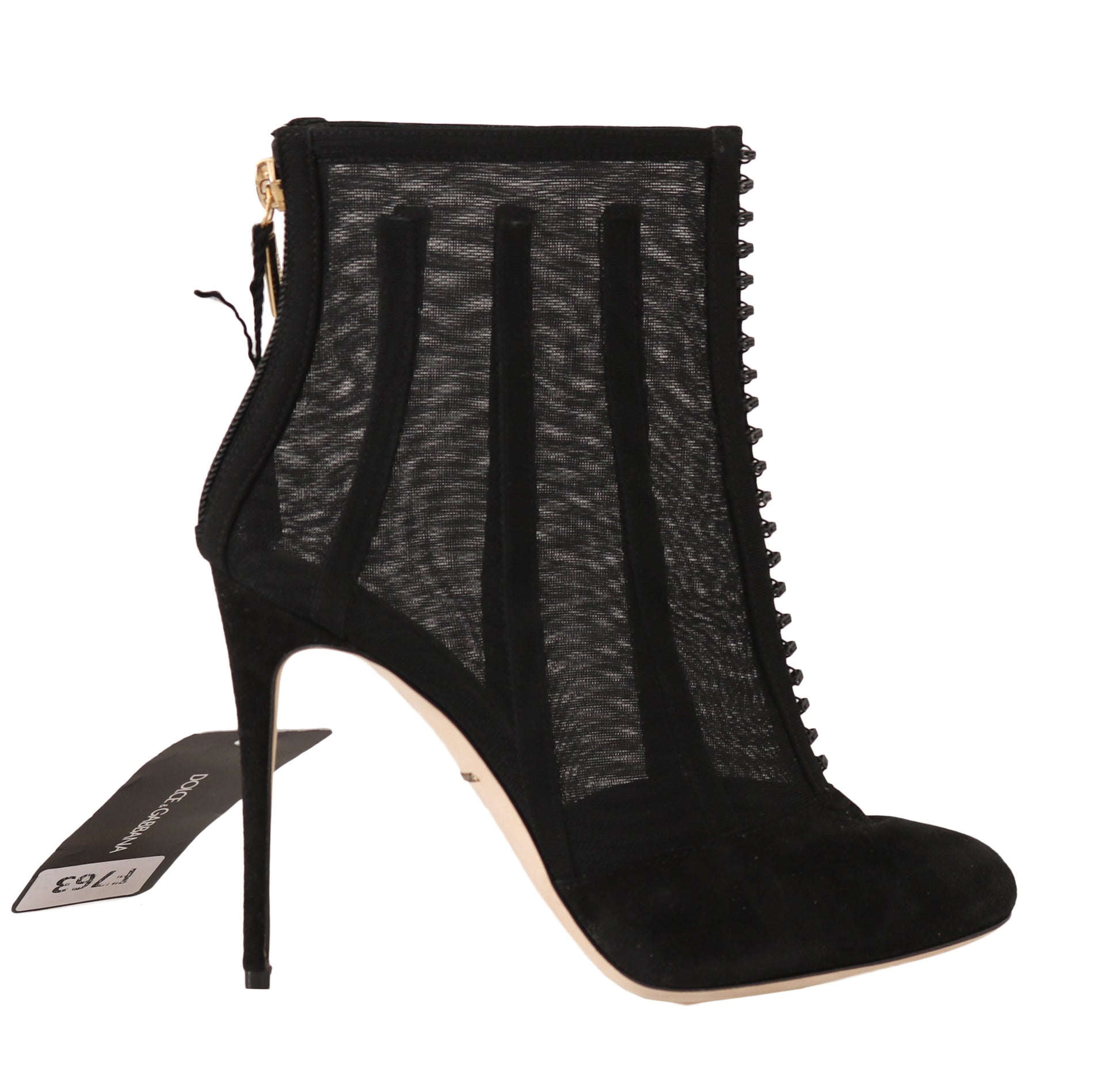Indulge in Italian craftsmanship with these striking, brand new, 100% Authentic Dolce & Gabbana ankle booties. Meticulously crafted with a blend of transparent tulle and sumptuous suede leather, these stiletto heel boots exude sophistication in a timeless black color. Adorned with the brand’s signature logo details, they promise both high quality and comfort, perfect for elevating any ensemble.